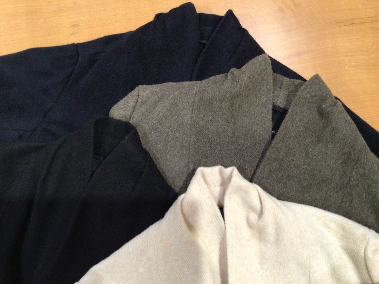 ウール素材を縮絨する事で毛足の長い繊維が絡まって密度が高くなる。そうする事により風を通さず軽く暖かい素材になります。