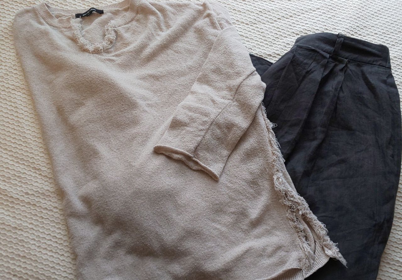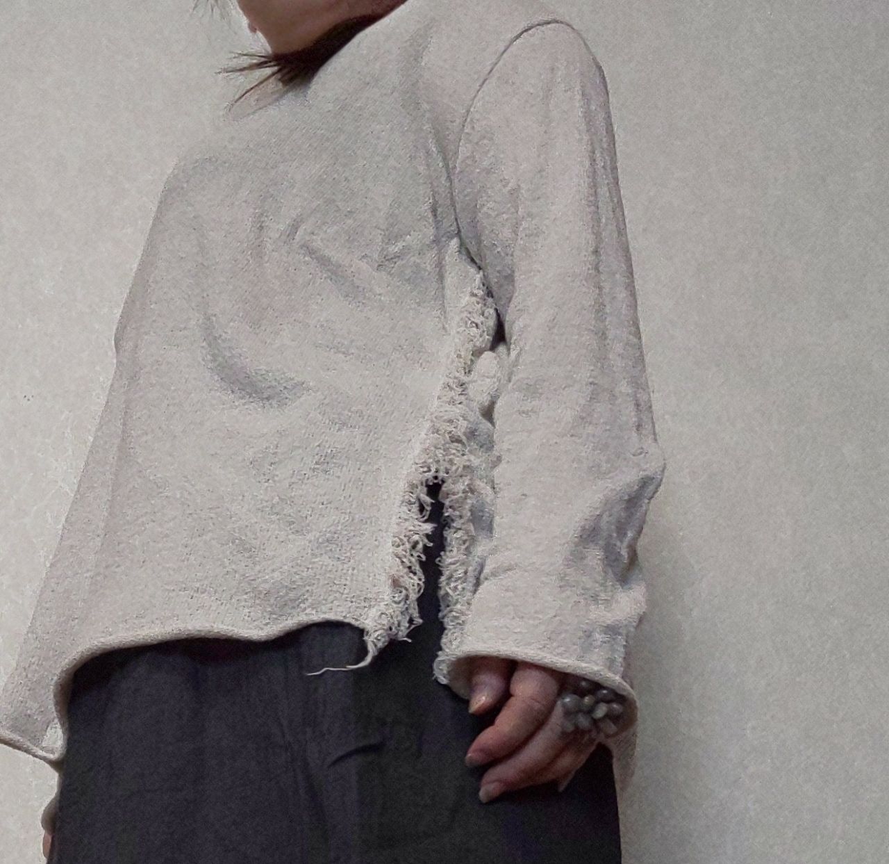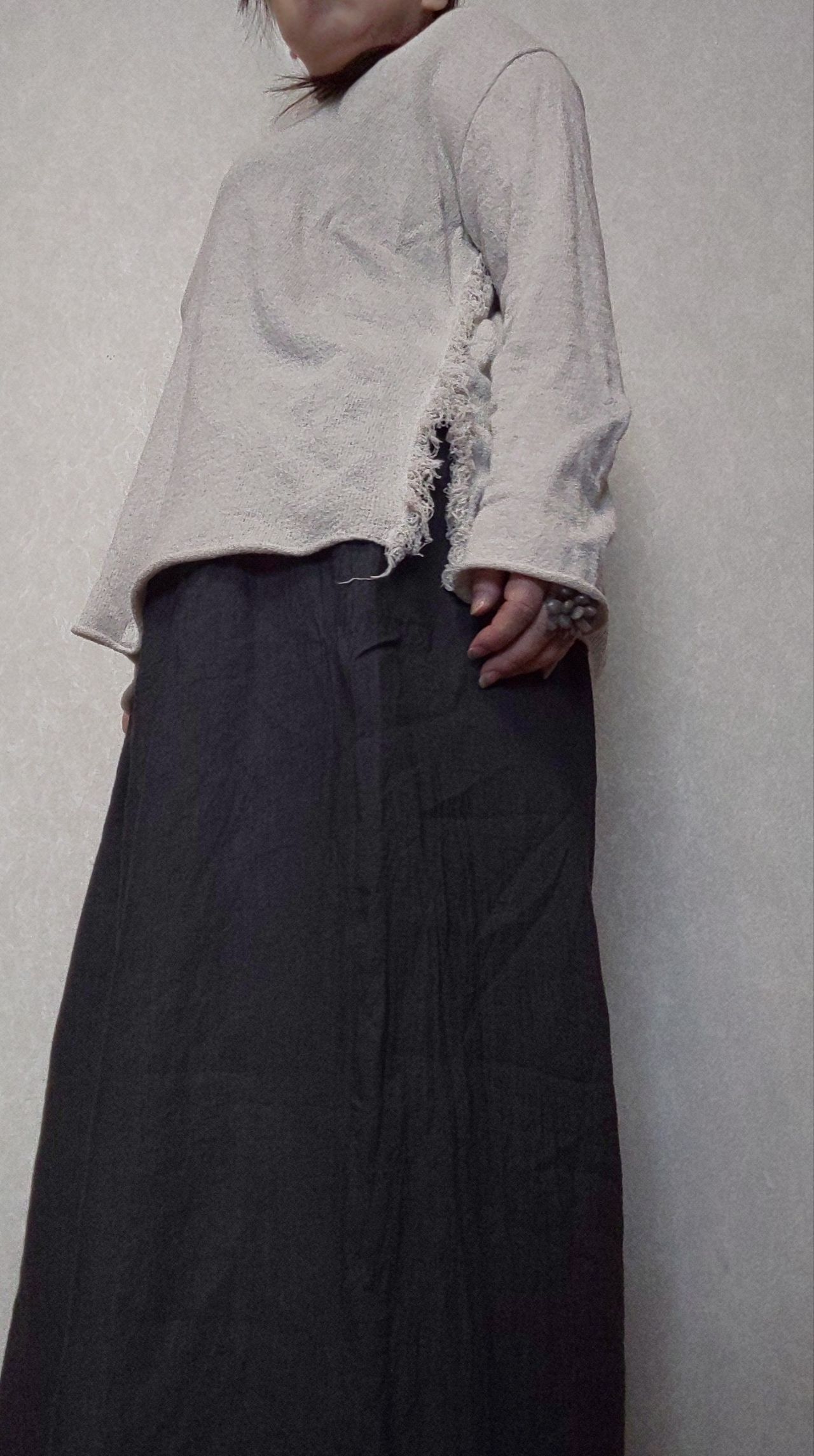 Vネックとスリット部分にはフリンジのデザインポイントがあり一枚で決まるのでお気に入りなのですが、私がなによりも気に入っているのは、ループ状のコットンブークレ糸とコットン・リネン糸を使い、軽さと部屋の中でも爽やかな通気性を兼ね備えていること。