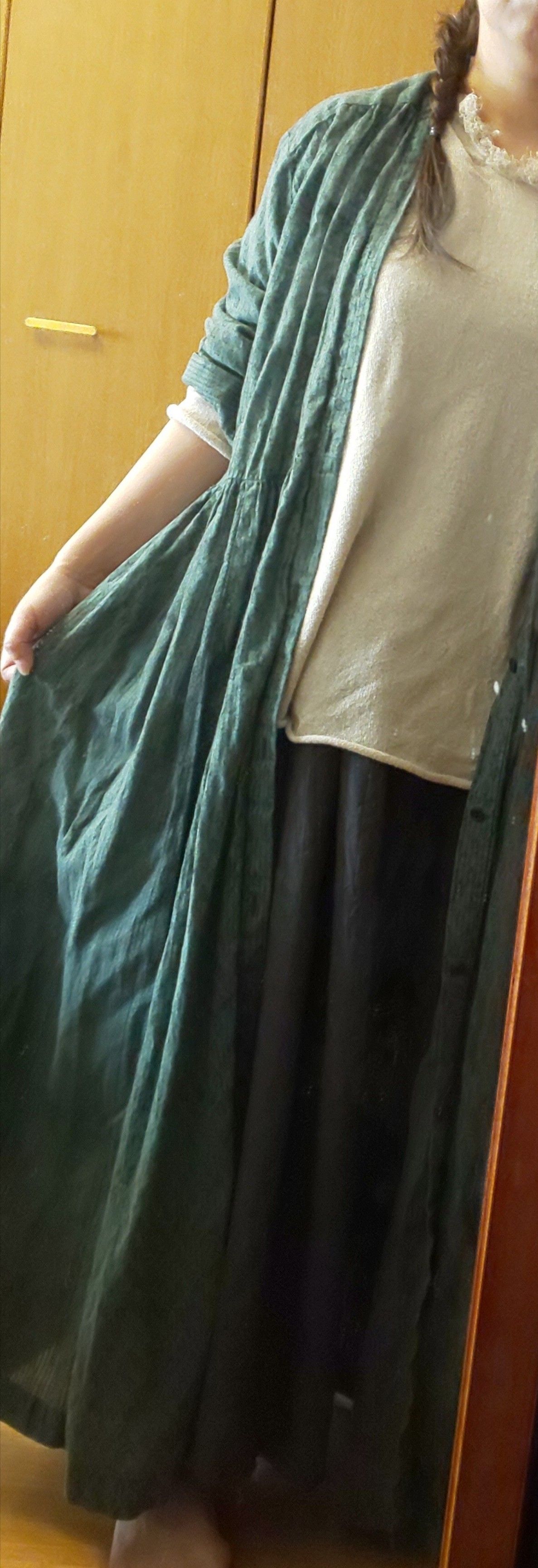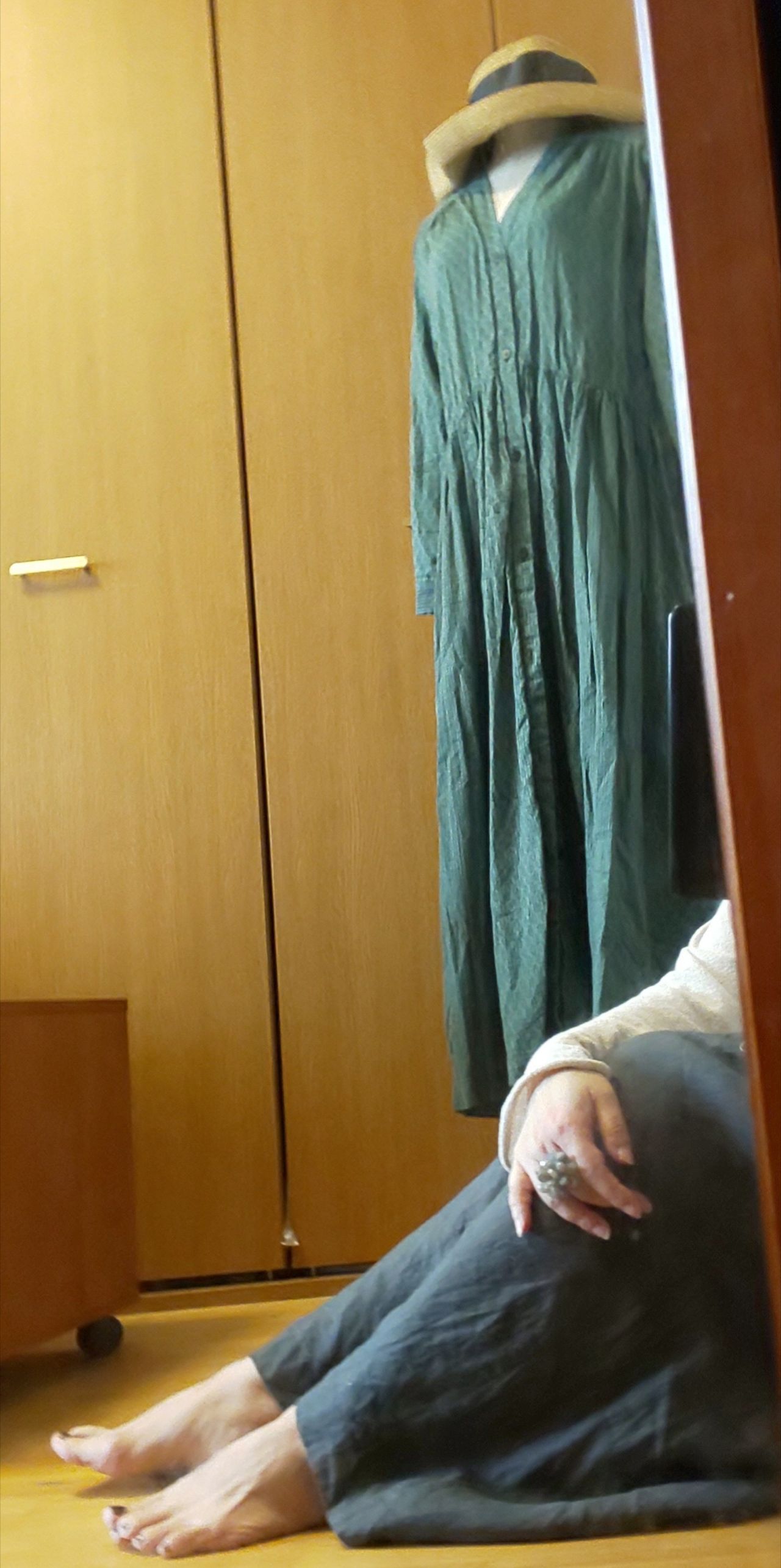お買い物に行くときはアーカイブ商品の、インドブロックプリントのワンピースを羽織りとして。初挑戦したグリーンでしたが、新緑の季節にぴったり。さらっとした生地感でとても着やすく今では私のお気に入りの一枚になりました。
