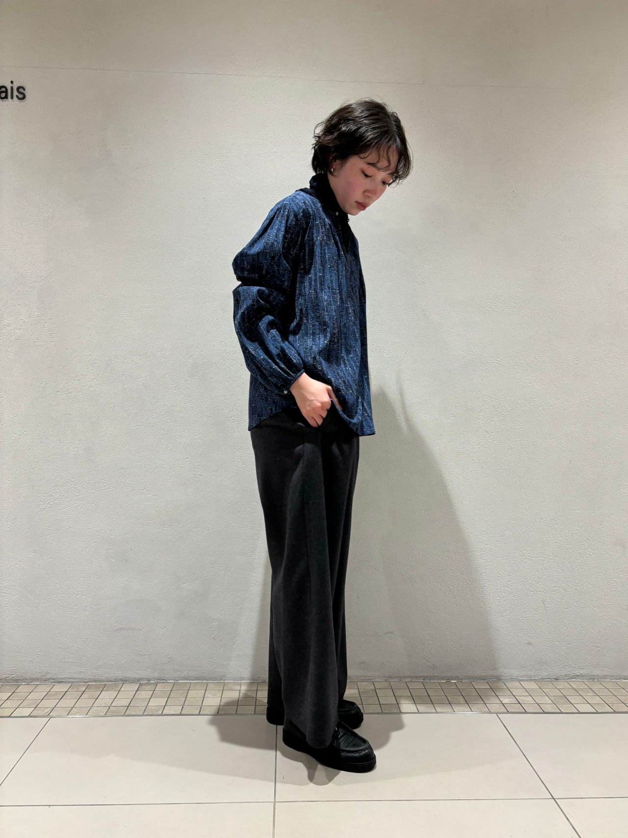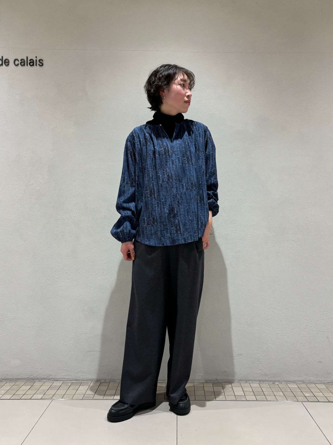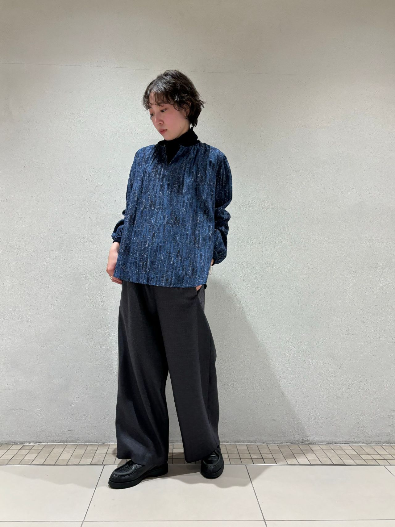 絹に似た光沢感のあるレーヨン100%の素材とウールのサキソニー素材のパンツを合わせ、スラリとしたシルエットに。