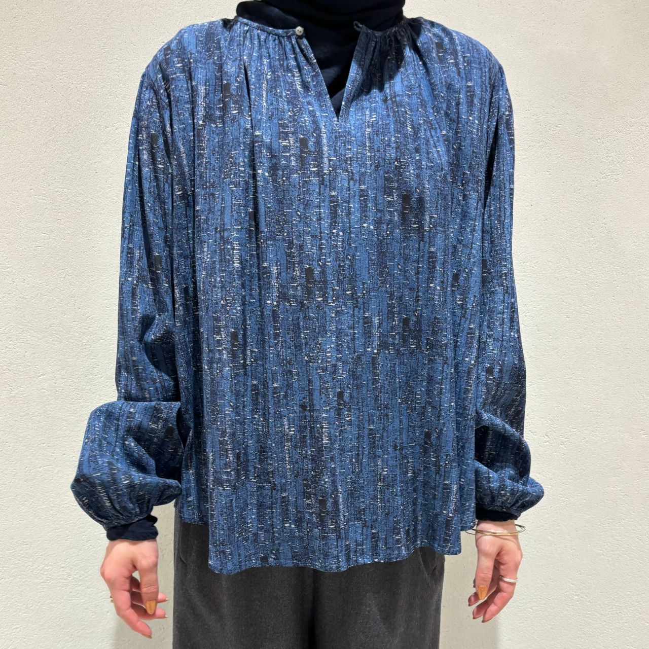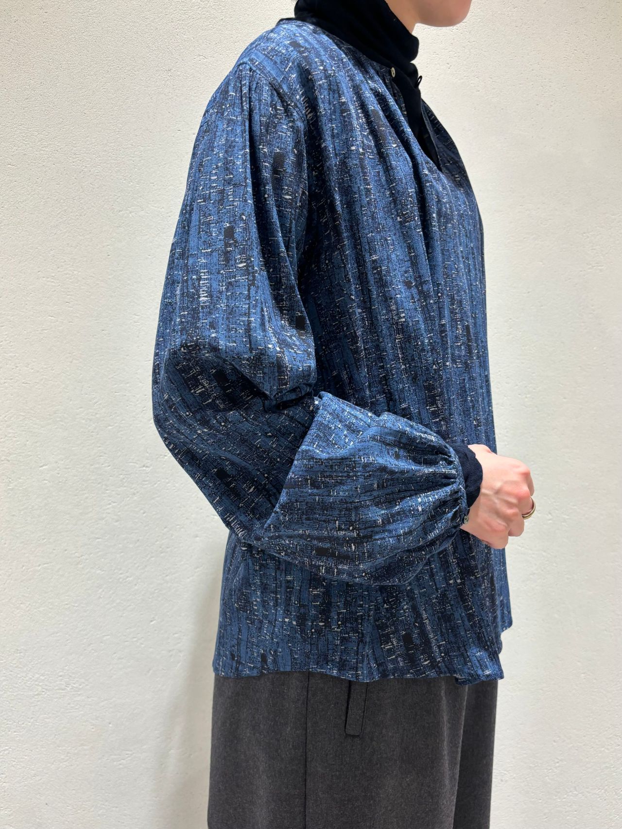 襟元と袖口にギャザーがたっぷり入った上品なノーカラーブラウス。