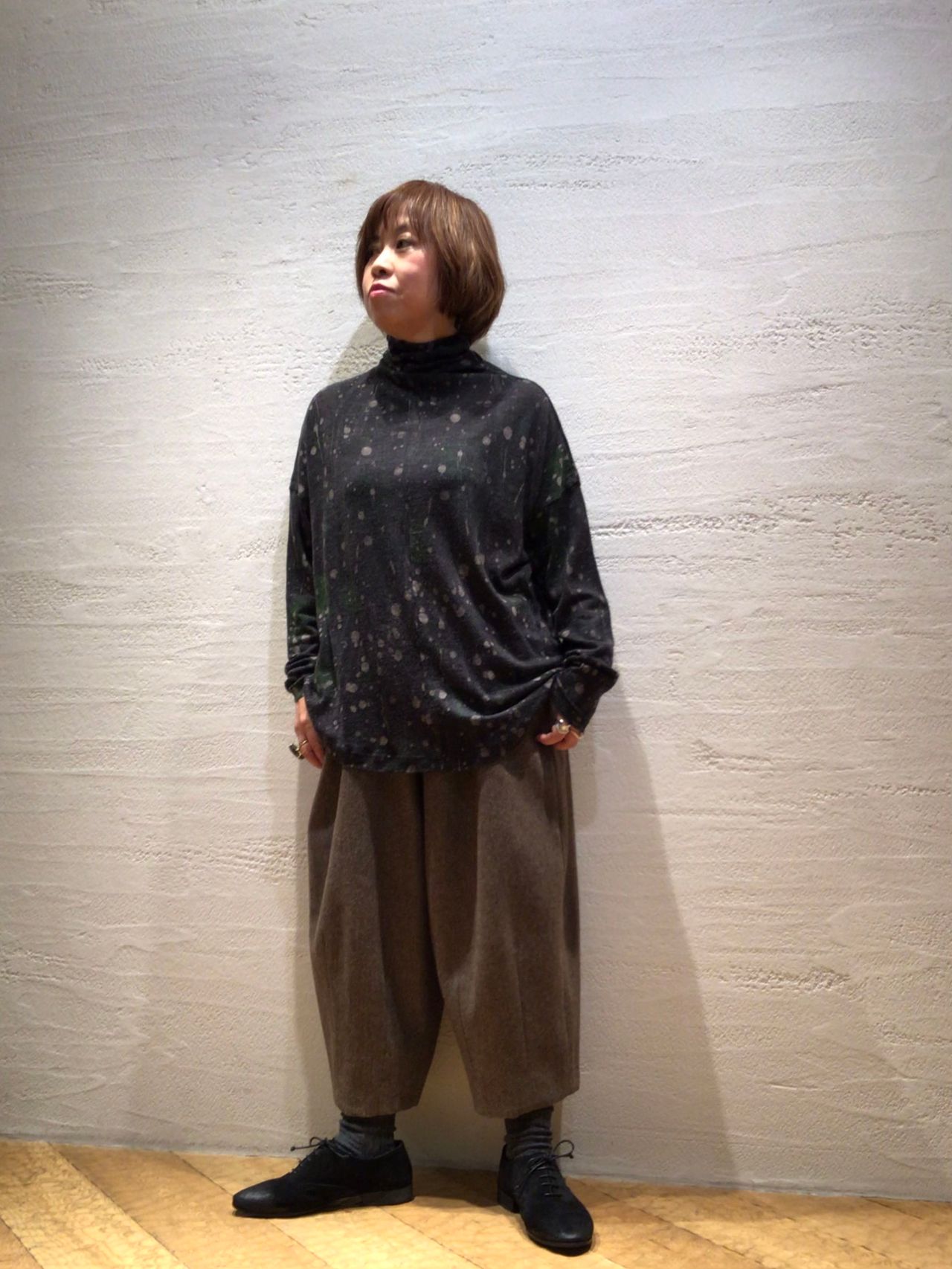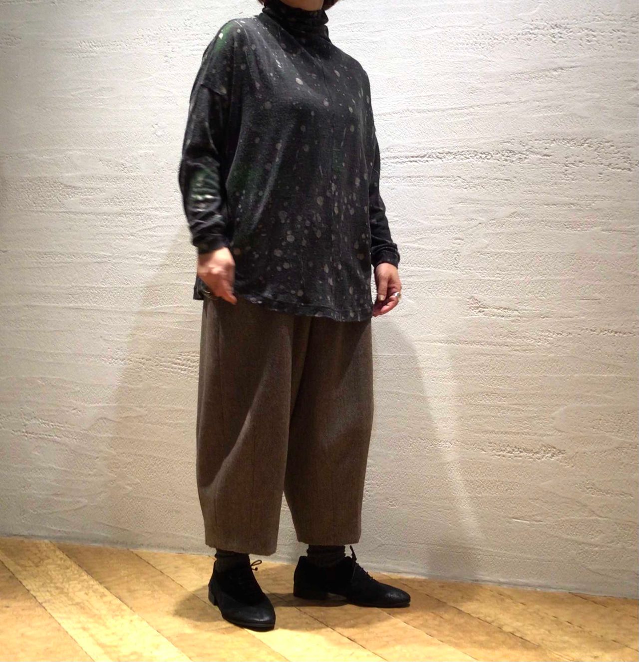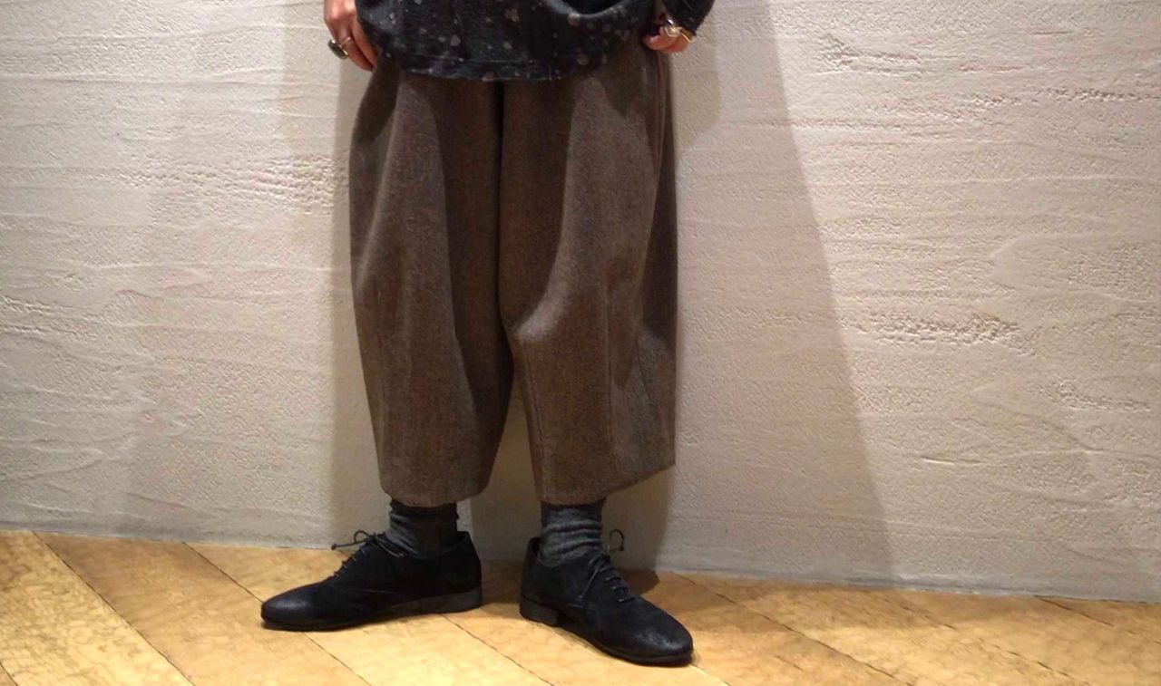 パンツはエコヘリンボンウール素材でゆったり感のある裏地付きのサーカスパンツ。
