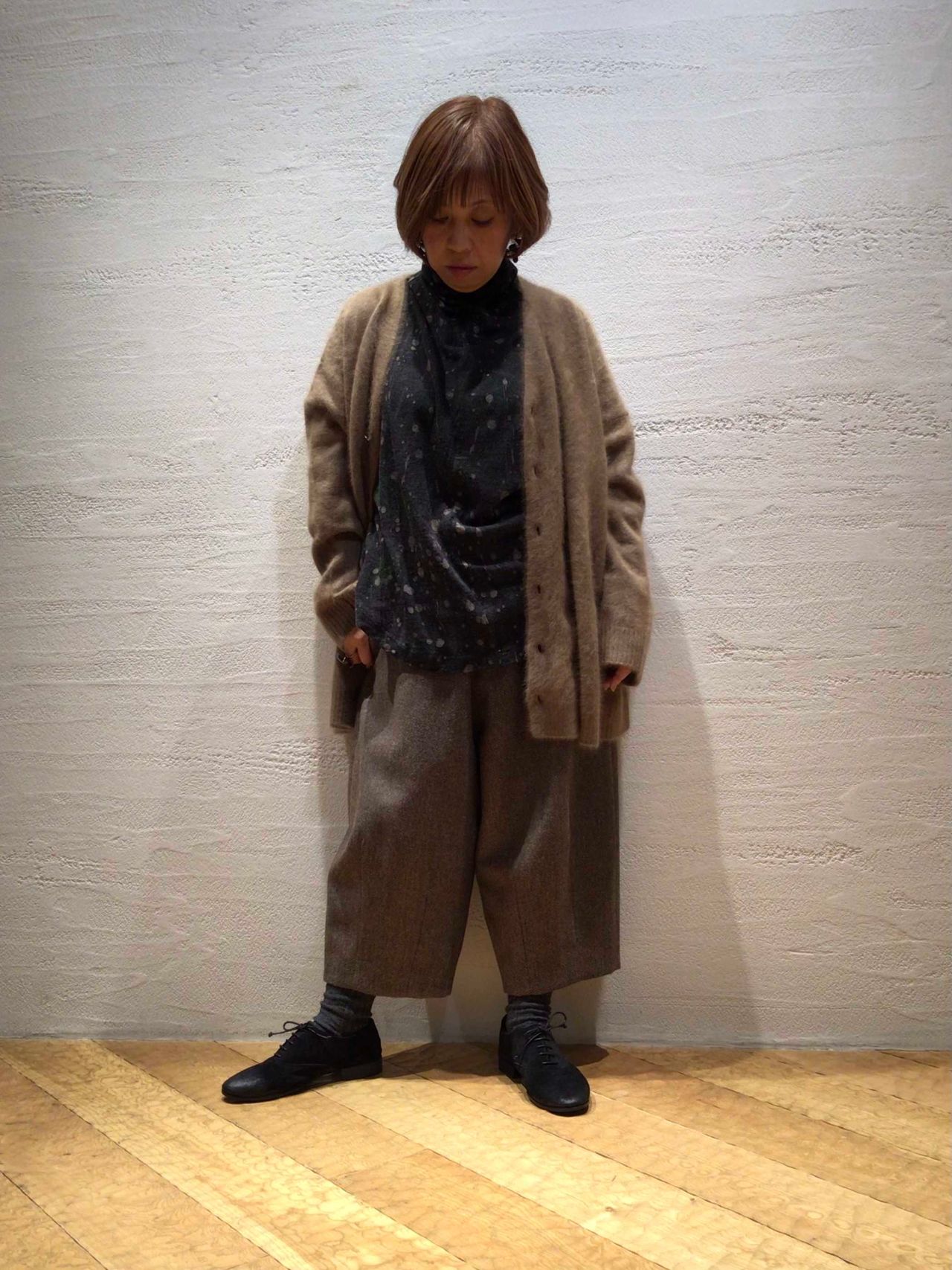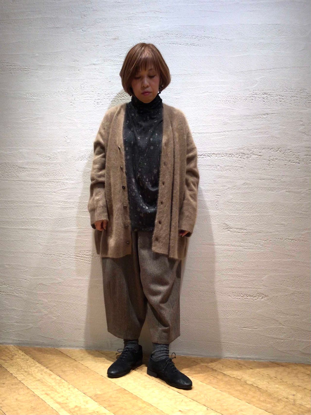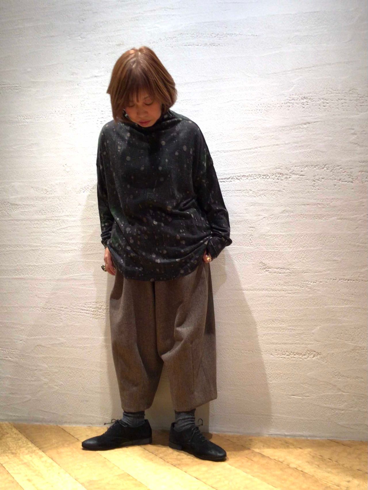 パンツはエコヘリンボンウール素材でゆったり感のある裏地付きのサーカスパンツ。