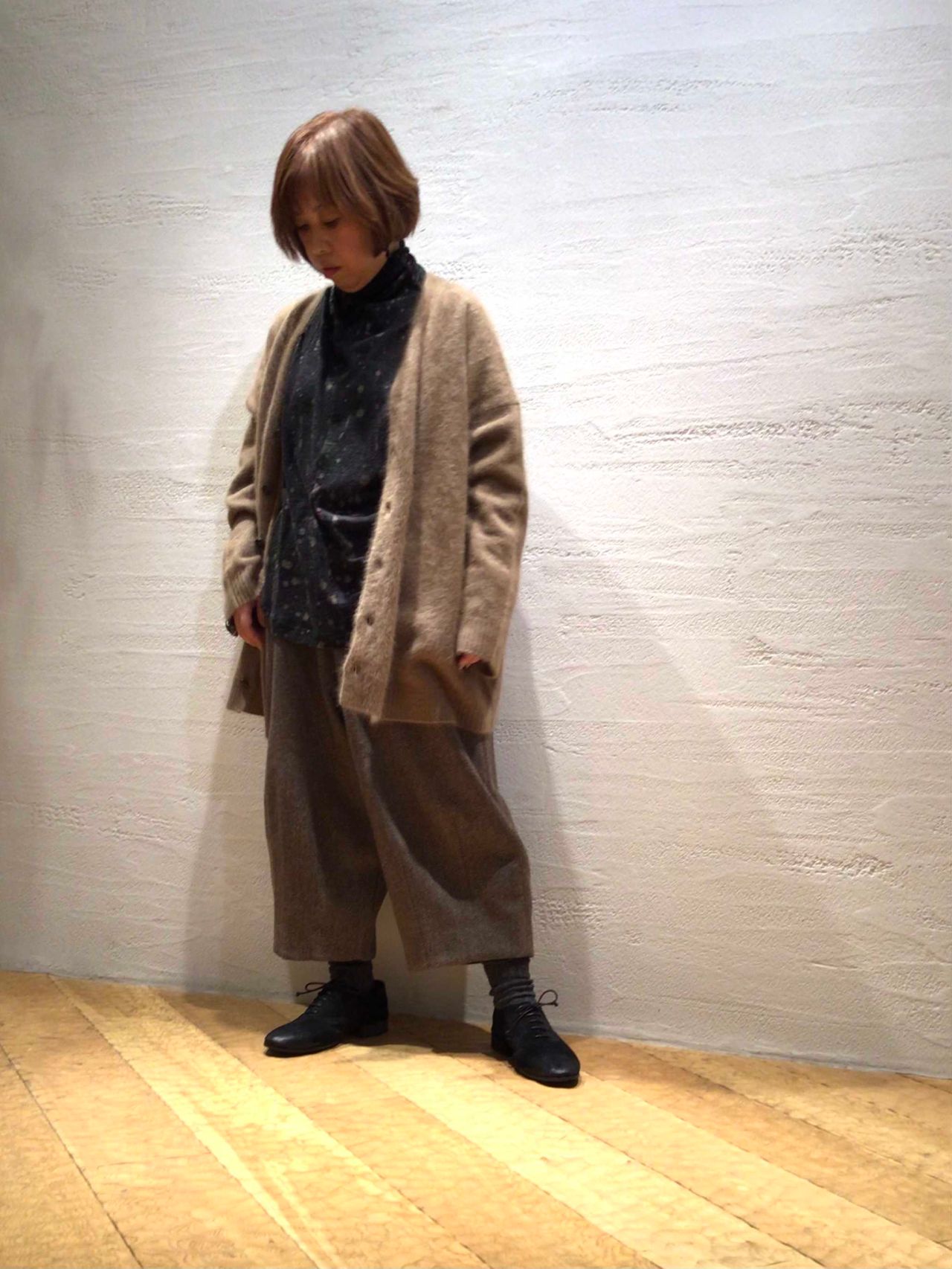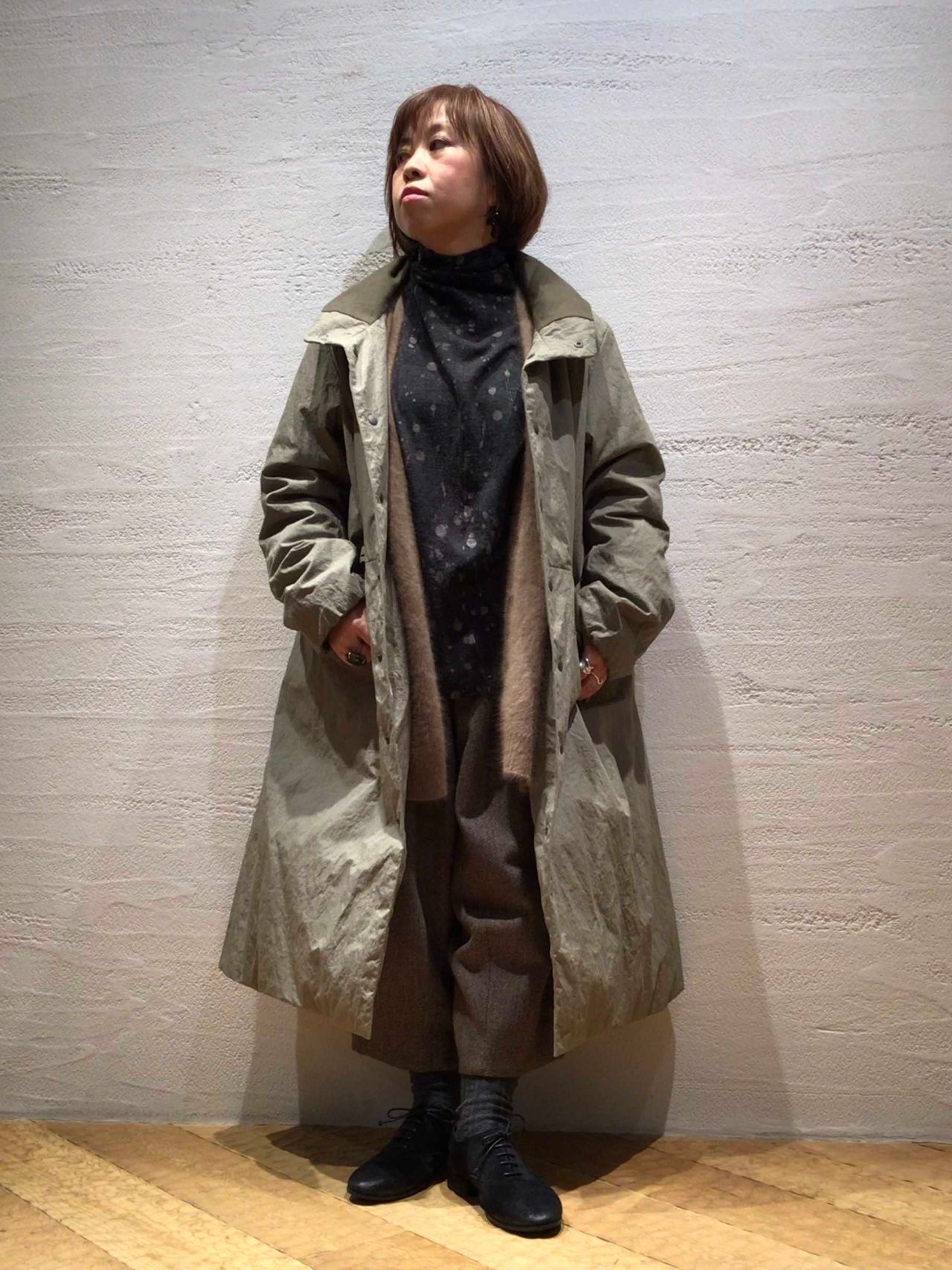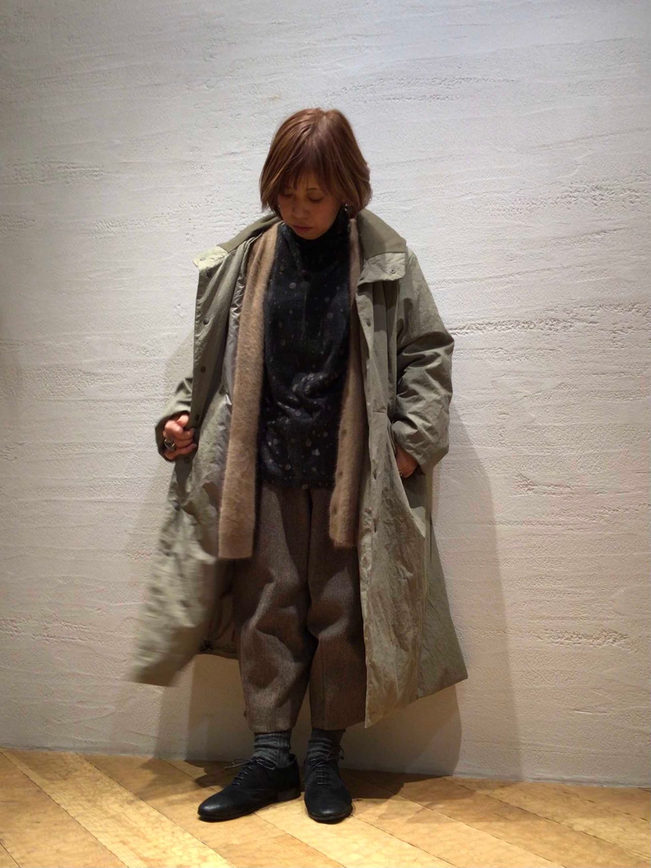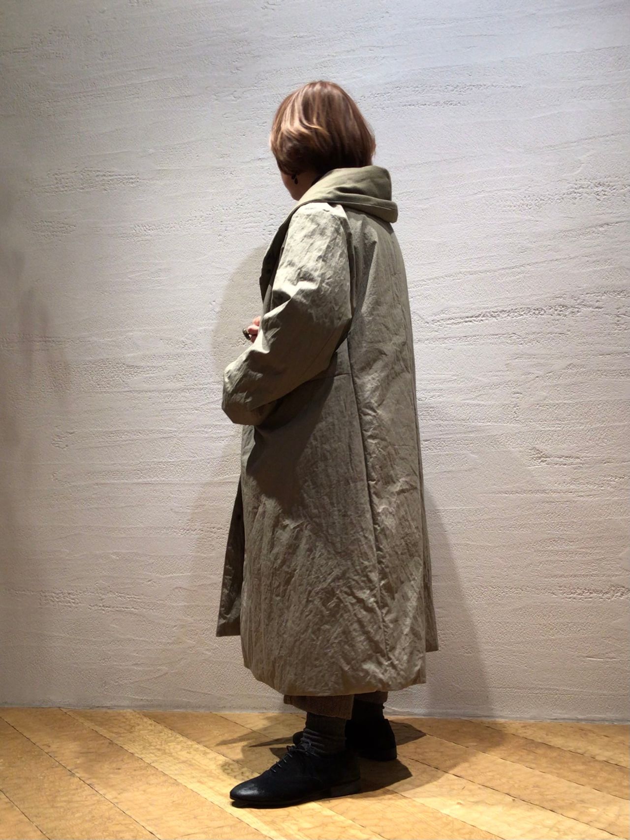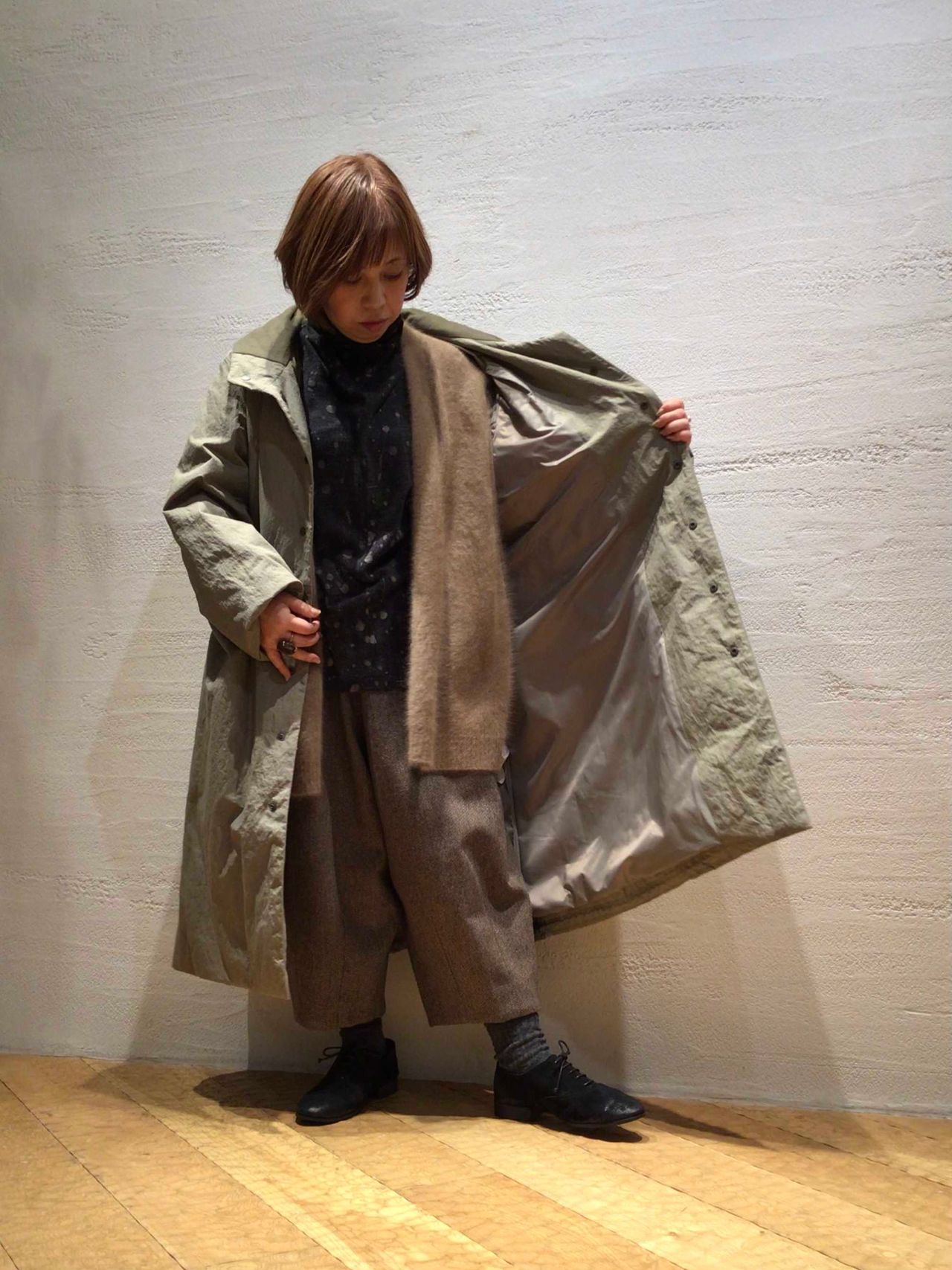 ワイドシルエットですが、着ると脇が落ちて女性らしいシルエットになります。