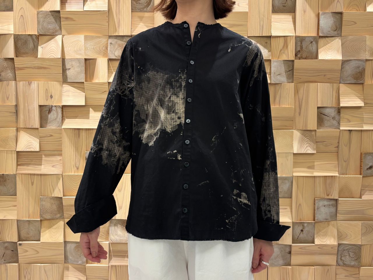 精密に織られたギンガムチェック柄を真っ黒に染め、黒色をブリーチ剤で部分的に抜き去る加工を施しています。職人が一点一点手作業で行うため、同じものはない一点もののアイテム。
