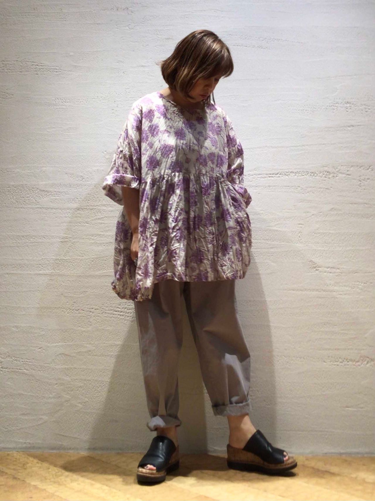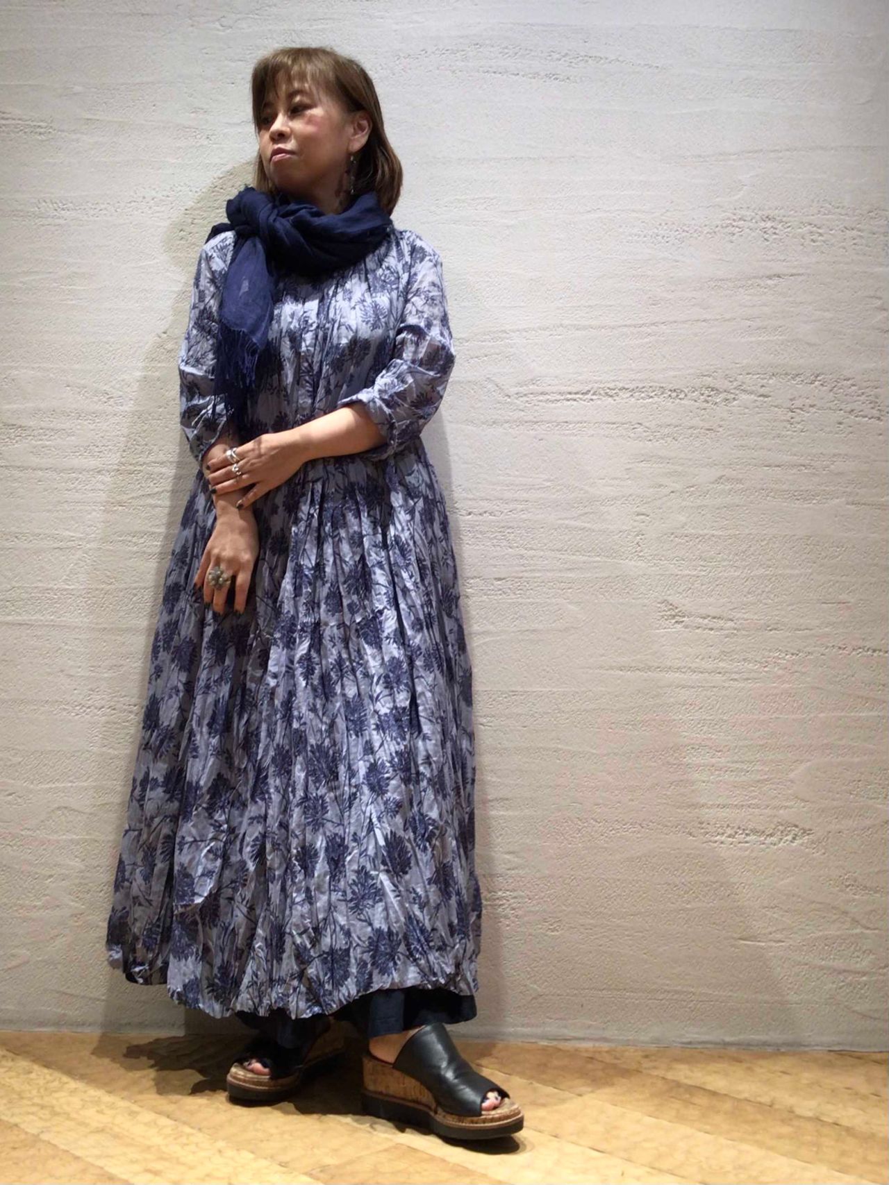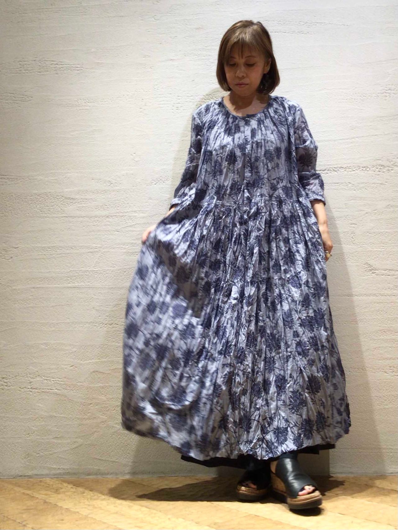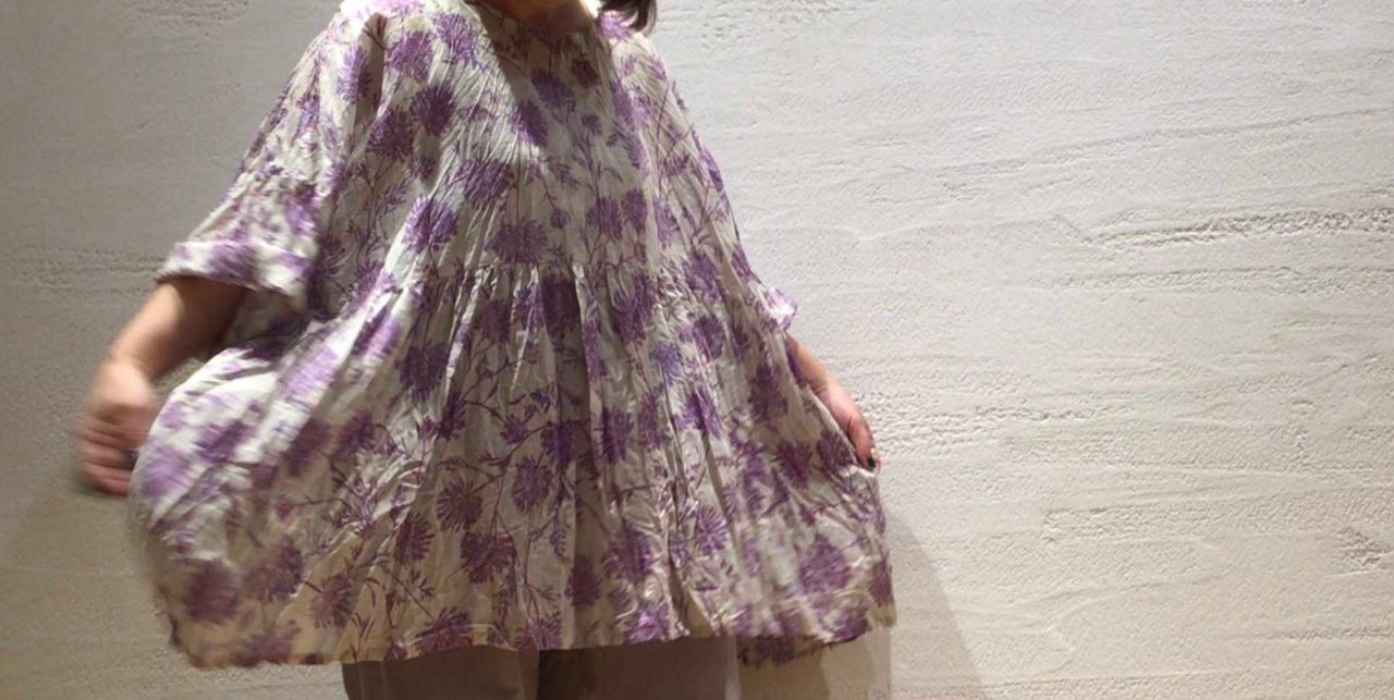 透け感のあるコットンスラブローンに繊細なフラワープリントのワンピース。