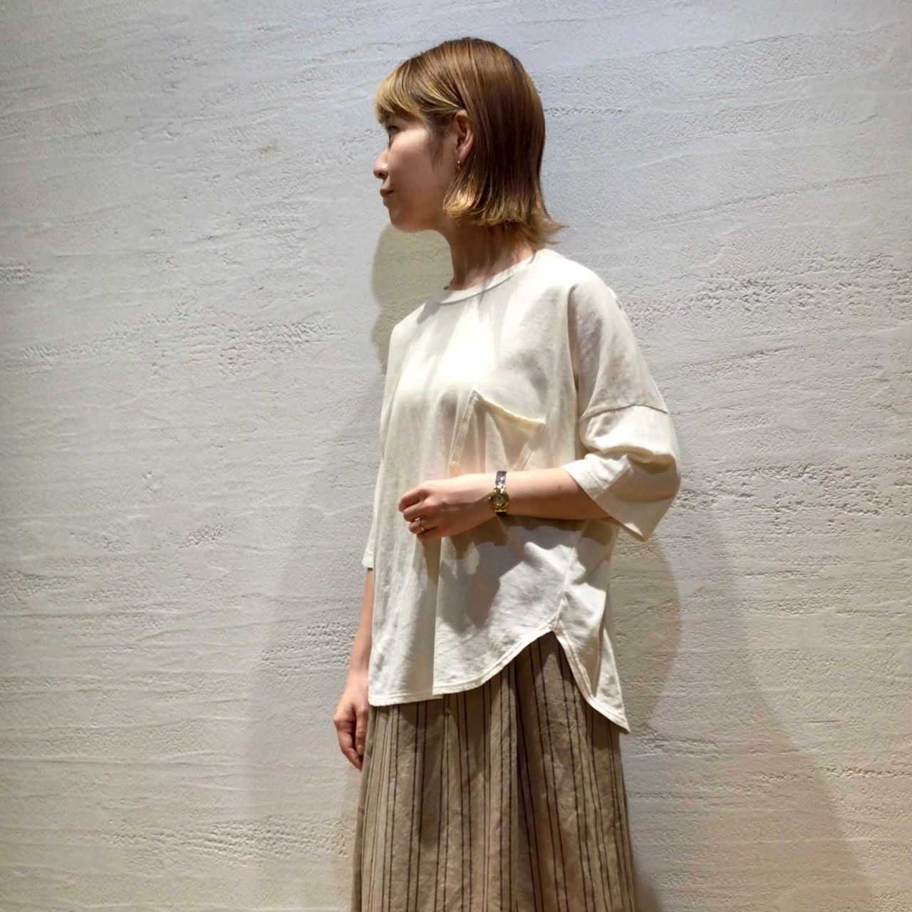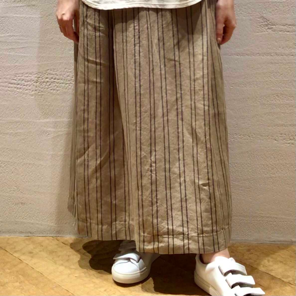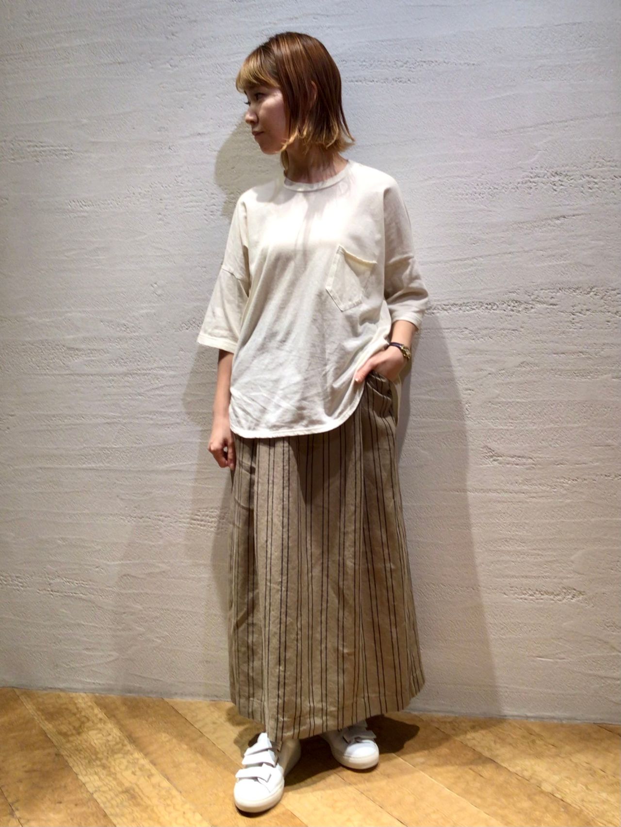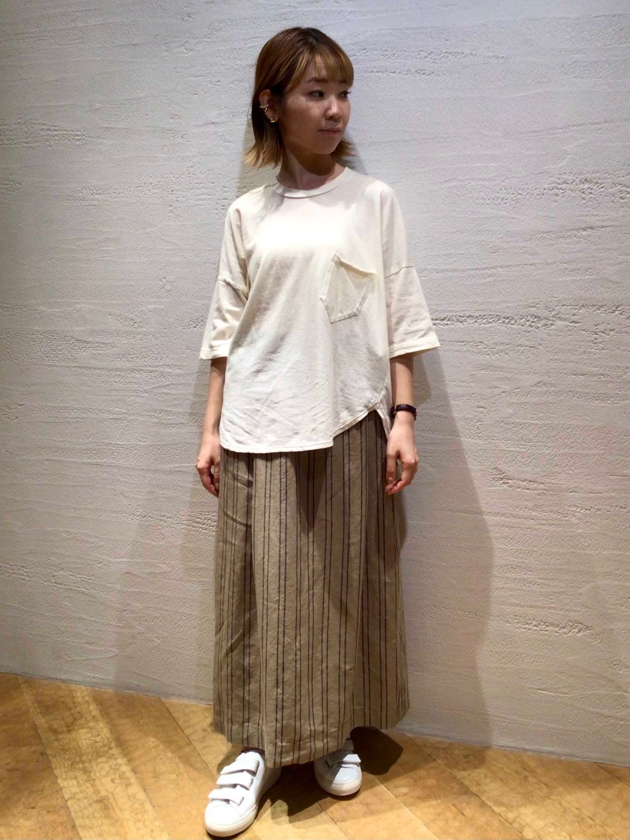 程よいハリ感の出るブラジル綿を使用したカットソーを、Aラインのリネンスカートと合わせてすっきりとした爽やかな印象のコーディネートに。