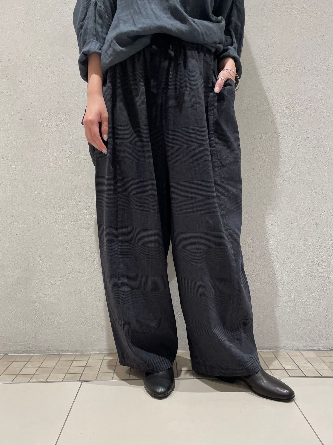 パンツも形違いのワイドパンツ。華奢なシューズを選び、メリハリのあるコーディネートに。