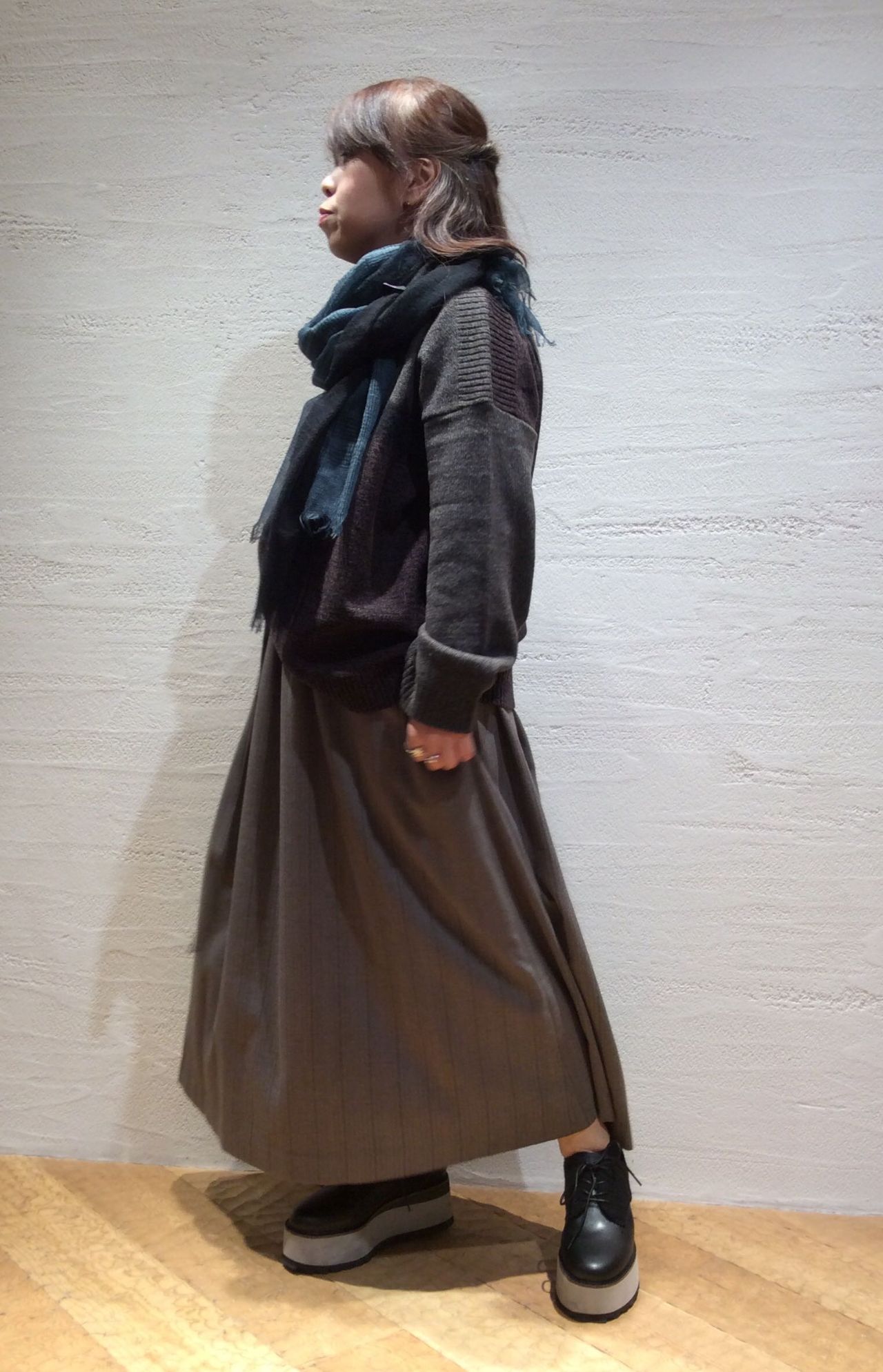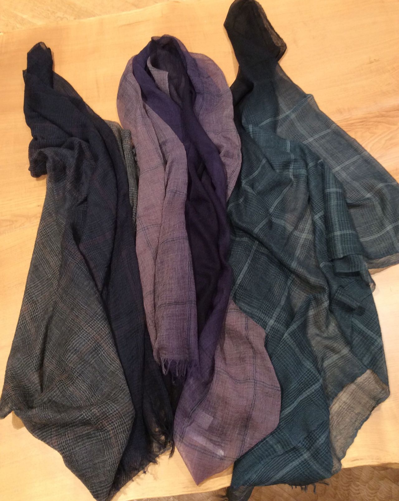 パドカレならではのカシミヤ羽衣のストール。今年はチェックにグラデーションで染めているので巻き方次第でいろんな表情を楽しんで頂けますよ。軽くて肌触りの良いストールです。