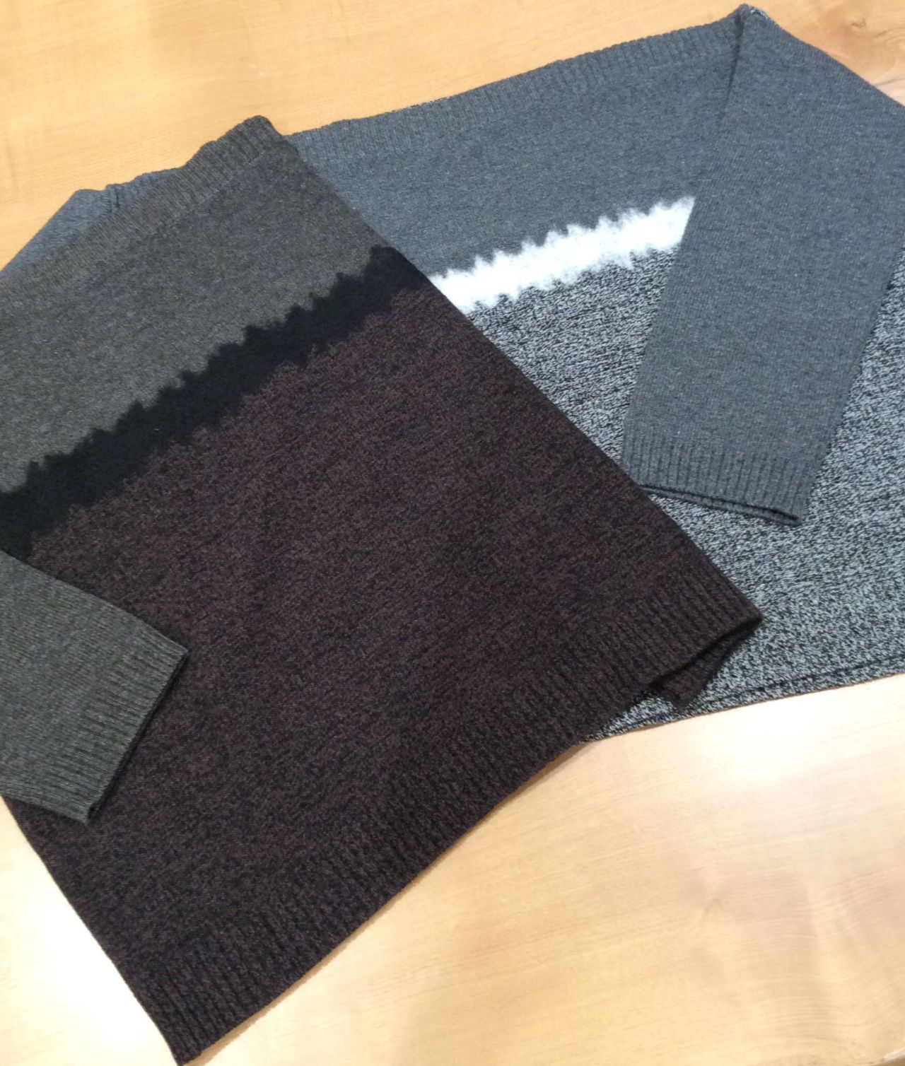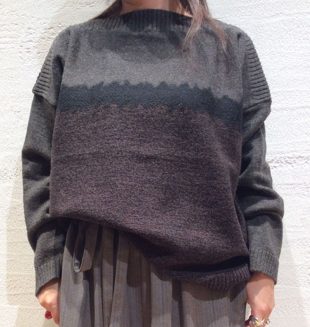 ニードルパンチを横割にしてパッチワークしたボートネックプルオーバー。
