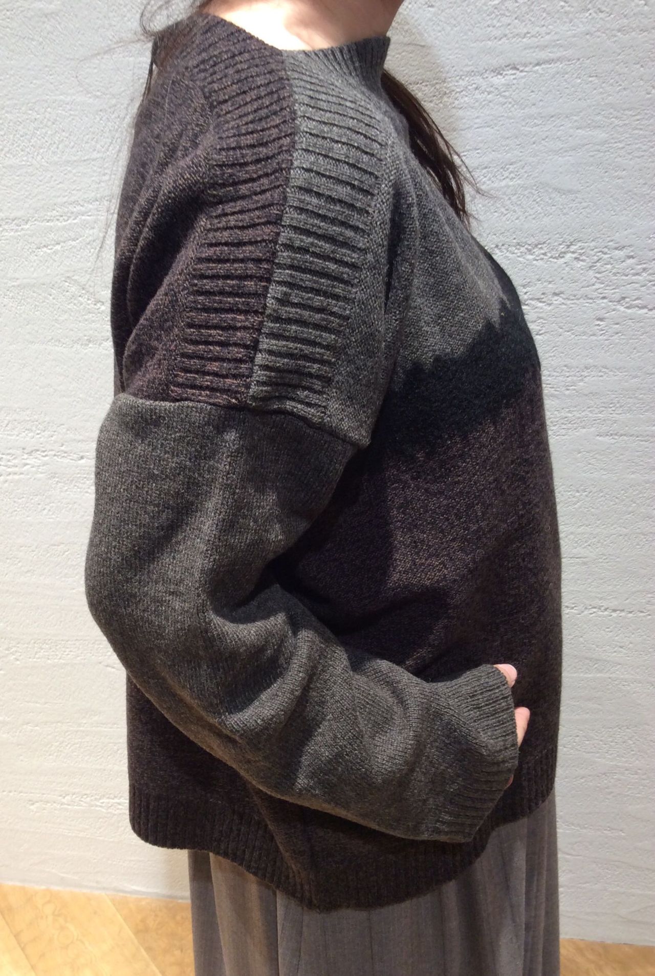 直線ラインの袖付け、リブ編みの前後肩線の色のコンビとパドカレらしさが詰まっています。