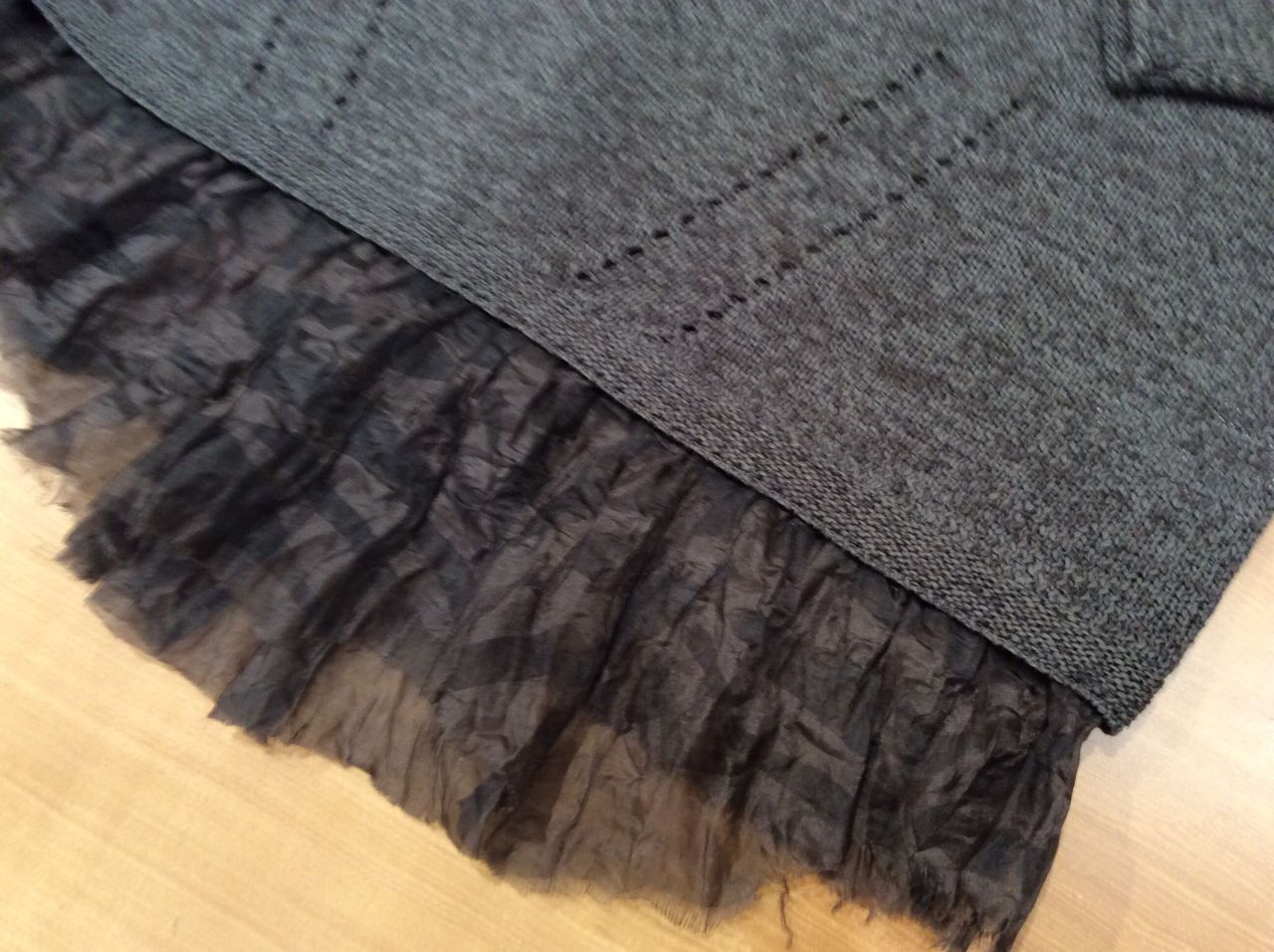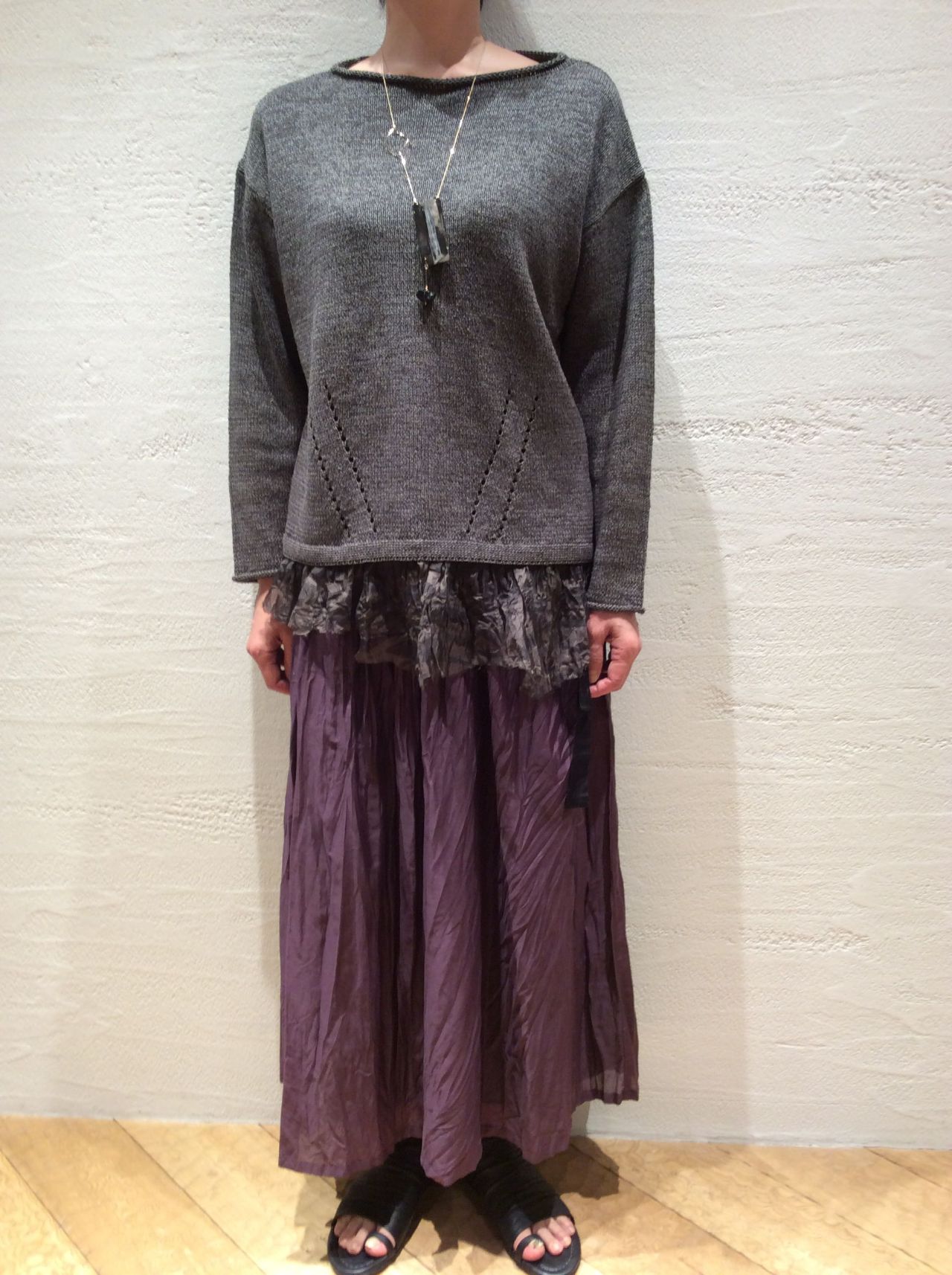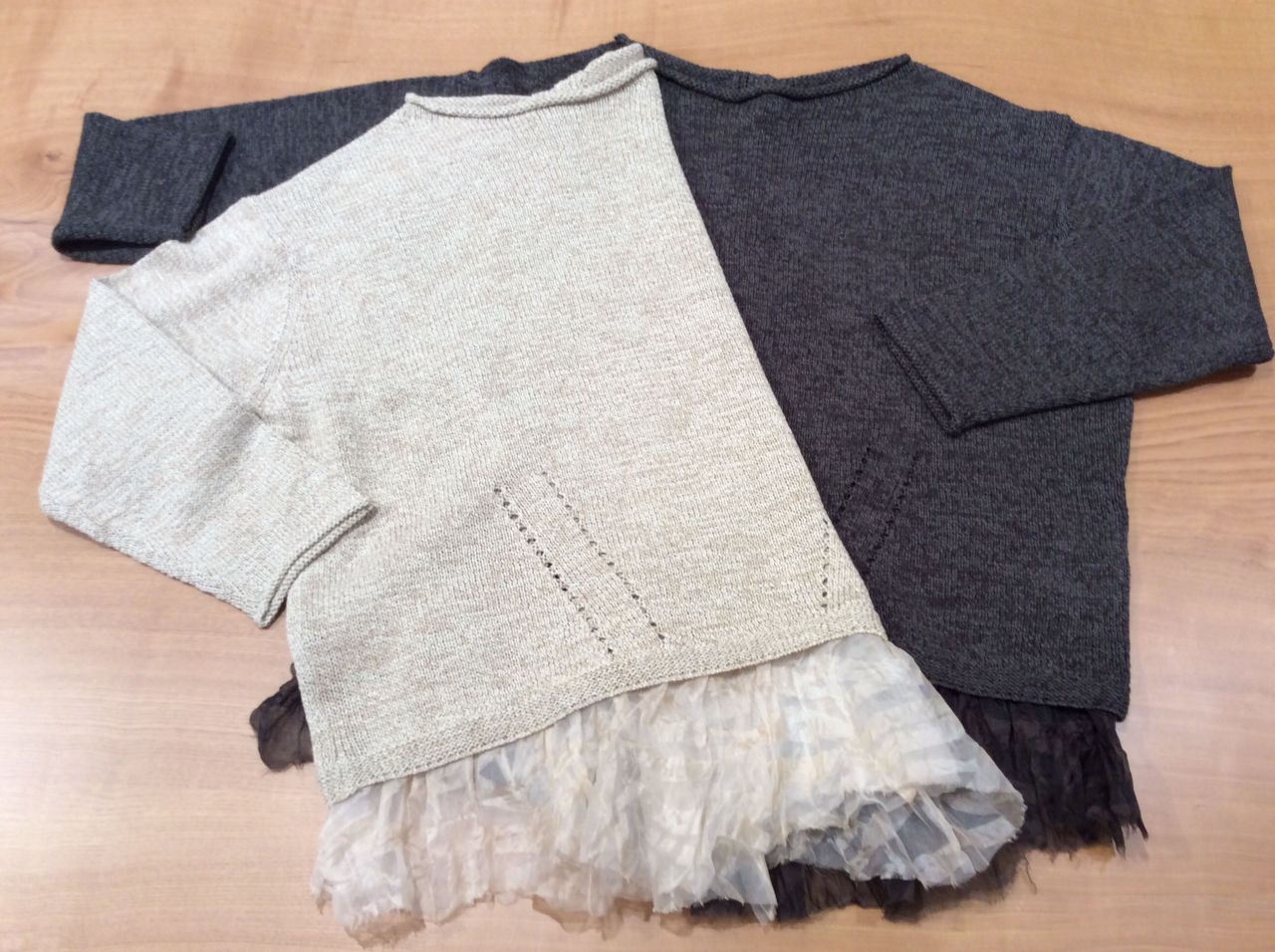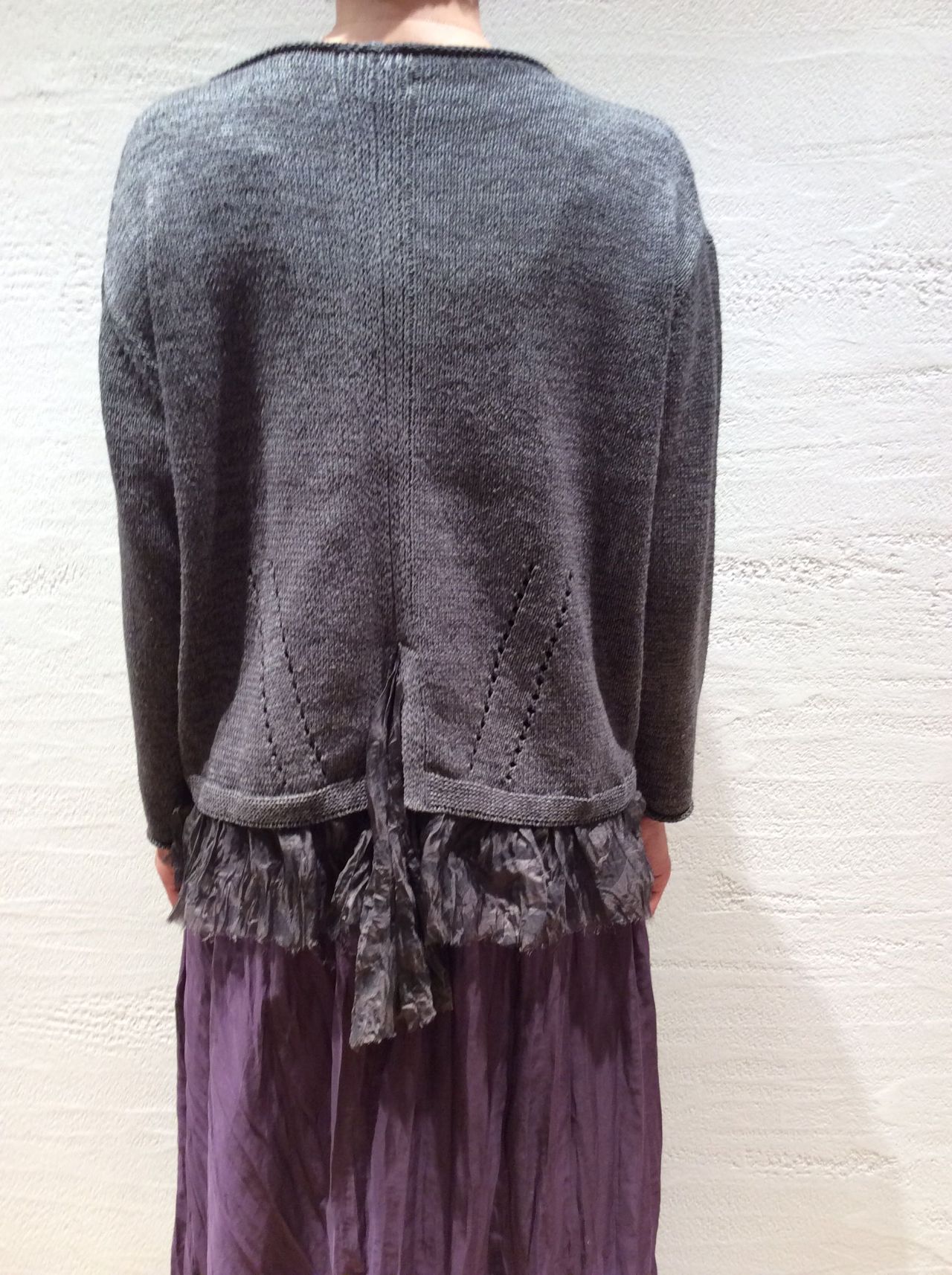 裾にオーガンジーが付いて、一枚で着ても着映えのするニットですね。