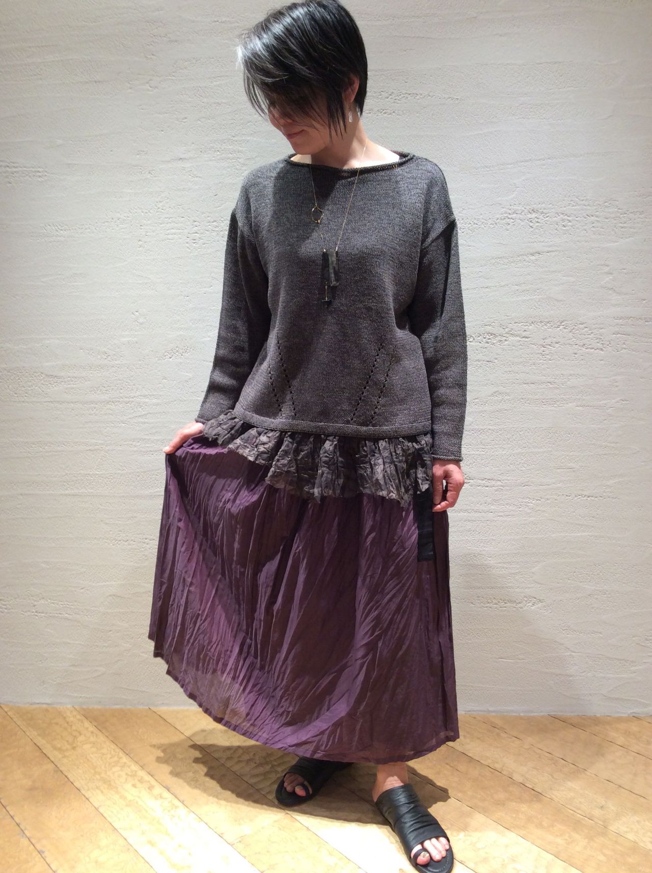 春風にふわっとなびくスカートを美濃和紙混のプルオーバーでカジュアルダウン。