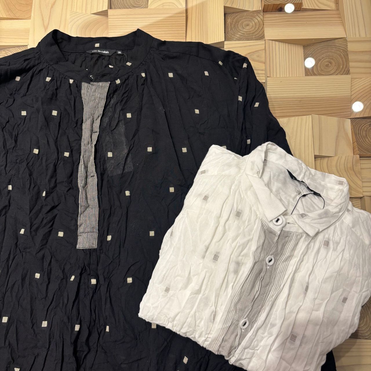 フロントのタックと小ぶりの襟が特徴の前あきブラウスと襟にギャザーを施したスタンドカラーのプルオーバーブラウスの2型です。