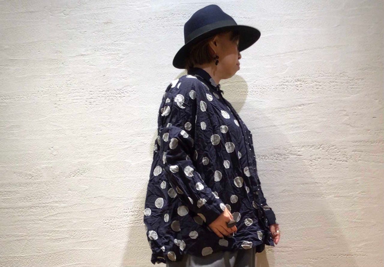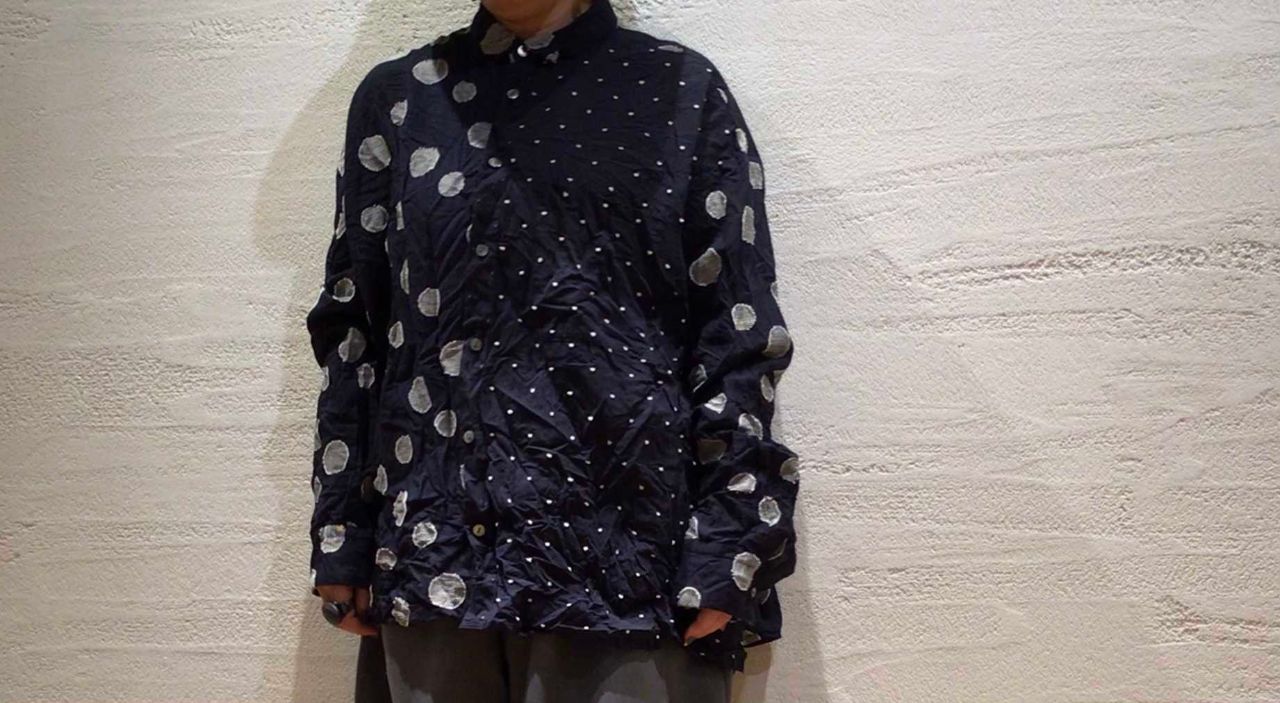 大胆な大小大きさの異なるドットの柄合わせのポケット付き手もみワッシャーシャツ。
