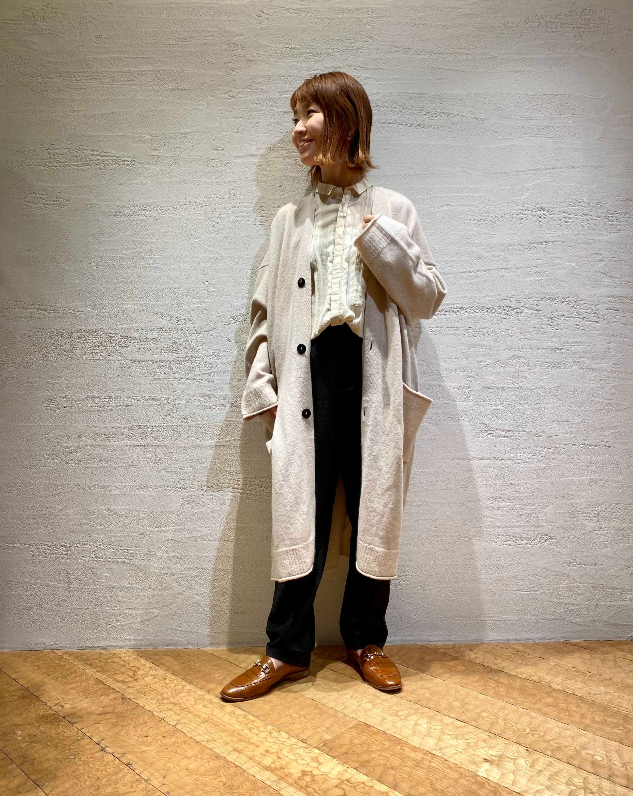 このコーディネートのおすすめはなんといってもカタログにも掲載されているアルパカシャギーコートです。