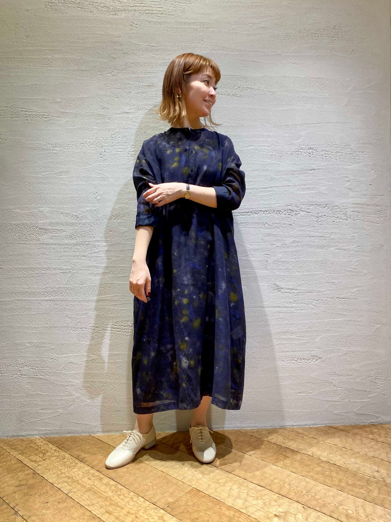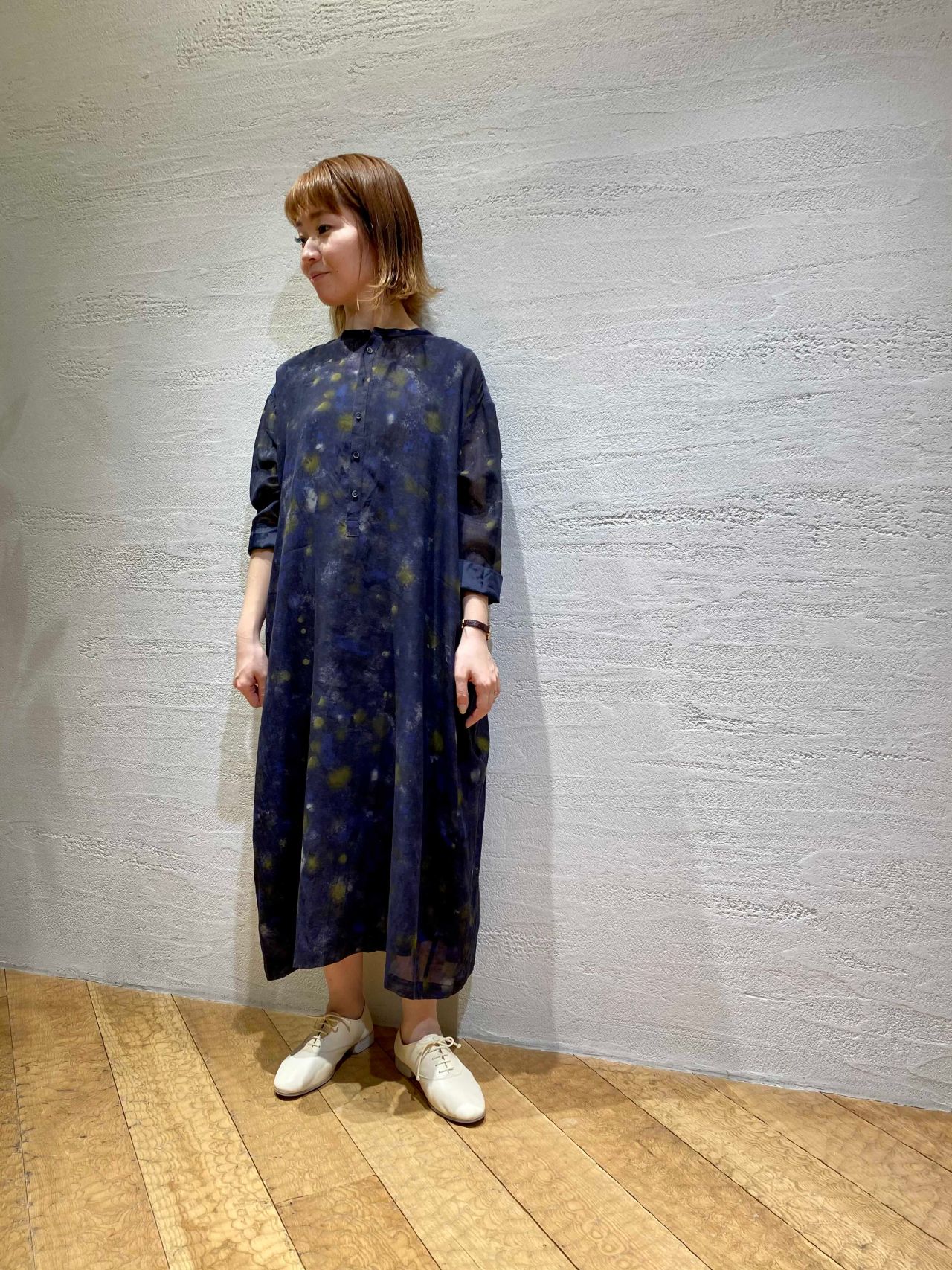 キュプラコットンボイルオリーブプリントワンピース(着用:ネイビー)