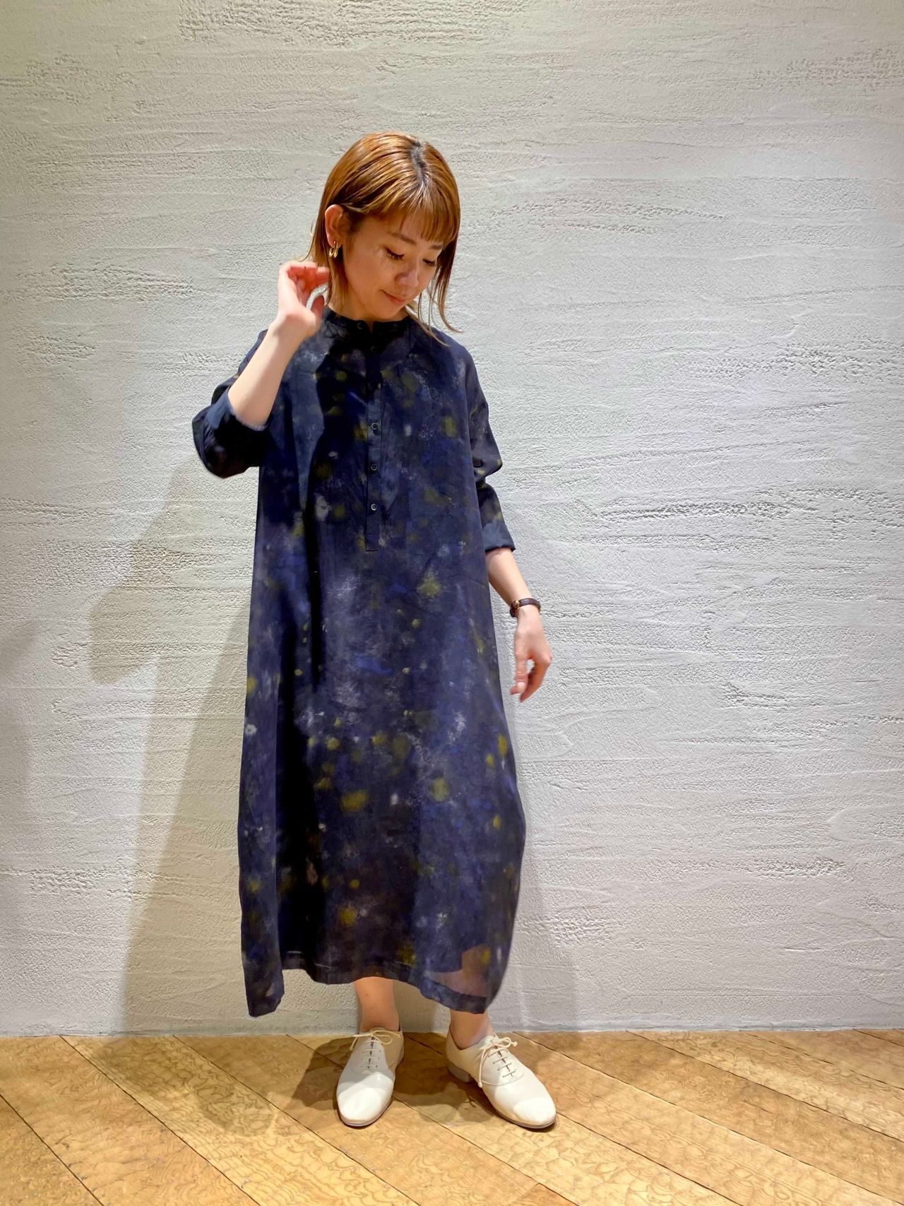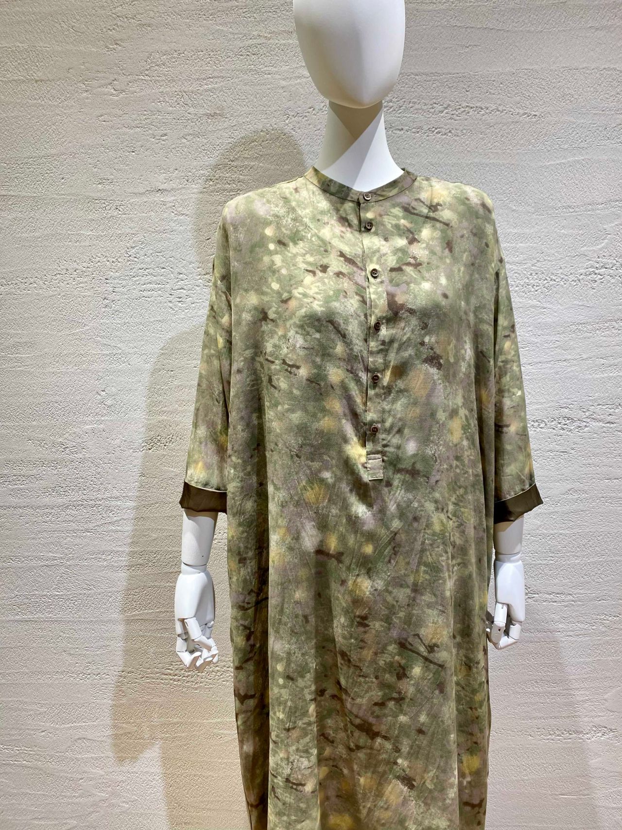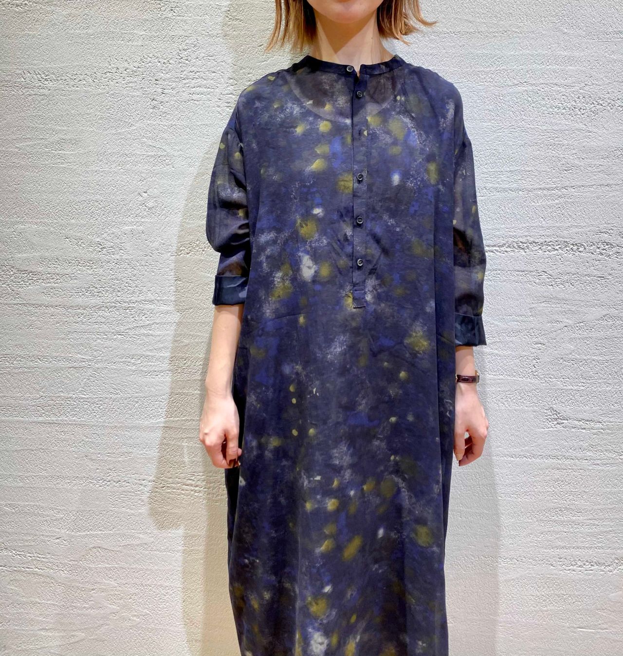 シルエットはすっきりとしていて、胸元はボタン開きのデザイン。