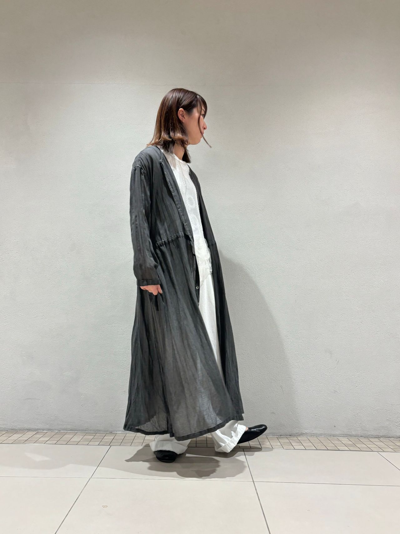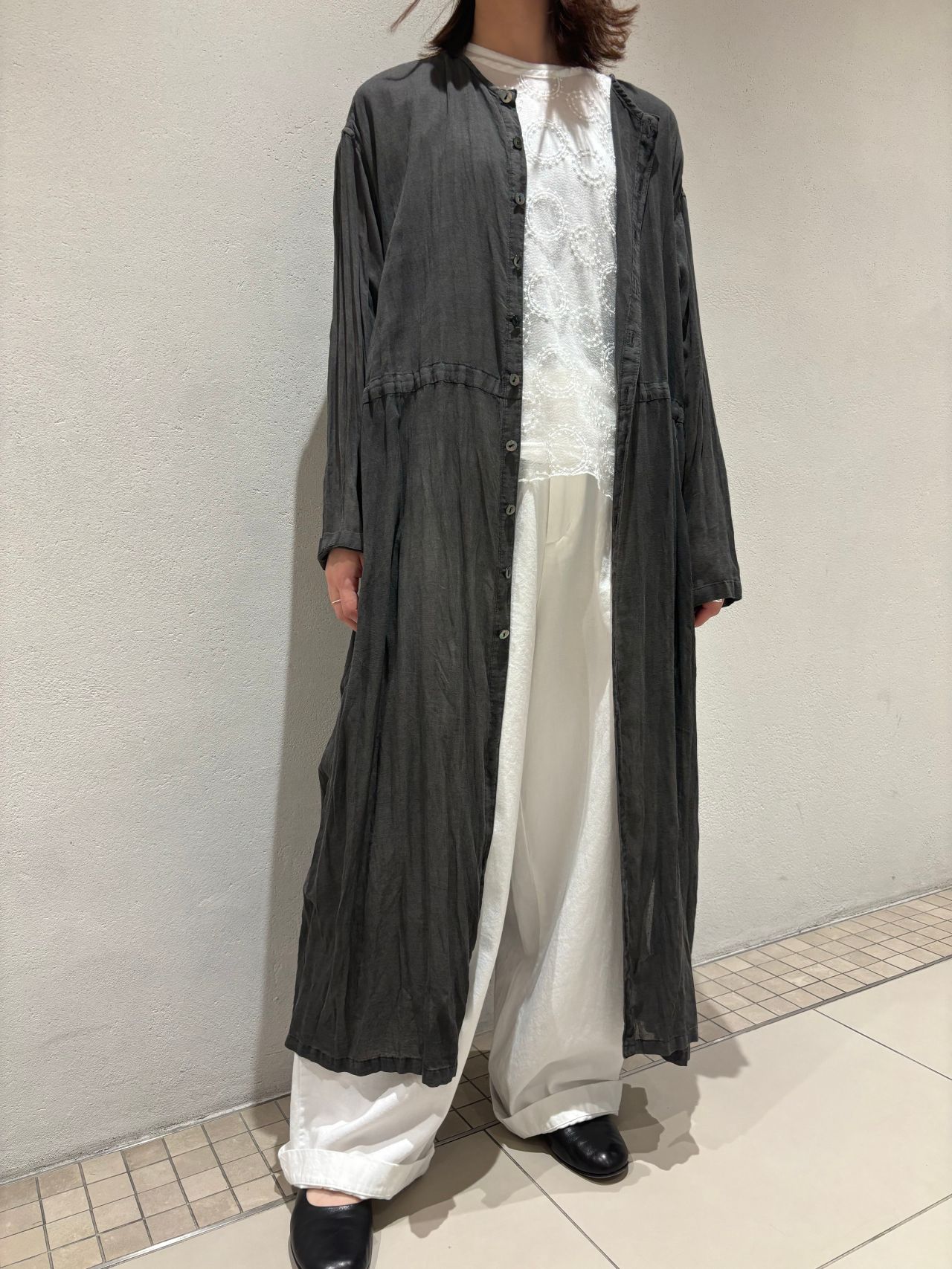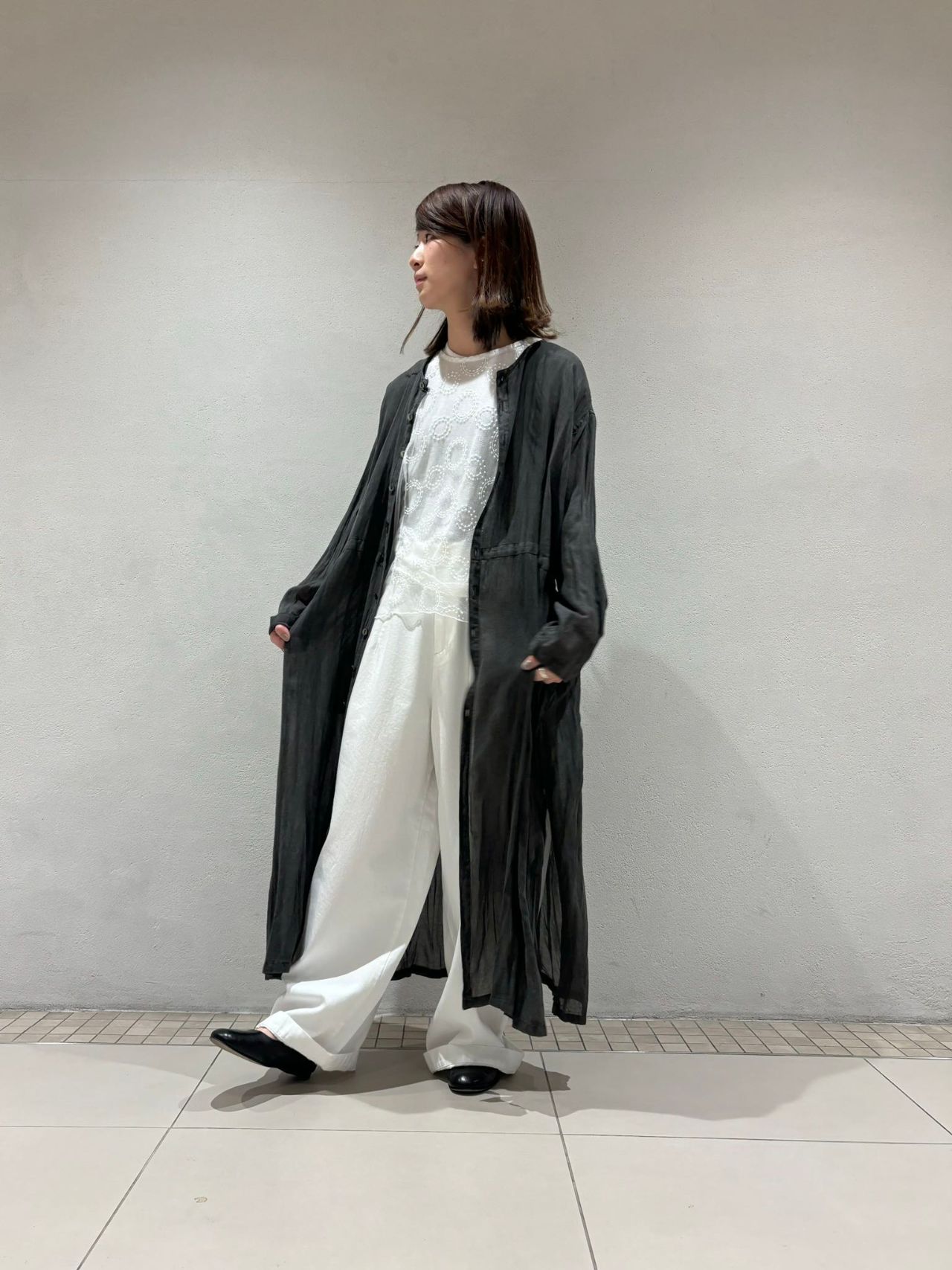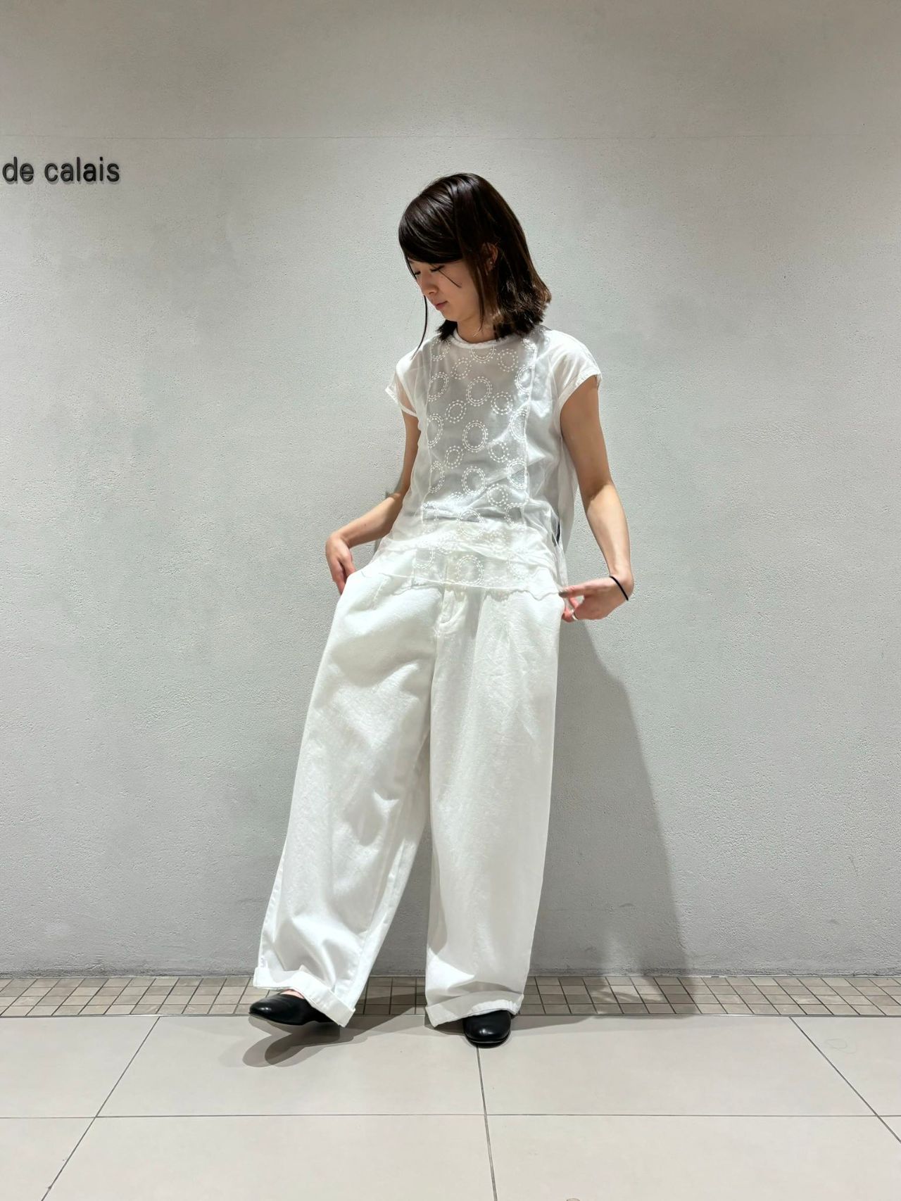 春らしく、オールホワイトにムラ染めを透けさせ軽やかなコーディネートに。