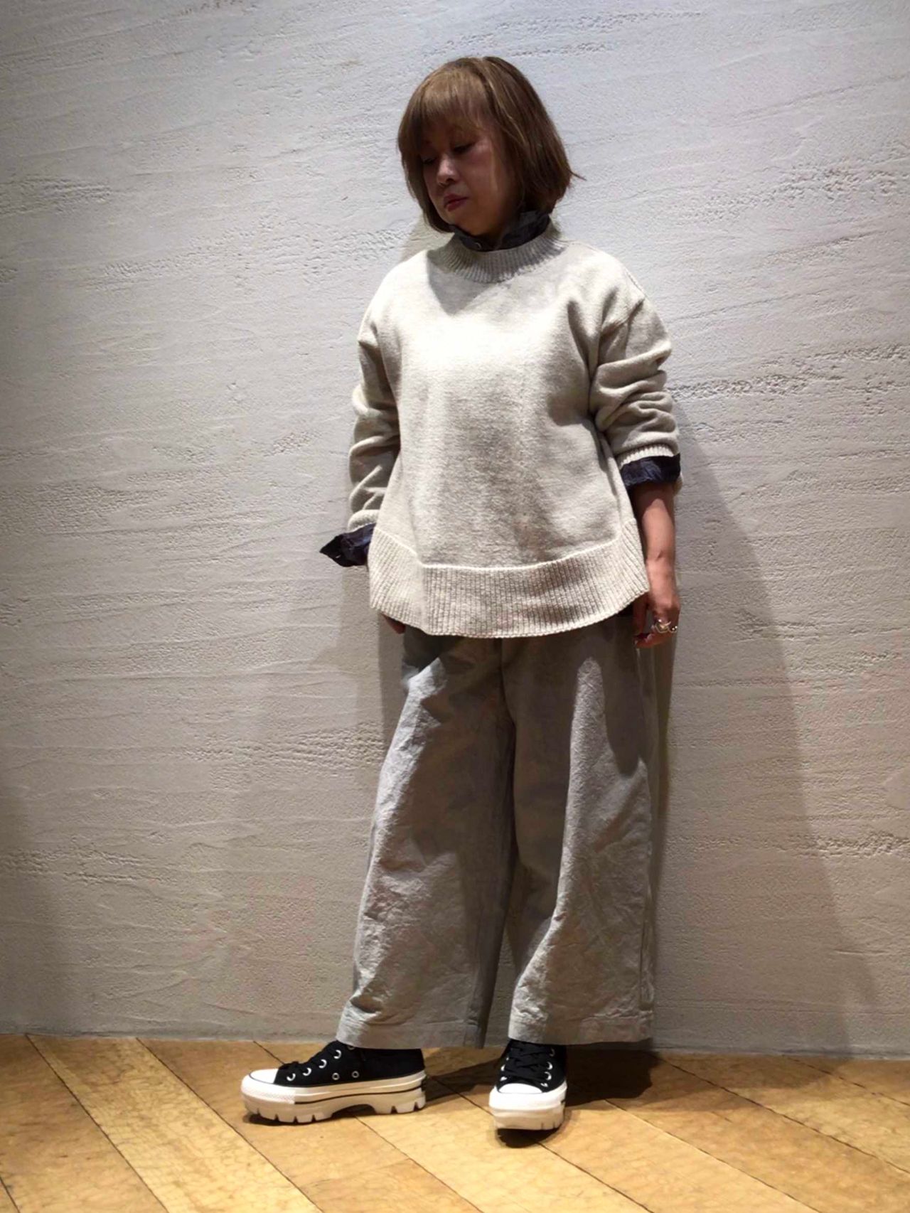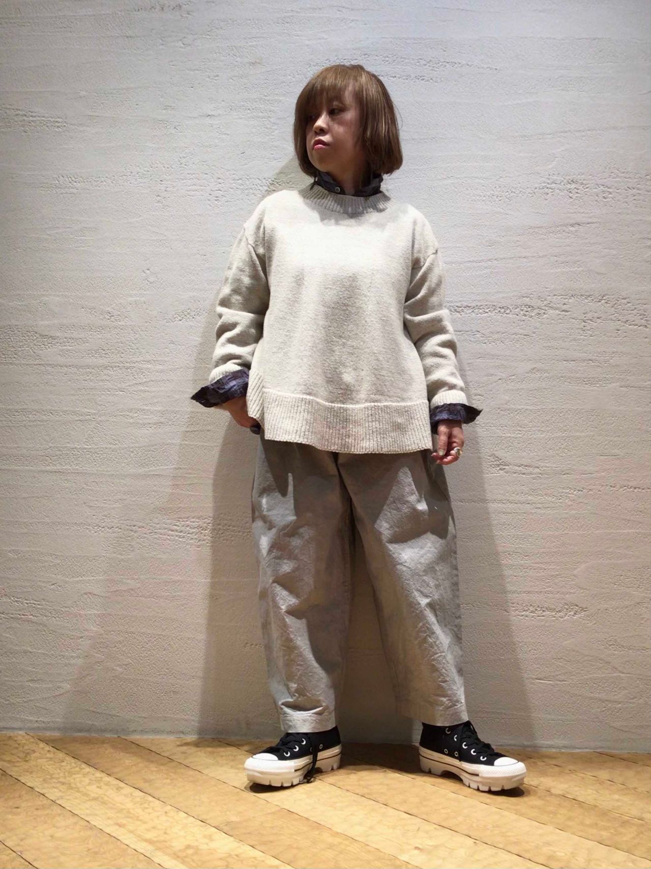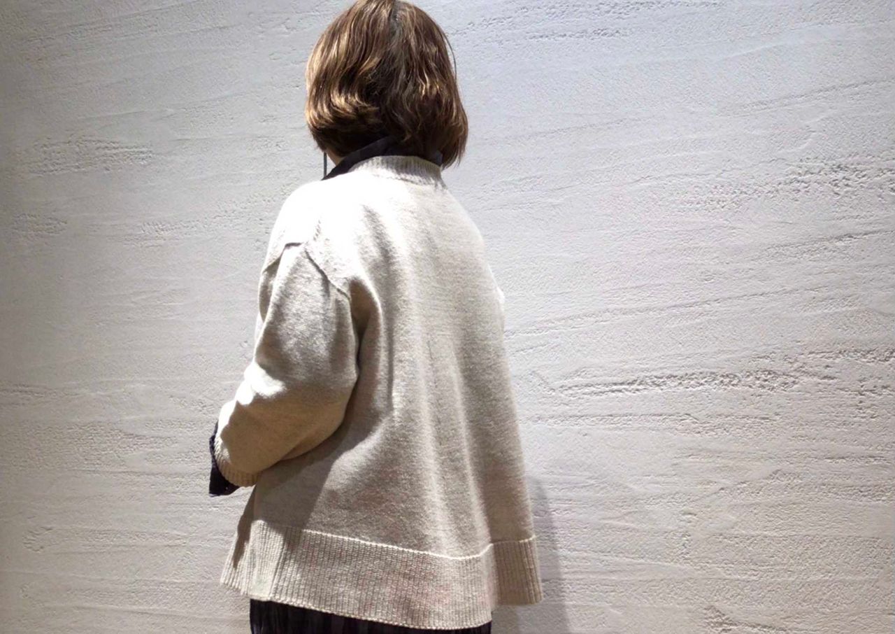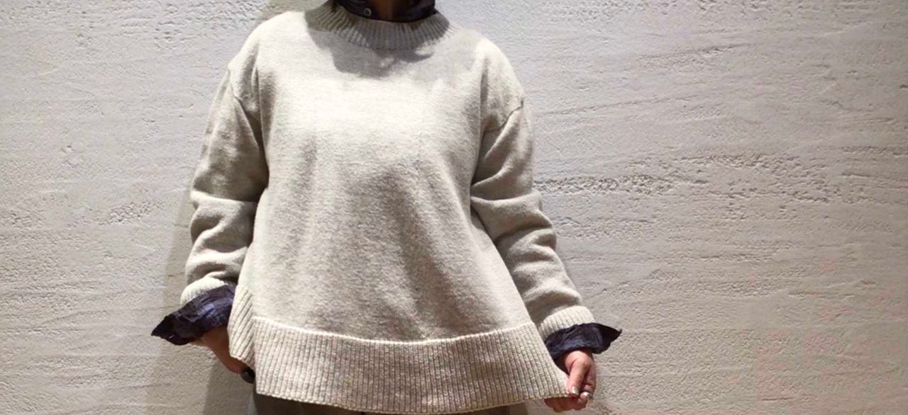 ホールガーメントの自然なAラインが綺麗なバランスの春にぴったりなニット。リユースコットンのムラ糸を加工し編み上げた軽くて優しい着心地。春コートの下でもゴロつかず、ボトムも選ばないので着回ししやすいニットです。