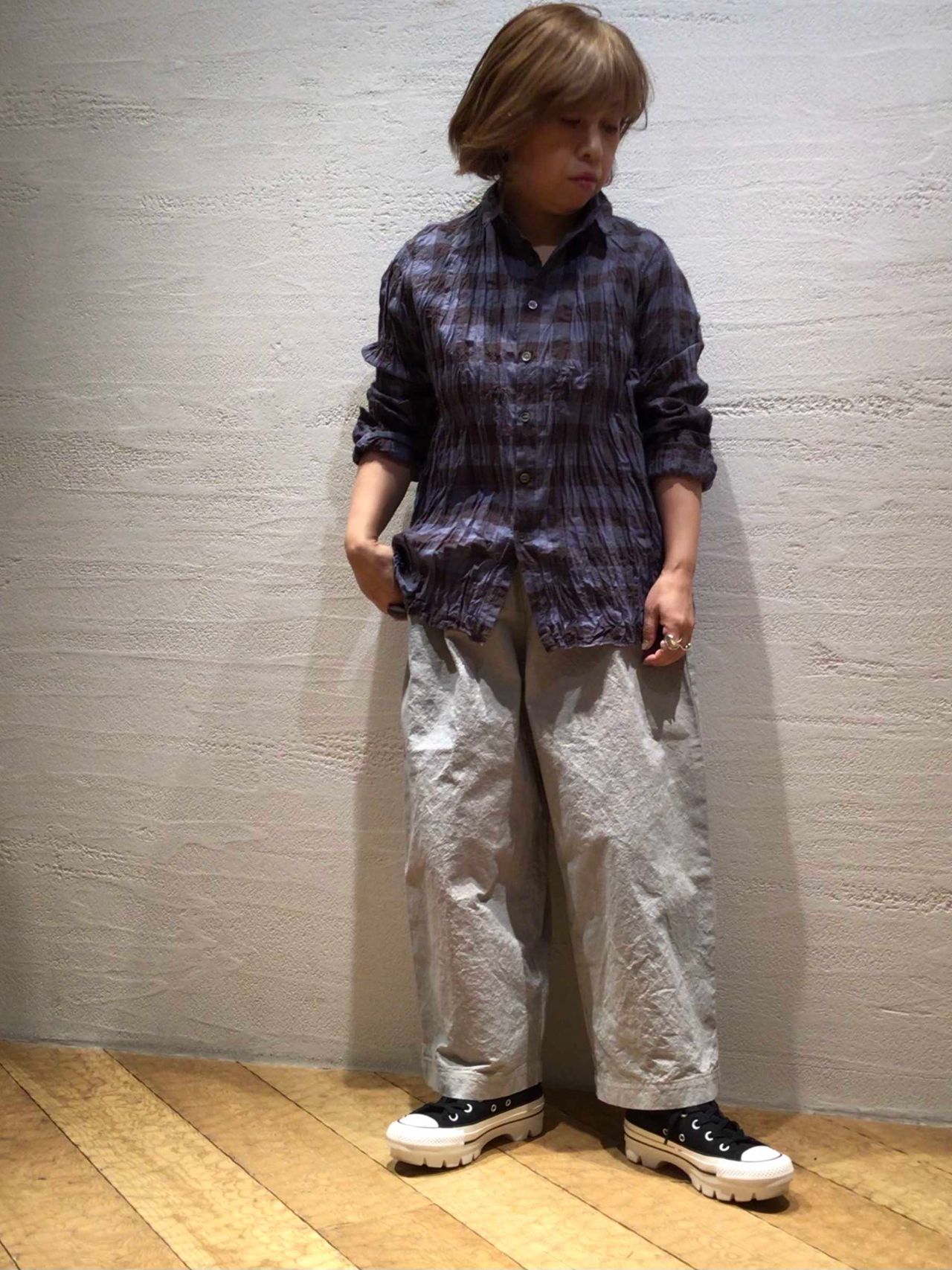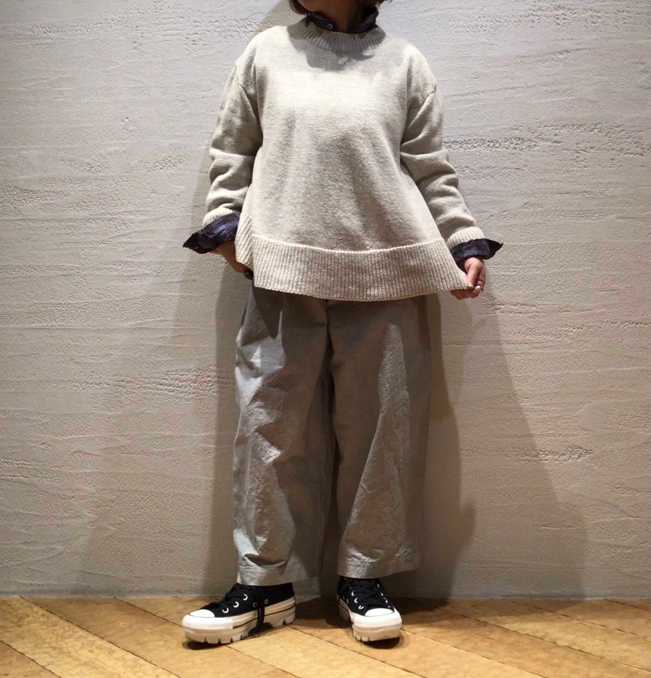 春らしい淡い色合いのニットとパンツにブラウスの襟と袖のチェックでポイントをつけたカジュアルスタイル。