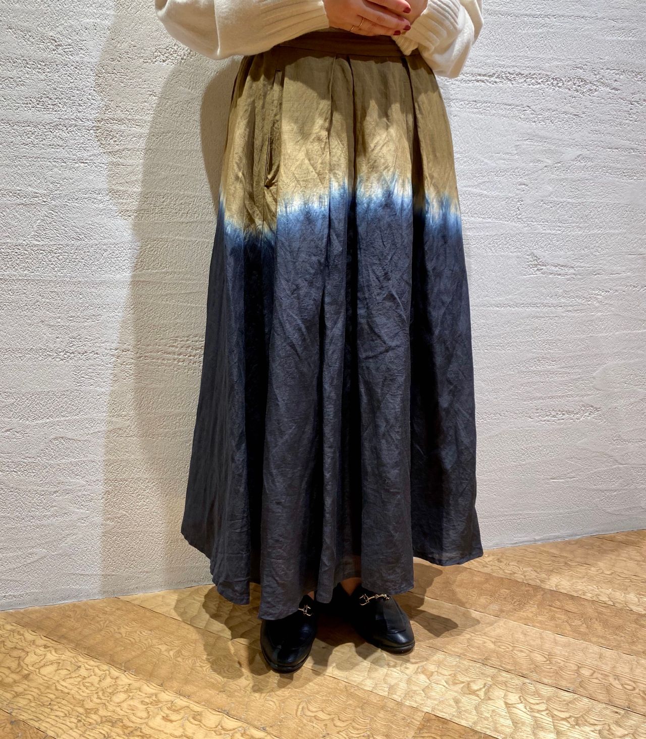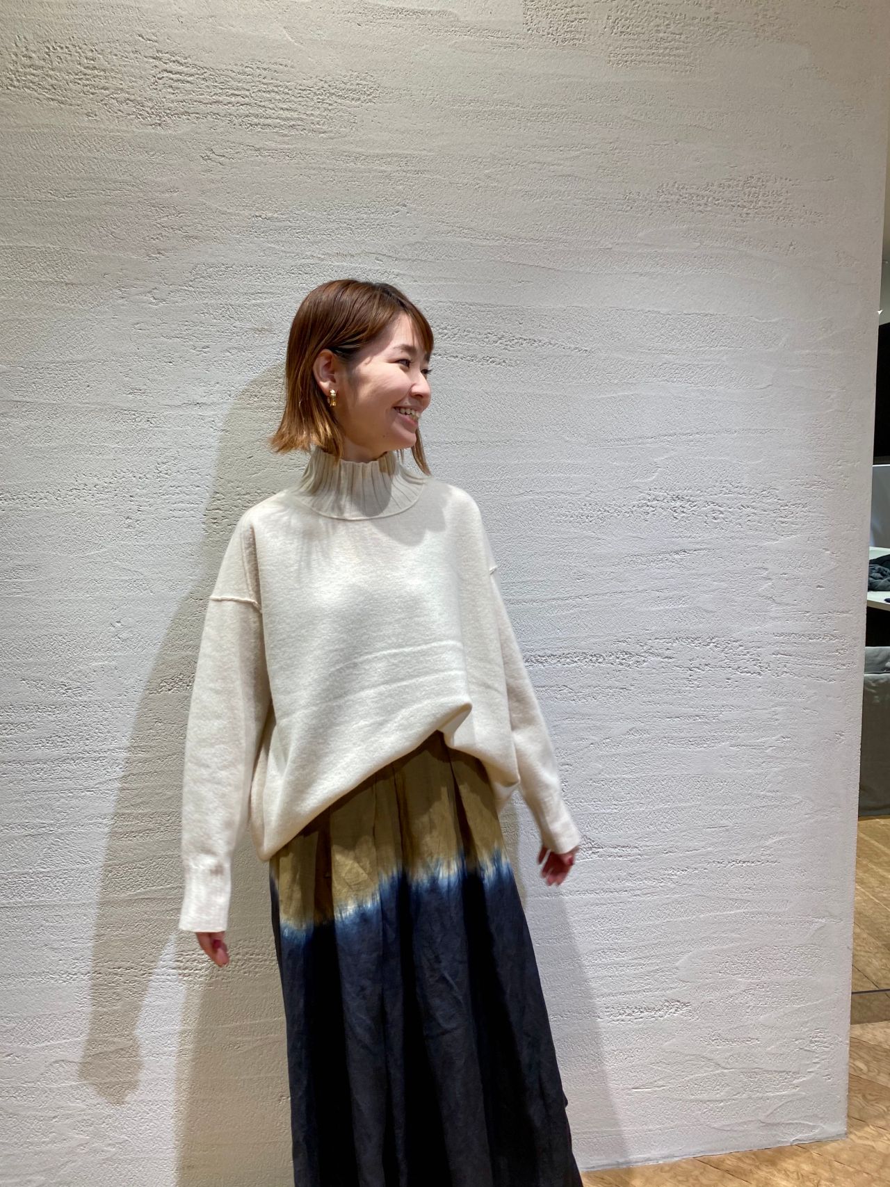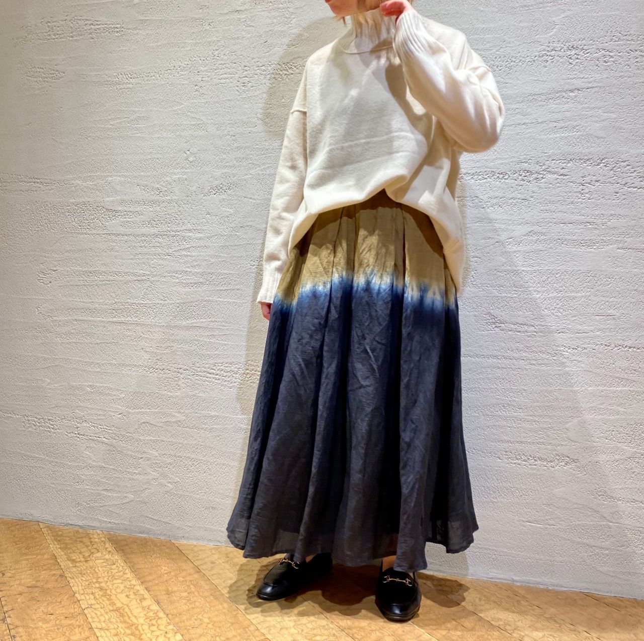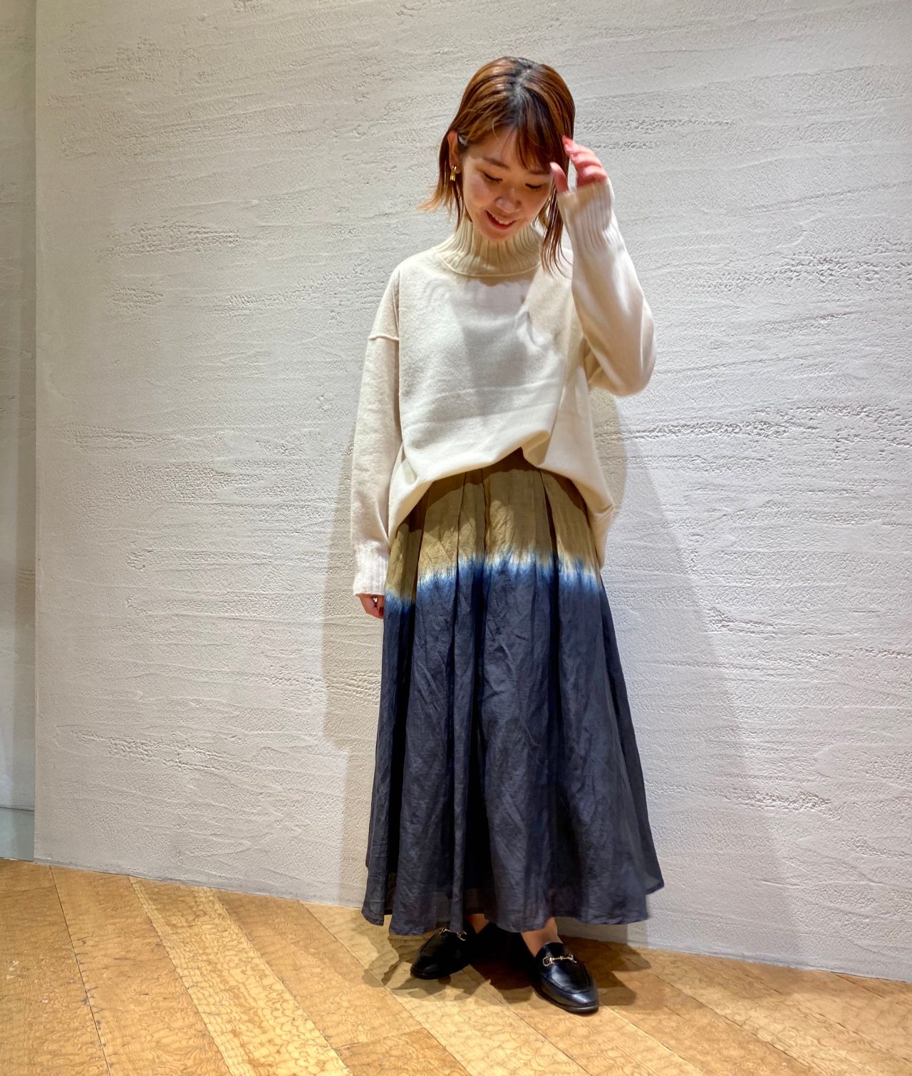 有松絞りのスカートをメインに無地のタートルニットを合わせたコーディネート。