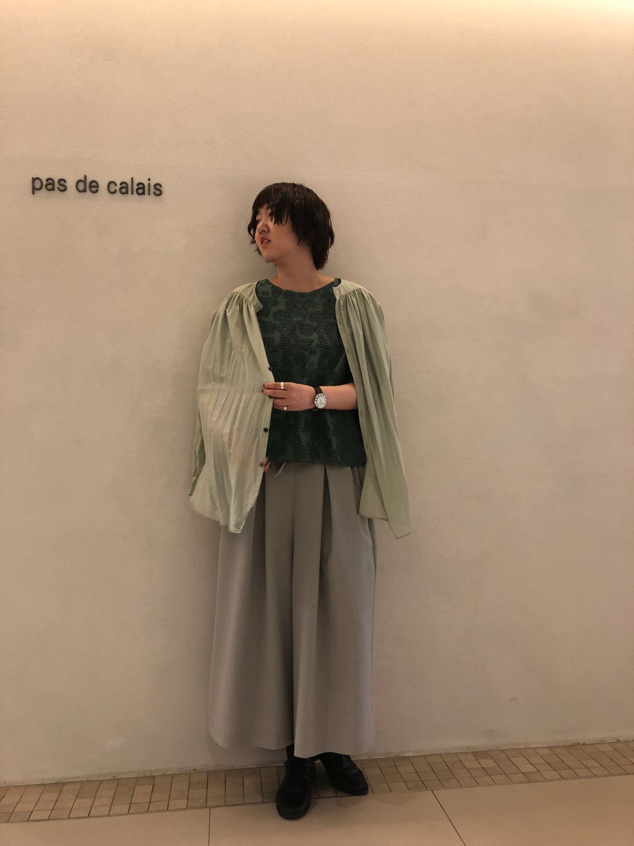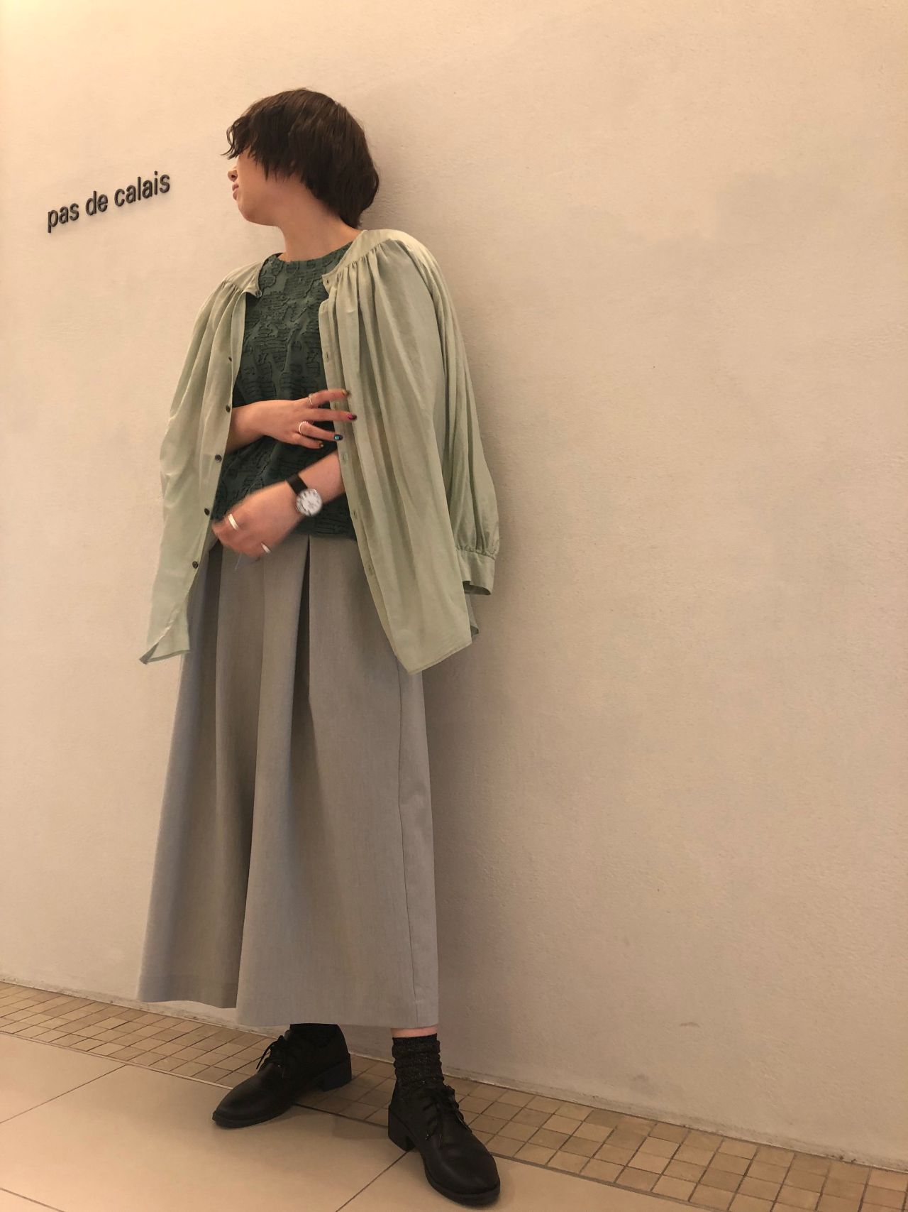 様々な種類のグリーンを合わせ春らしいコーディネートを。