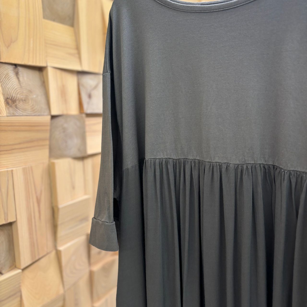 切り替え部分はドレープ性のあるレーヨンタイプライターをふんだんに使い、動きのあるシルエットに。