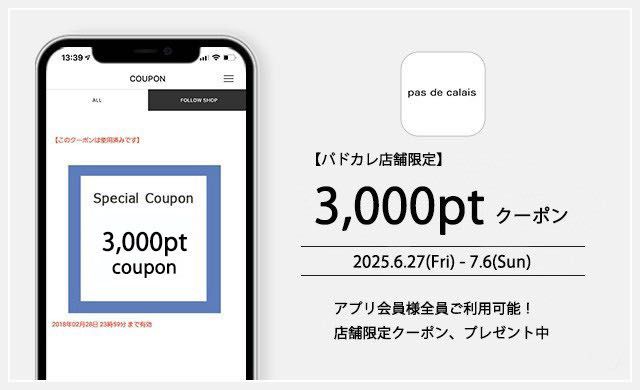 6月27日(金)〜7月6日(日)の期間中、パドカレからのSUMMER GIFTとして、公式アプリダウンロード、税込33,000円以上ご購入で、その場で使える3,000ポイントをプレゼントいたします。