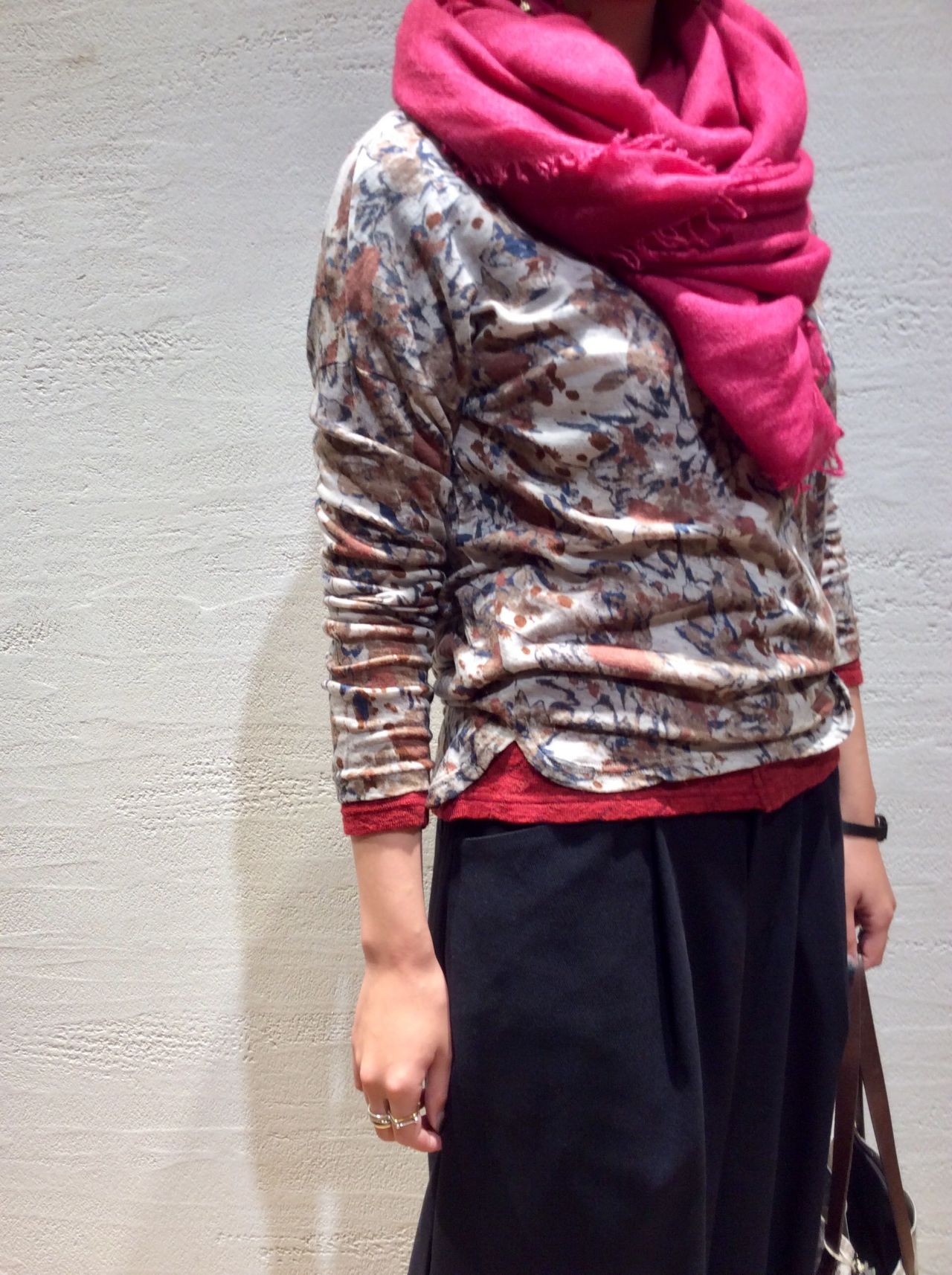 ビビットなカラーのストールとカットソーを差し色にして華やかなコーディネートに。