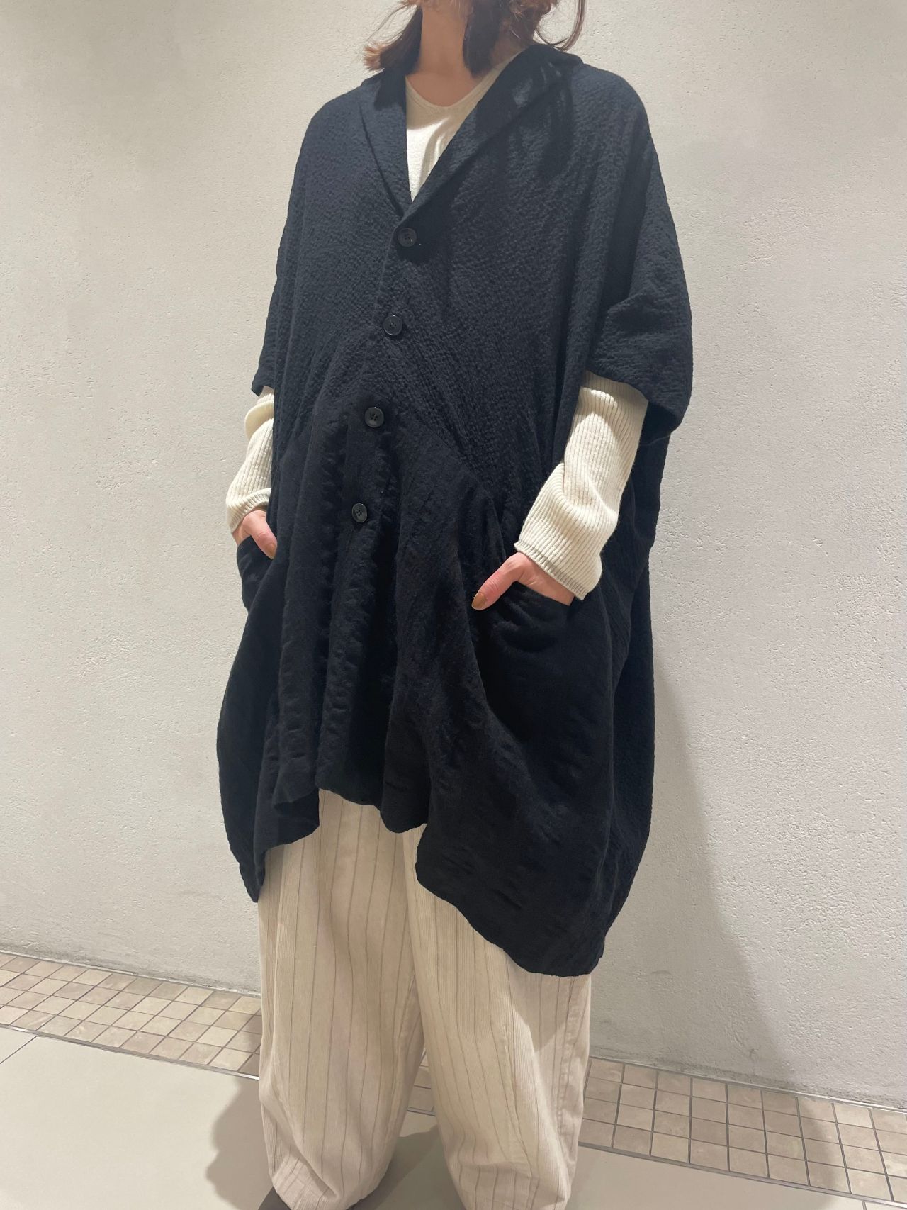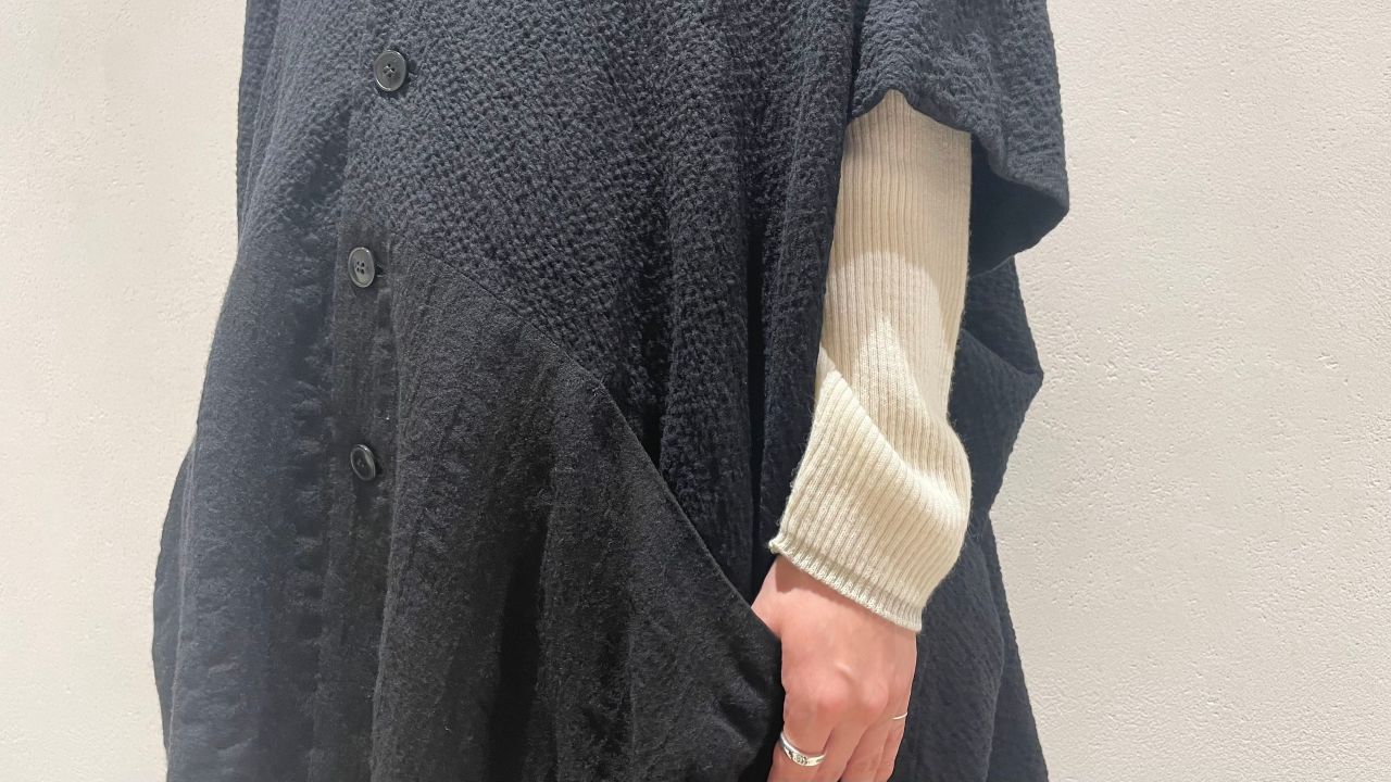 袖はないものの肘、お尻まですっぽりと隠れるサイズ感です。