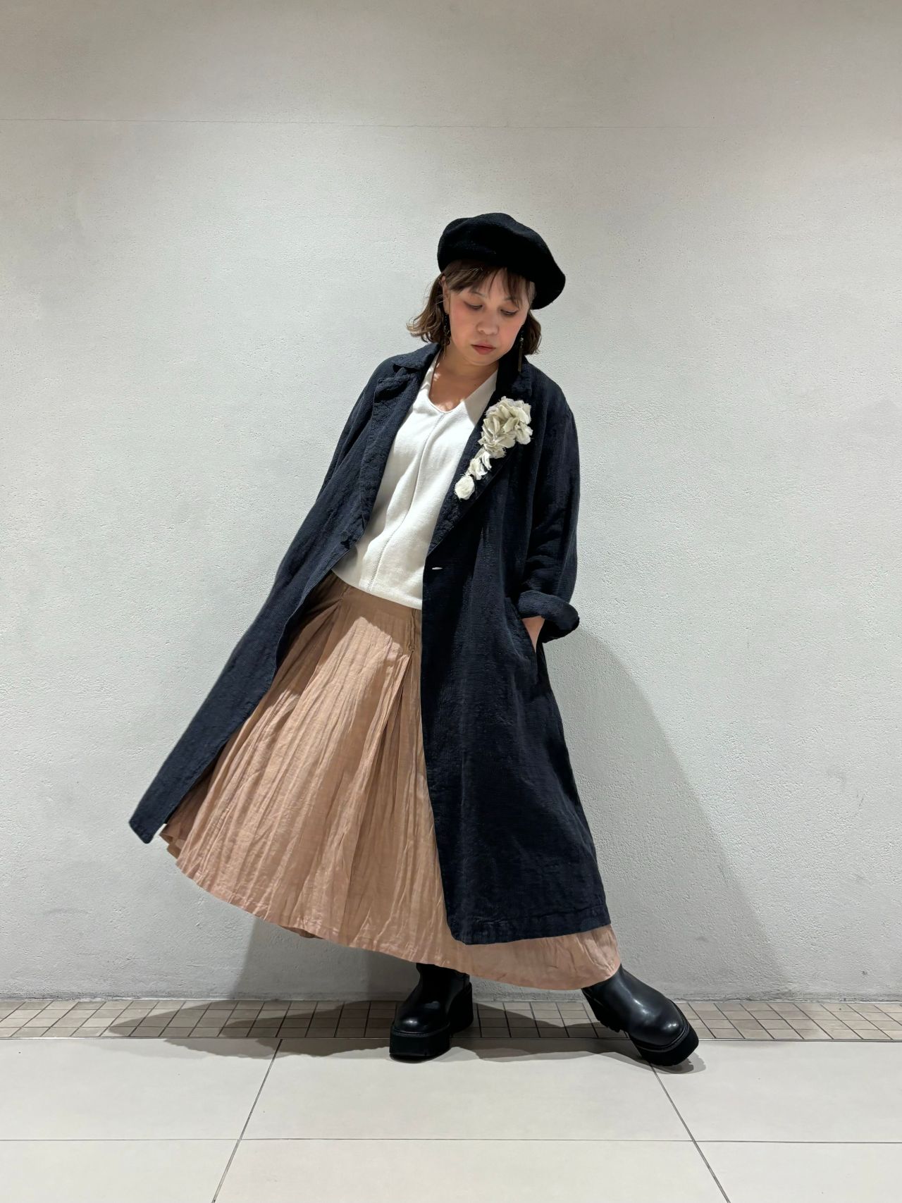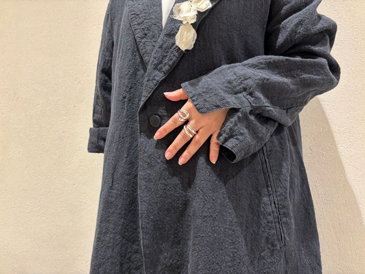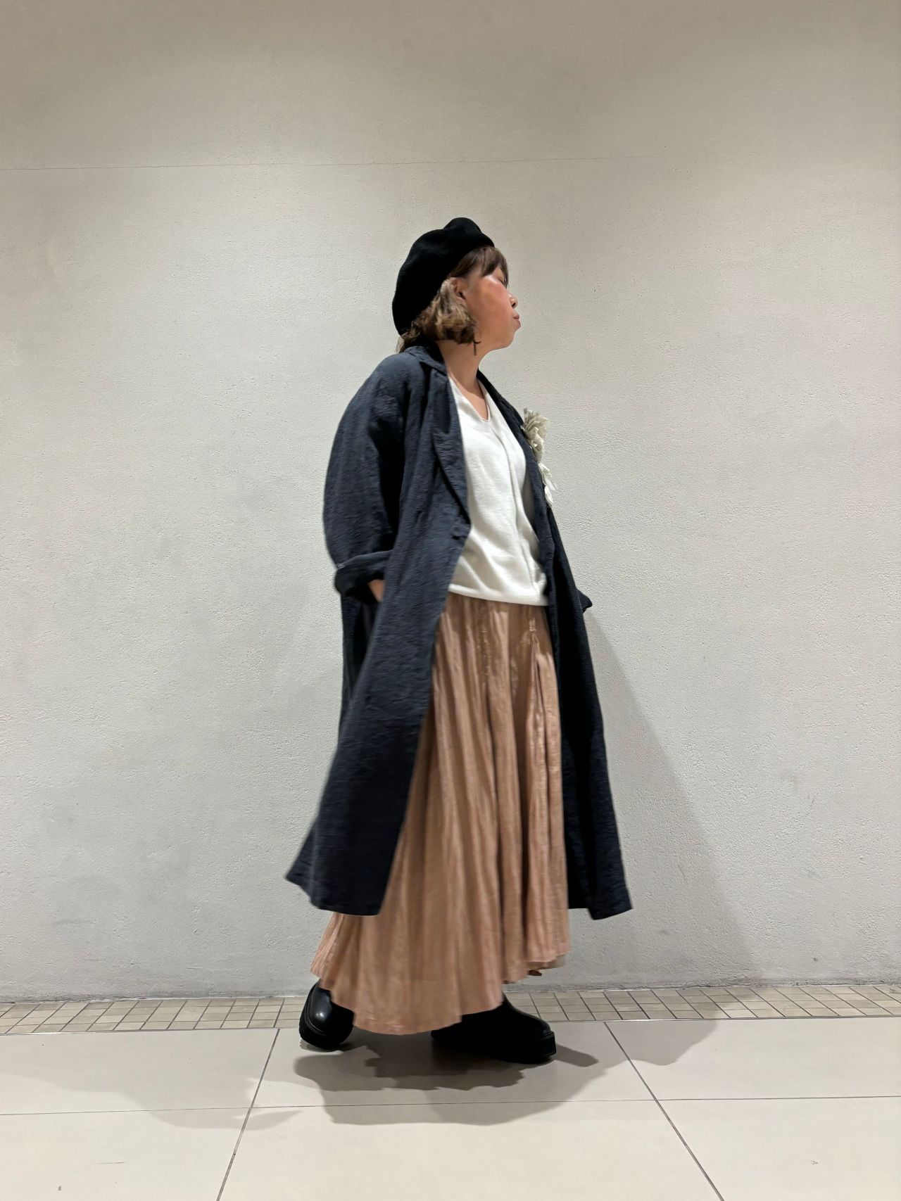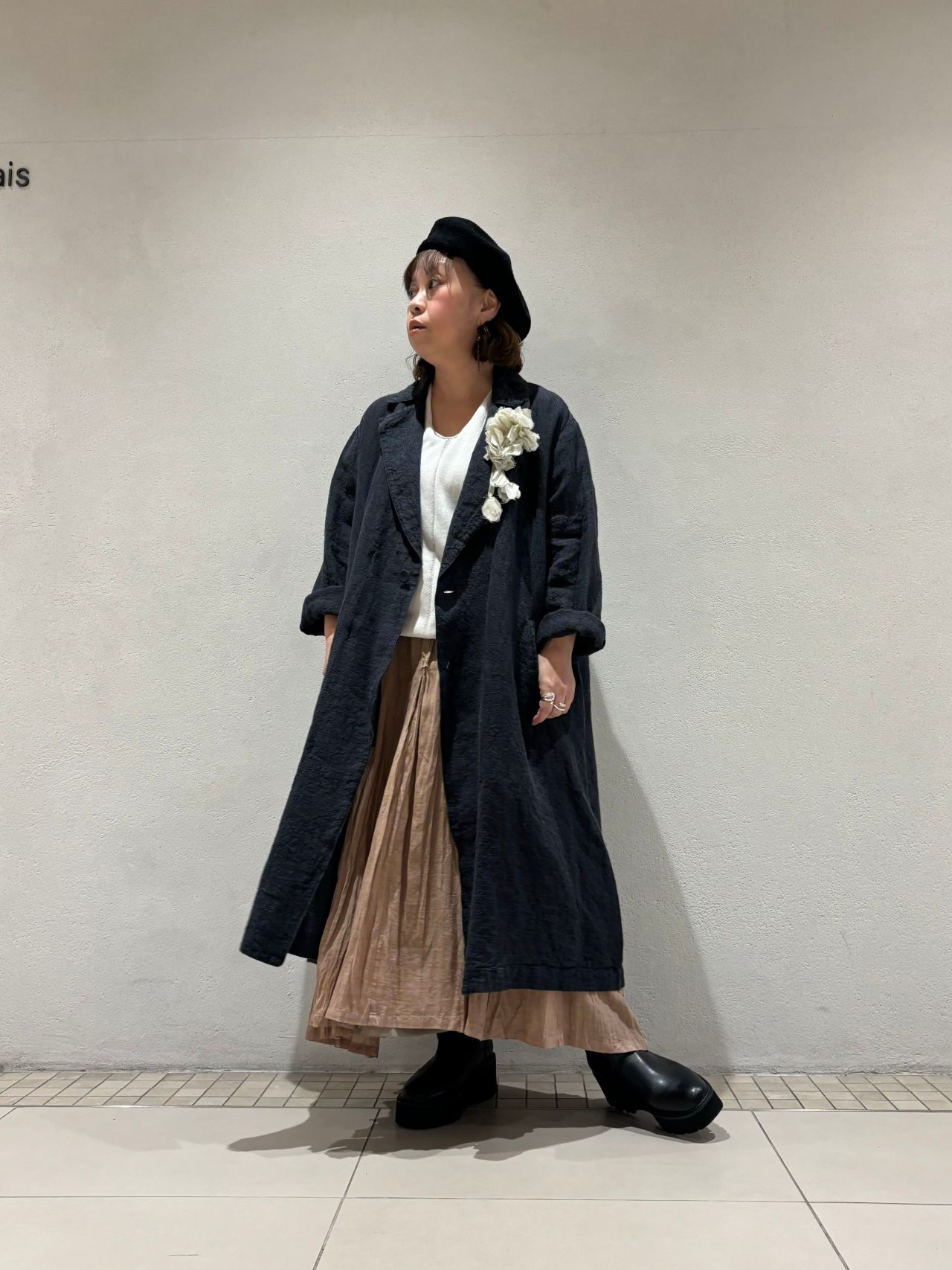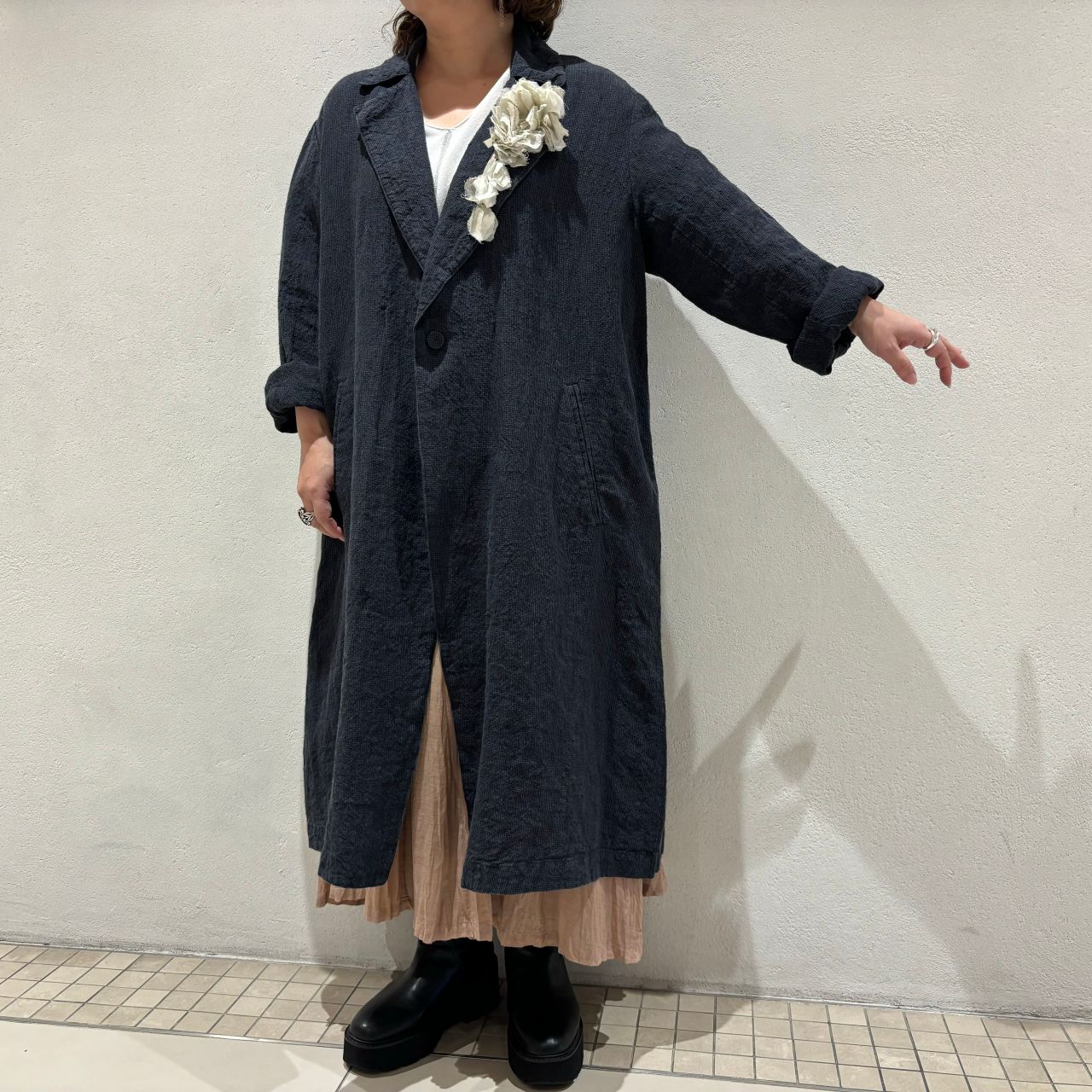 コートも無駄のないAラインシルエット。裏なしの一枚仕立てでチャコールカラーでも軽やかな雰囲気です。