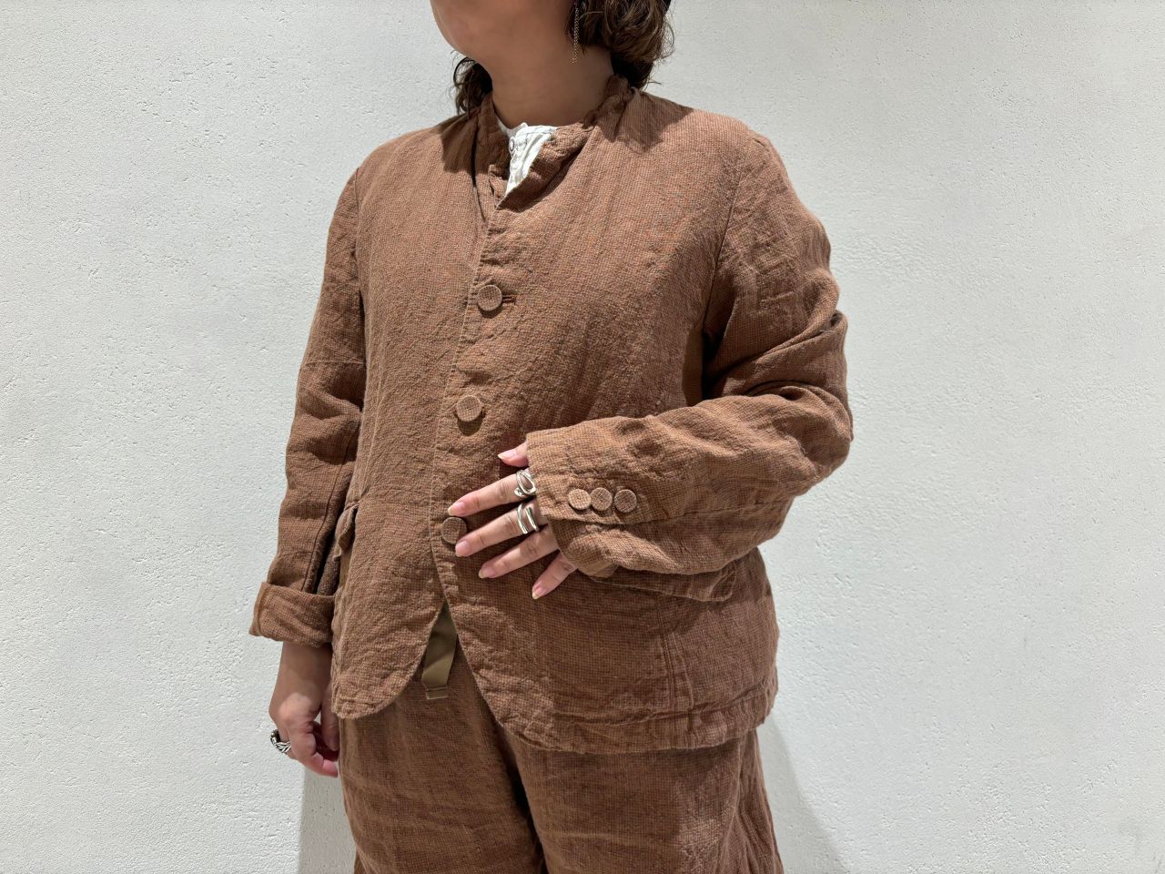 スタンドカラーのジャケットはすっきりとしたシルエットかつ、ウエスト裏にテープが通り、シルエットの変化が可能。コンパクトなサイズ感がボトムを選ばず重宝します。