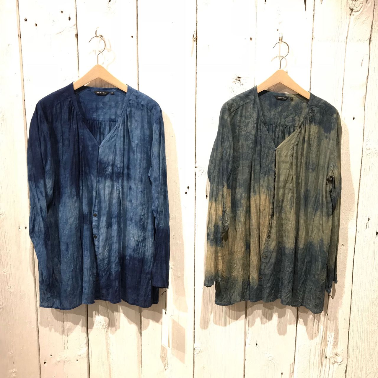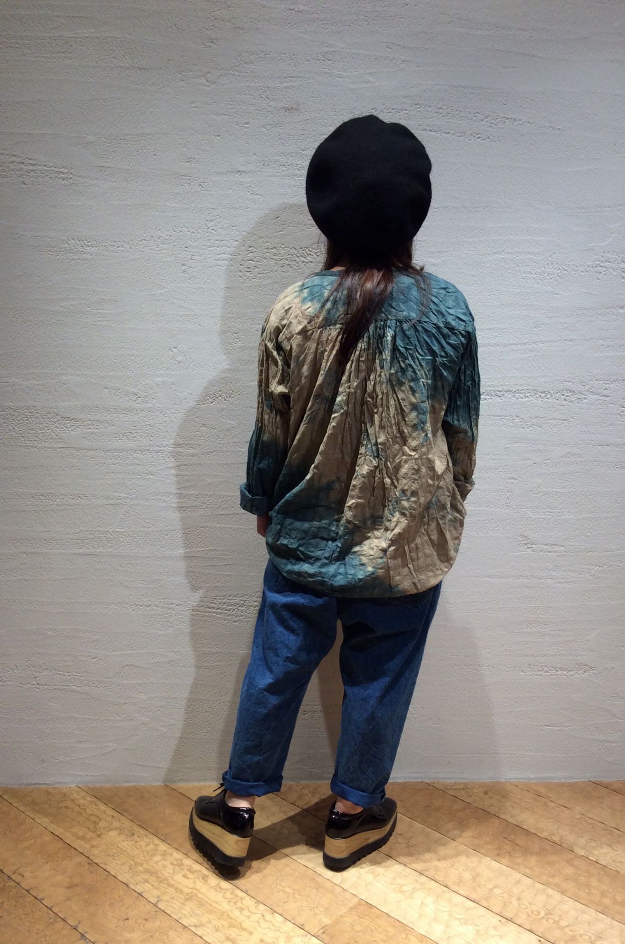 ネイビーは藍染めの濃淡のムラ染め、モスグリーンは、渋木の草木染めの後、藍染めでムラをつけました。製品を手でくしゃくしゃっと丸めて手作業で染めているので、1つとして同じ柄を作り出せない1点物です。
