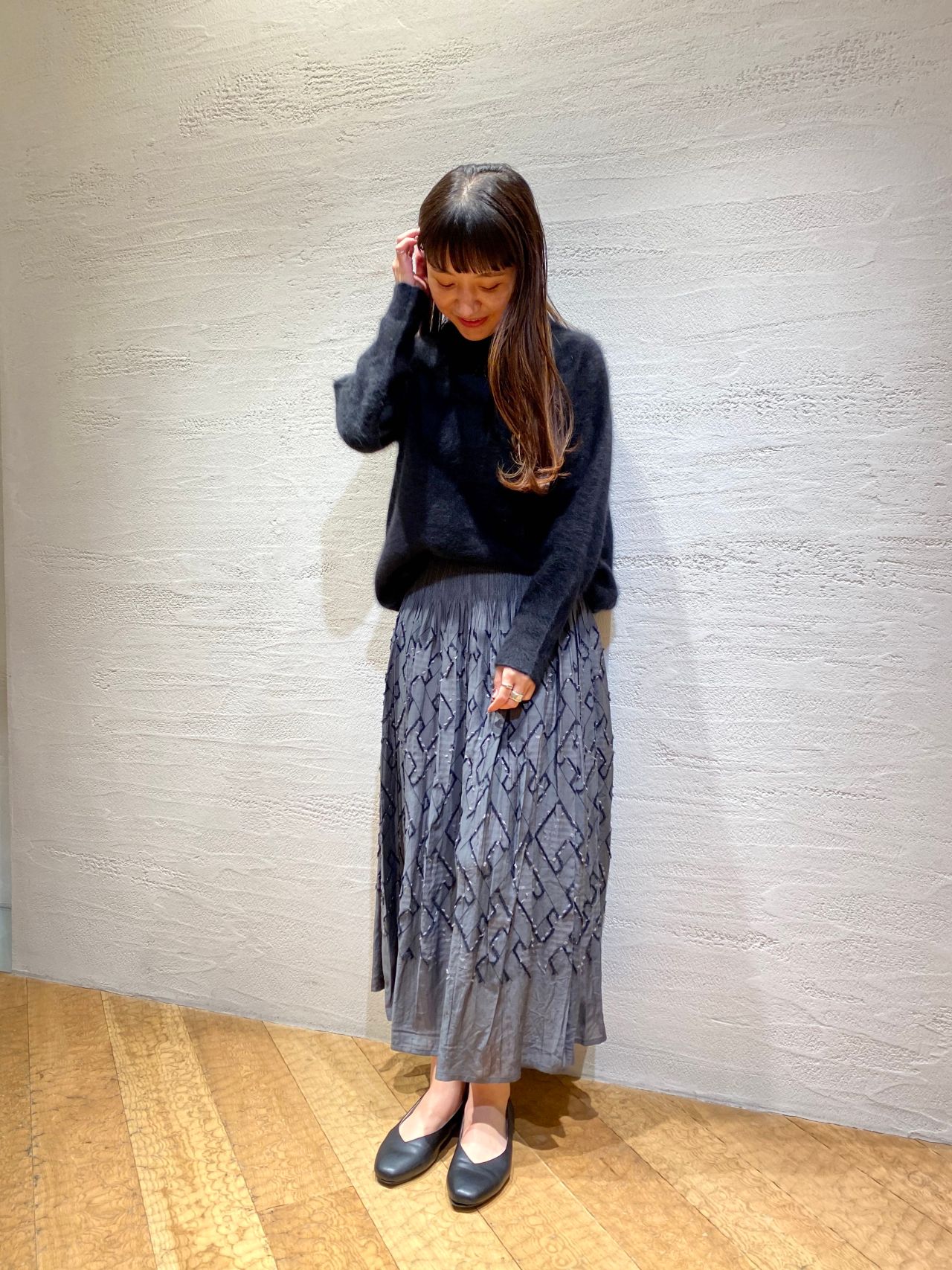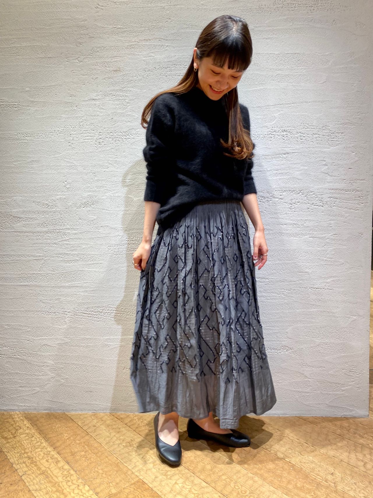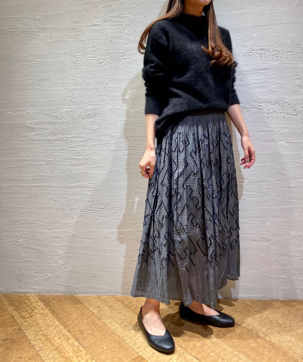 パドカレ大人気のラクーンニットに柄のスカートを合わせたコーディネート。