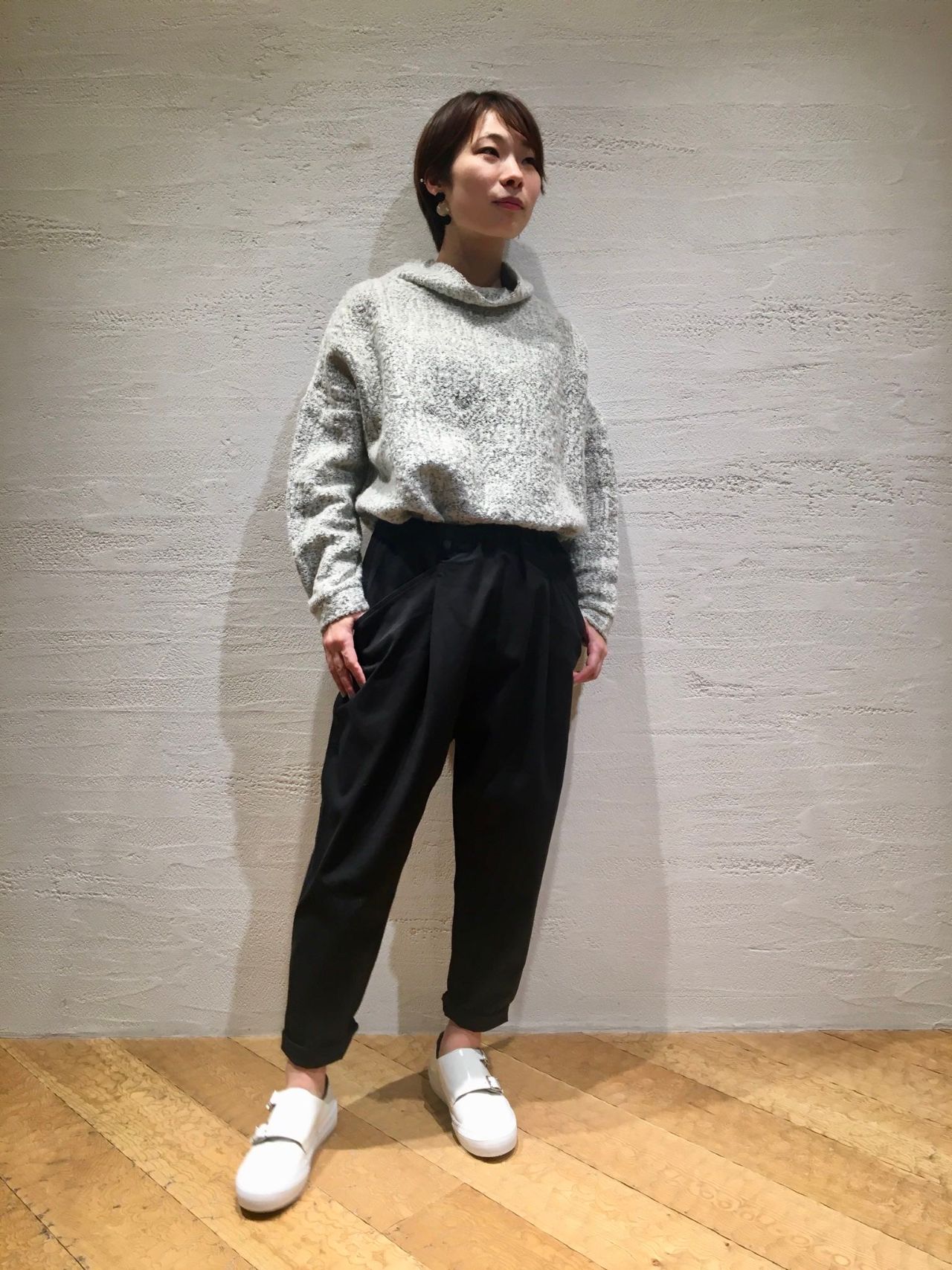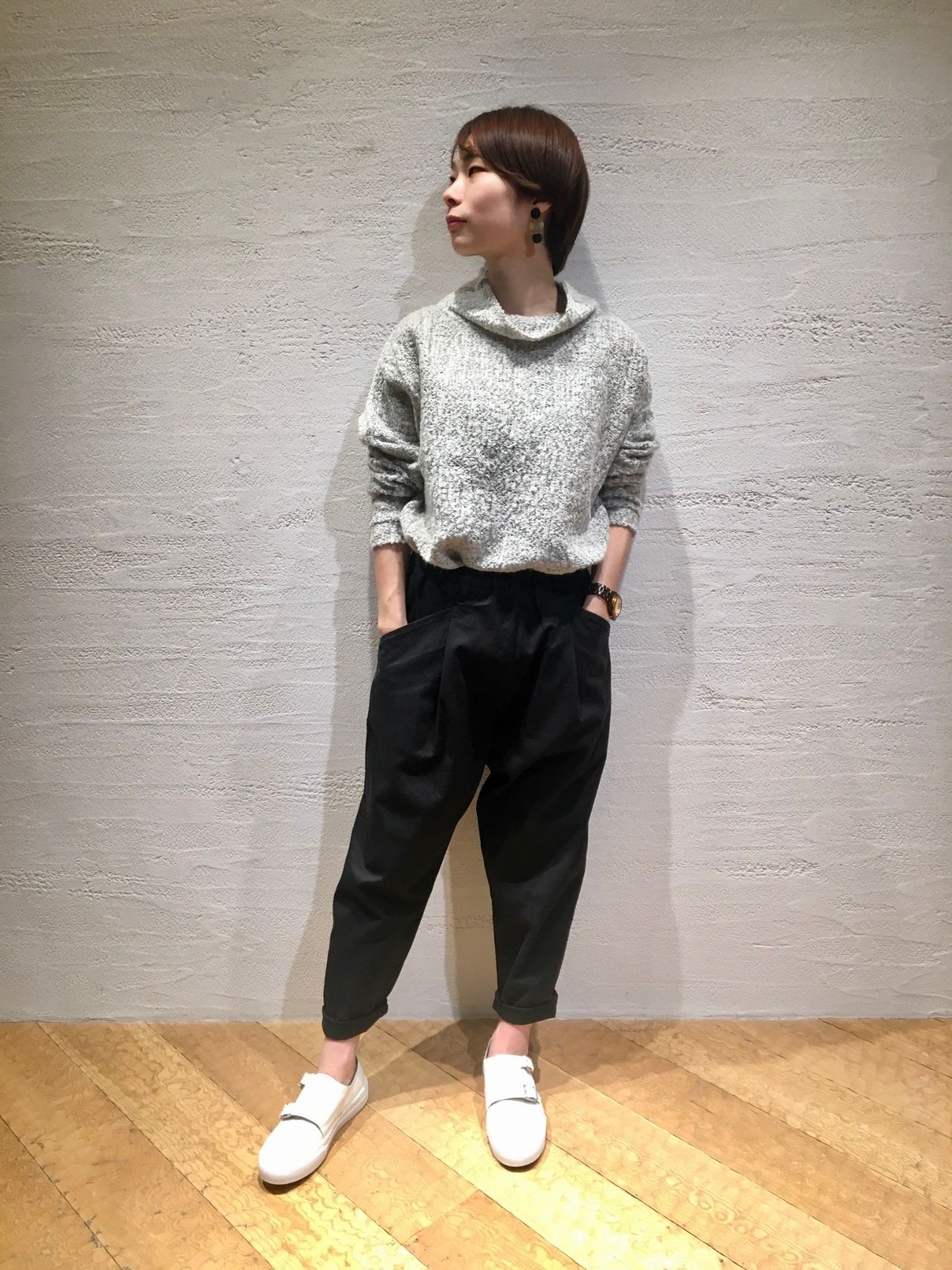ゆったりとしたトップスにパンツを合わせてスッキリとした印象に。