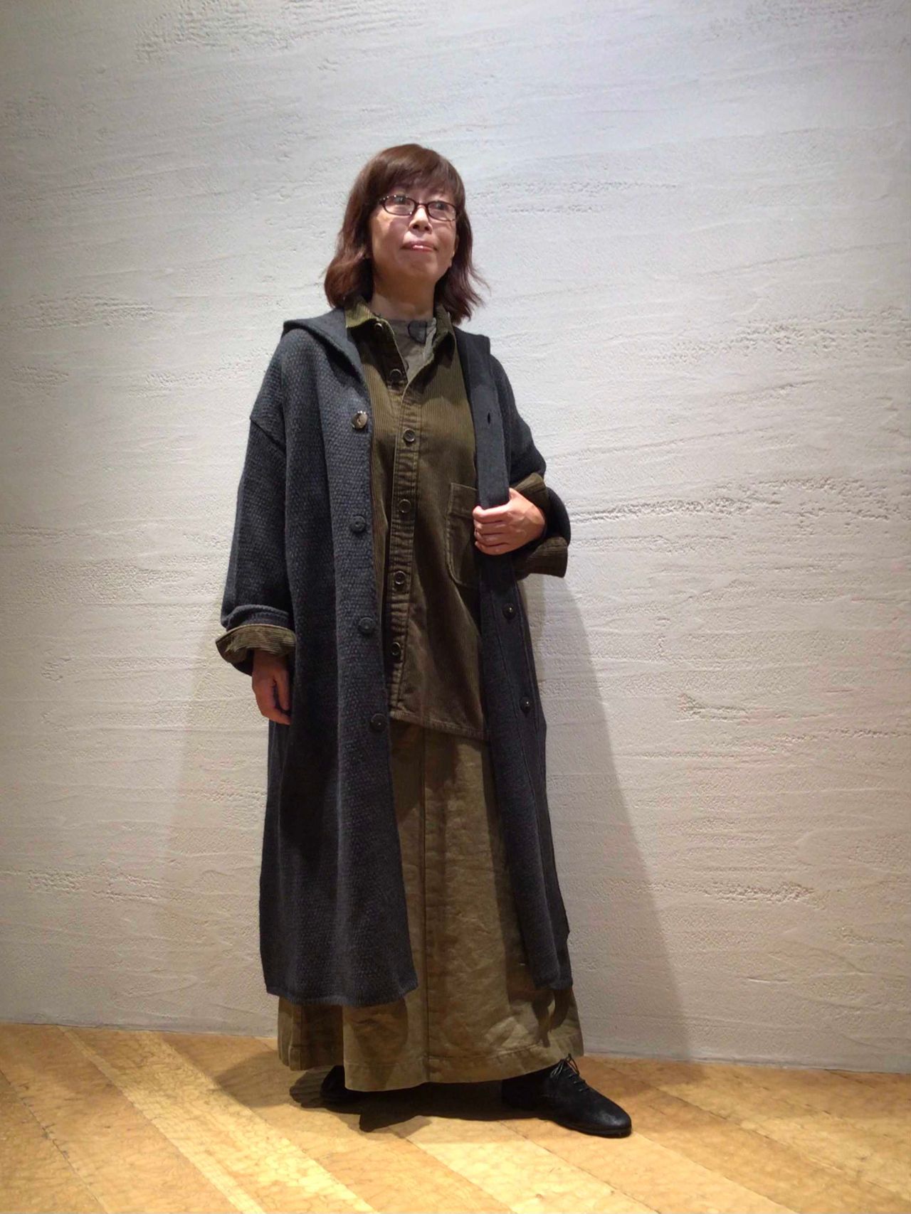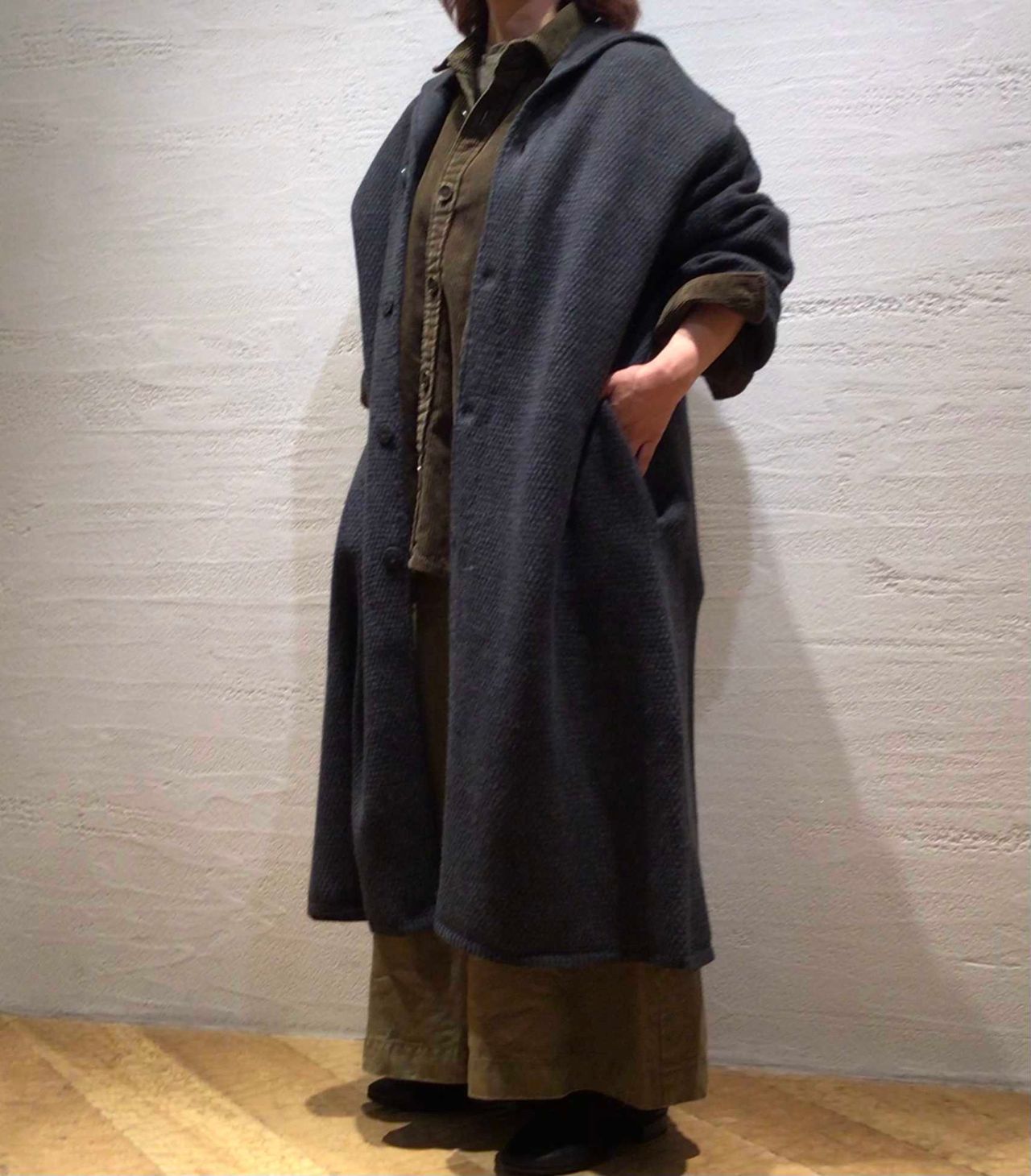 まずはニットローブのインアイテムとしてスタイリング。