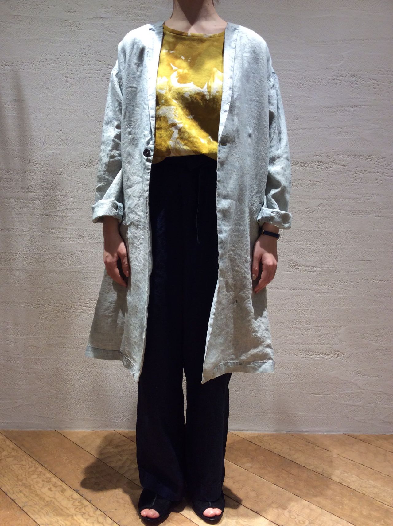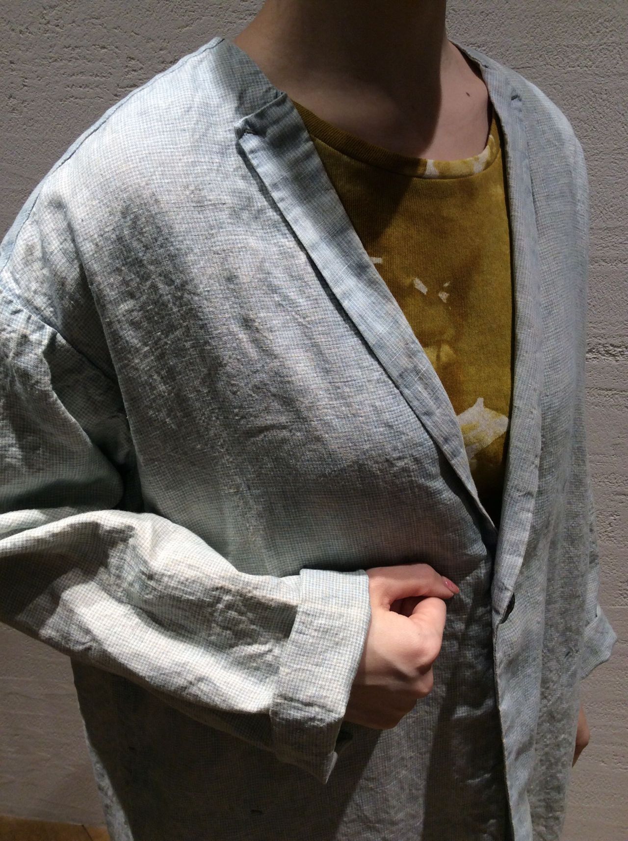 先染めリネンインディゴギンガムコート〈着用:ブルー〉