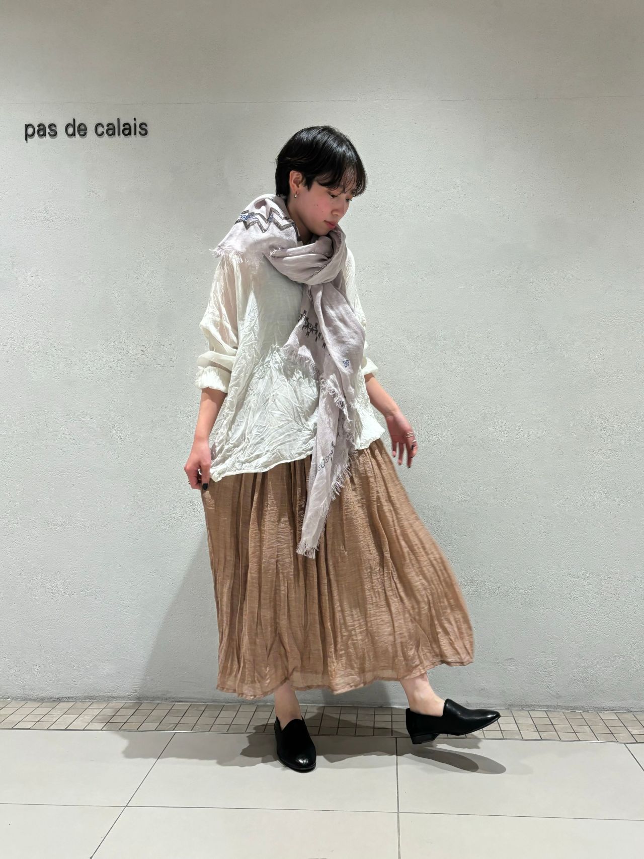 ブラウスは前端、袖口に異素材の切り替えをほどこしパドカレらしいデザインに。