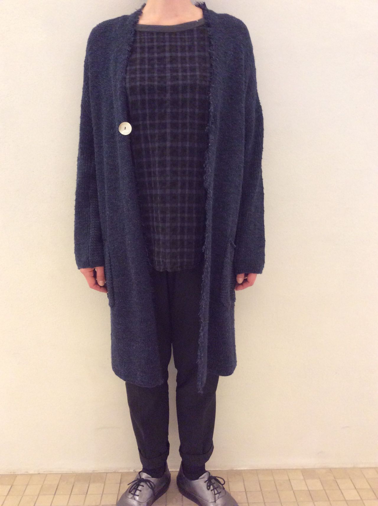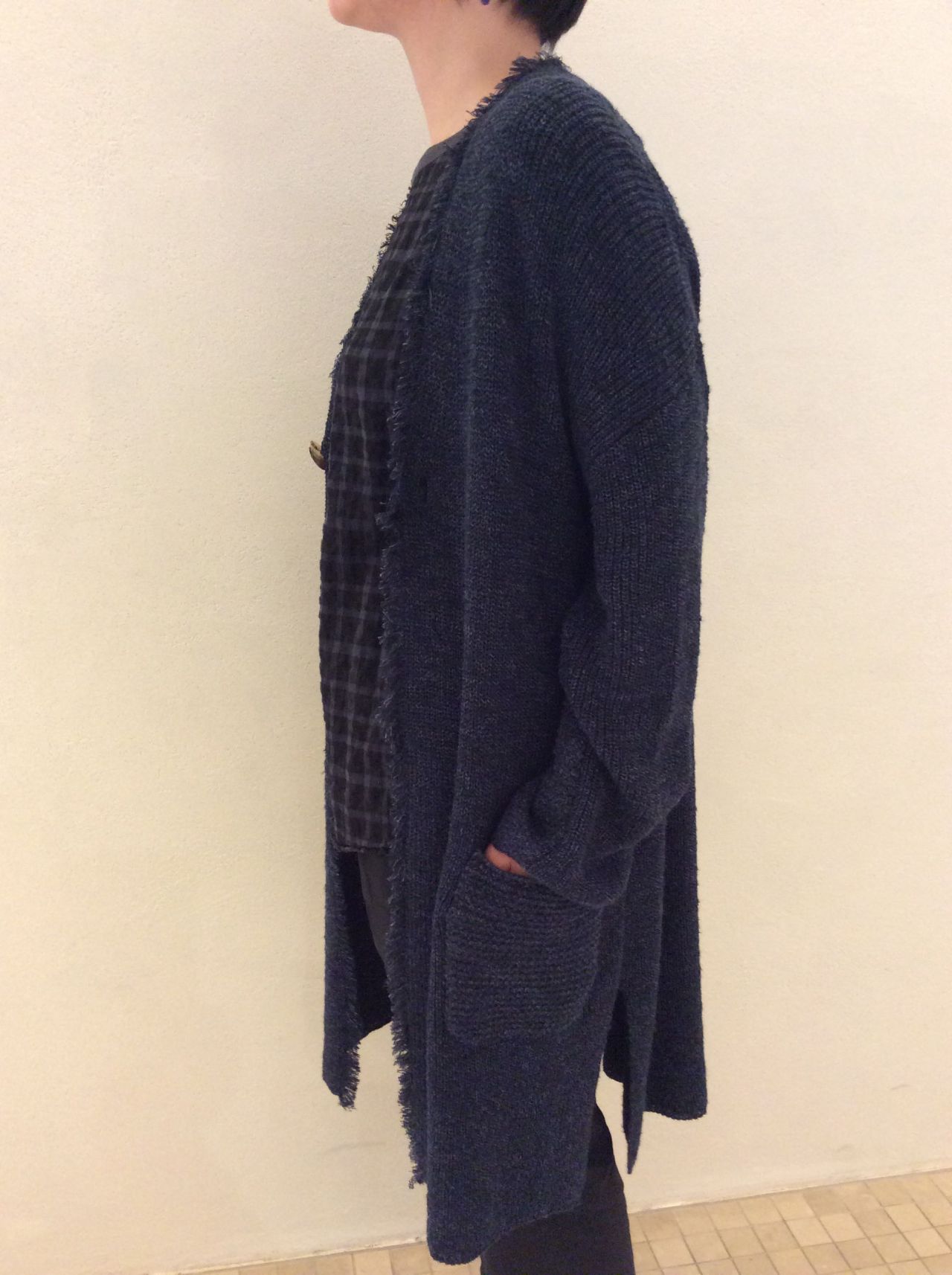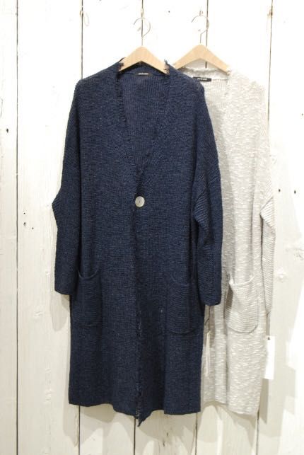 ざっくりとした畦編みと立体感のあるリネンスラブ糸を加えた事でこの時期コート代わりにもなるお勧めロングカーディガンです。