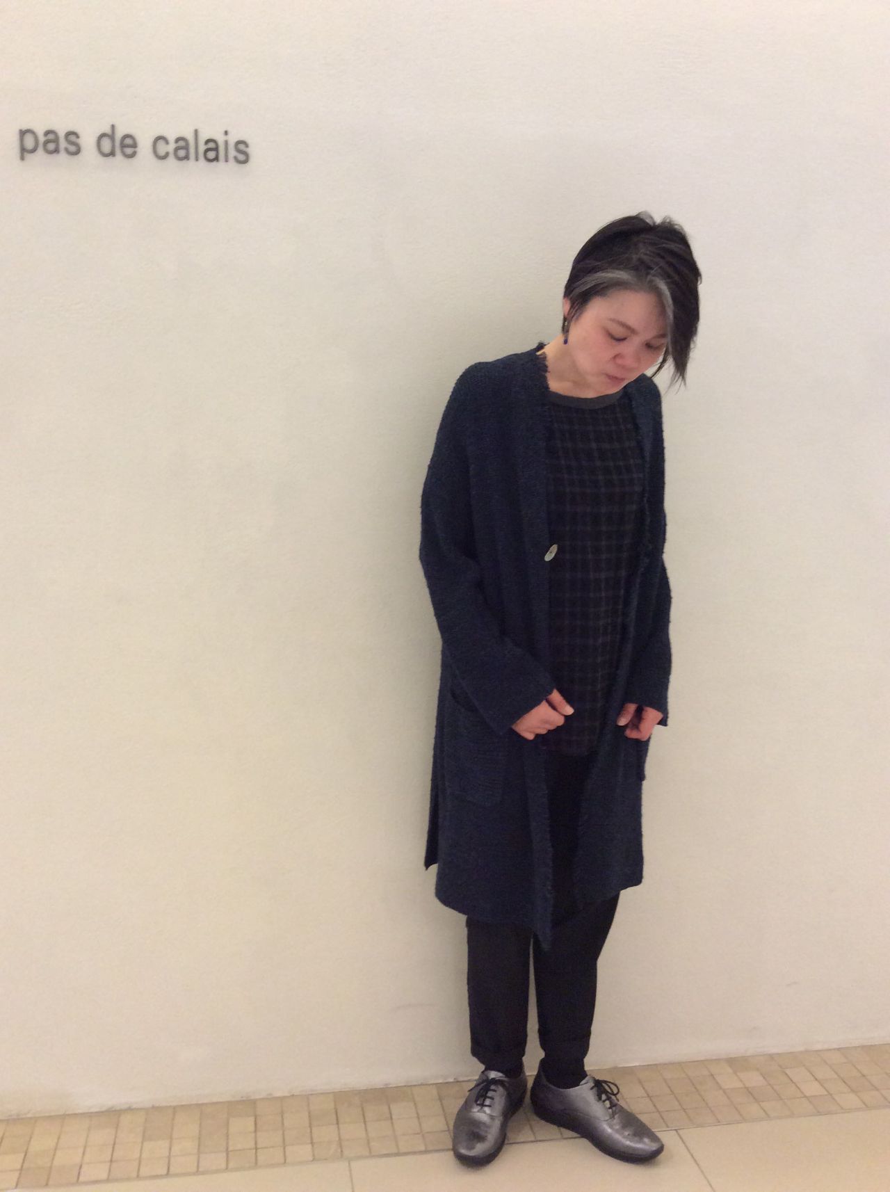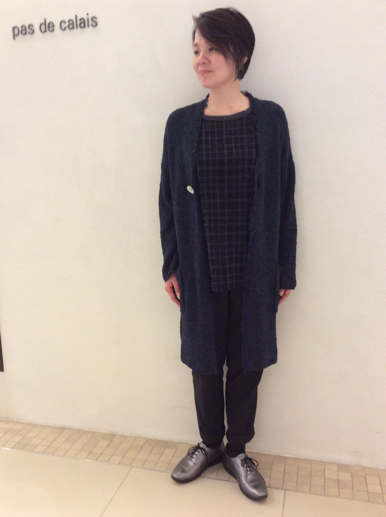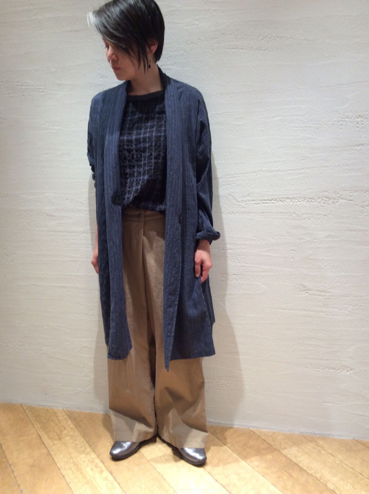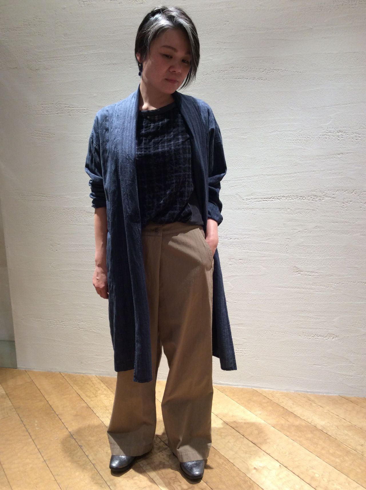 ネイビー系のワントーンコーディネートですが、ブラウスのチェックと透け感がポイントとなり、重くなりません。
