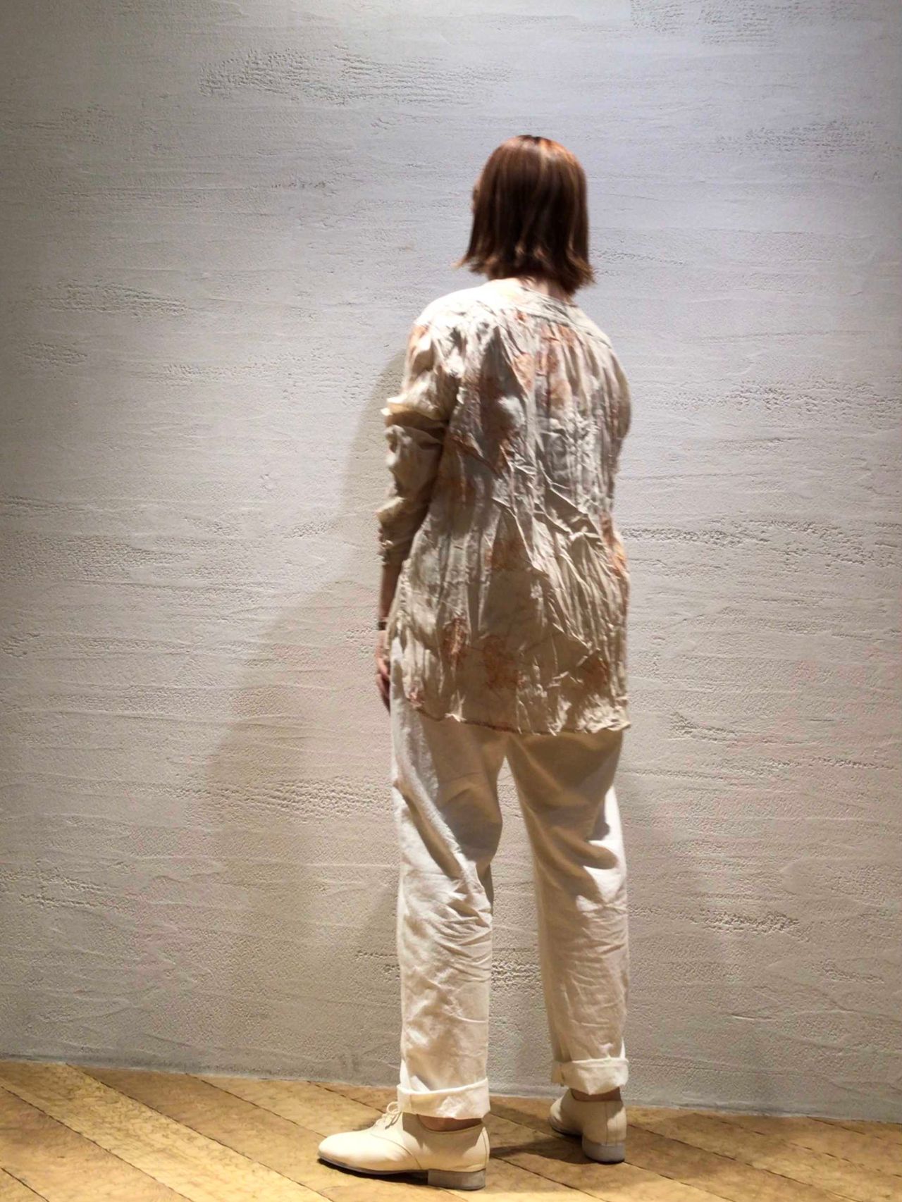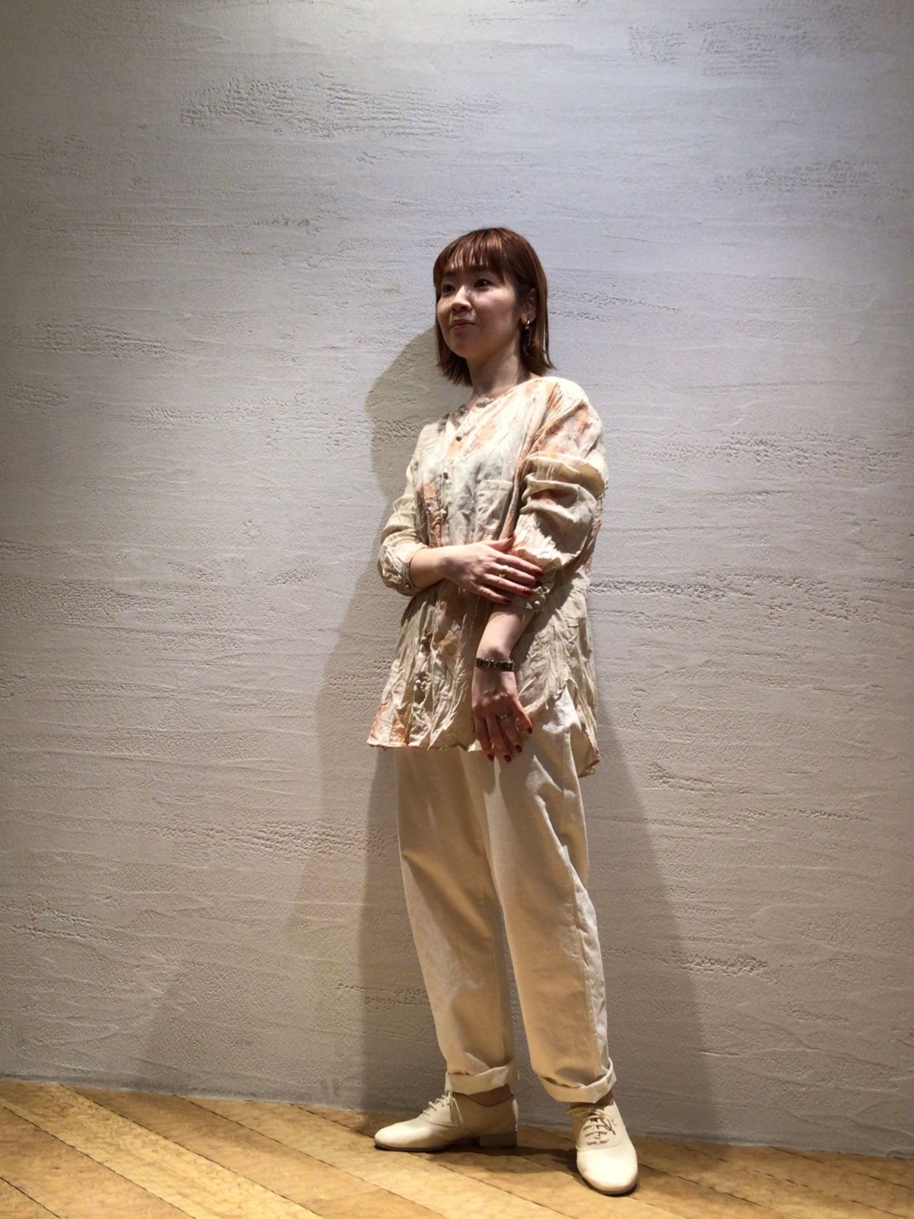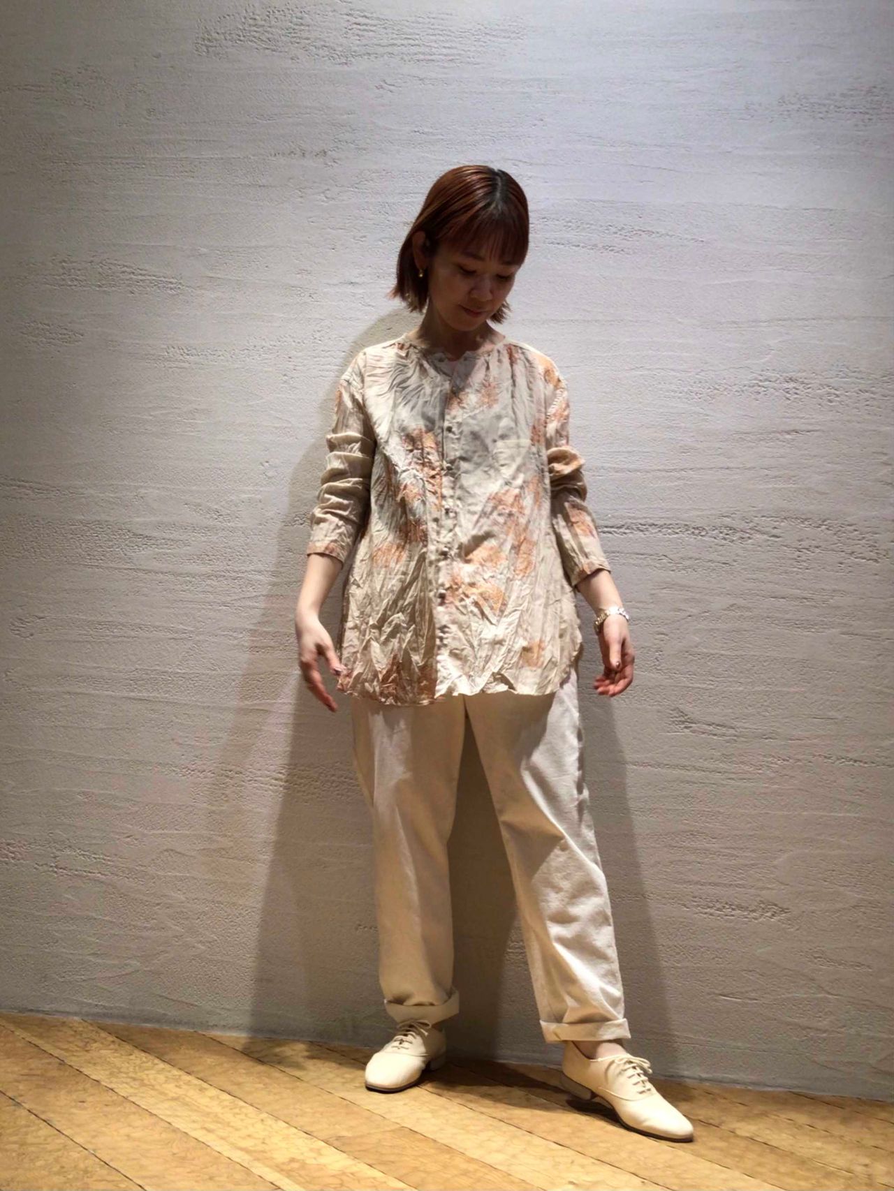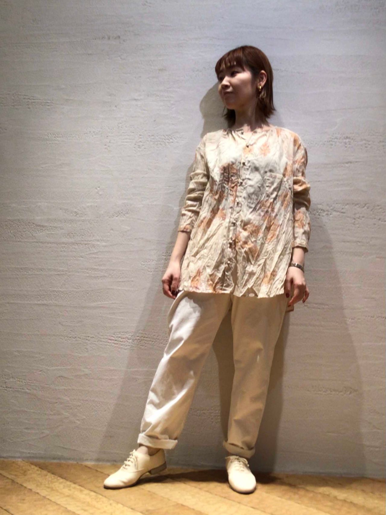 繊細なHiganbanaのプリントが引き立つように同色のパンツでシンプルに合わせました。
