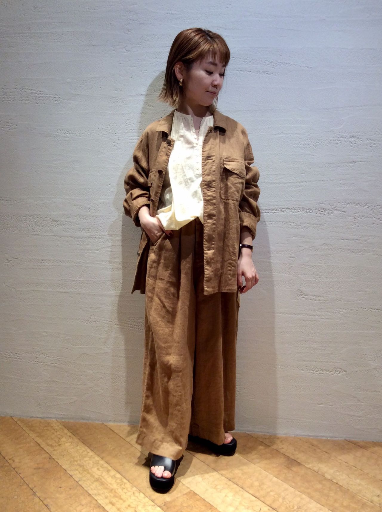 セットアップのジャケットを合わせて、朝晩の少し肌寒く感じる時間帯にも◎