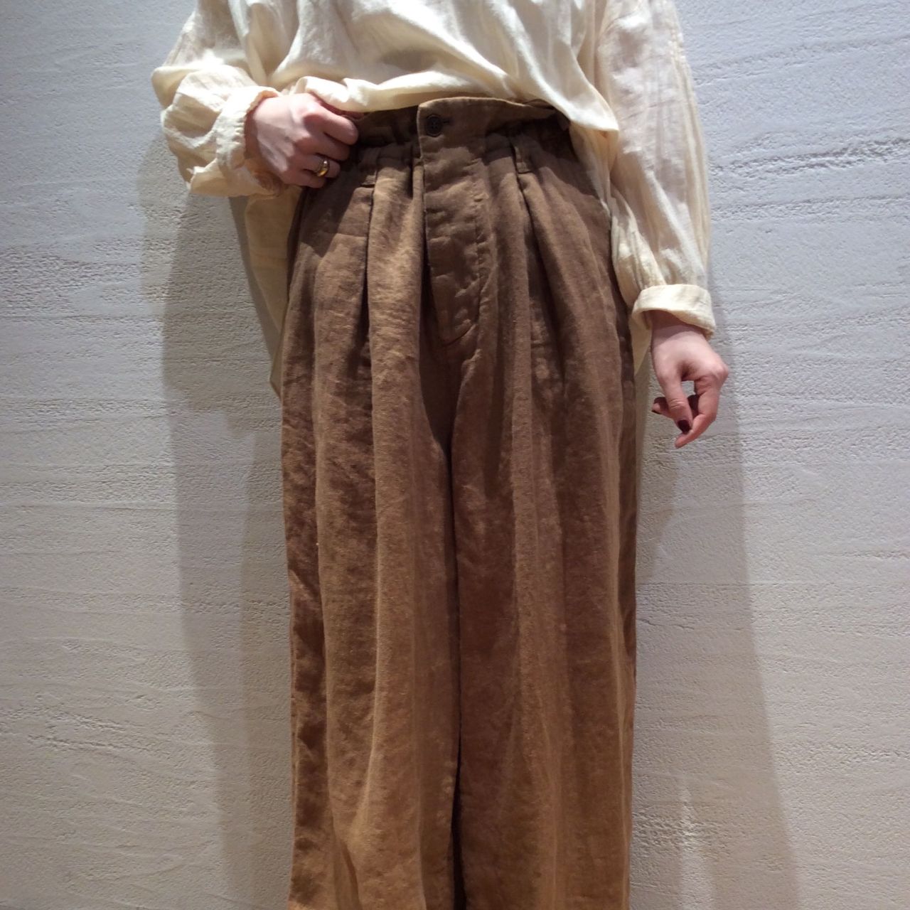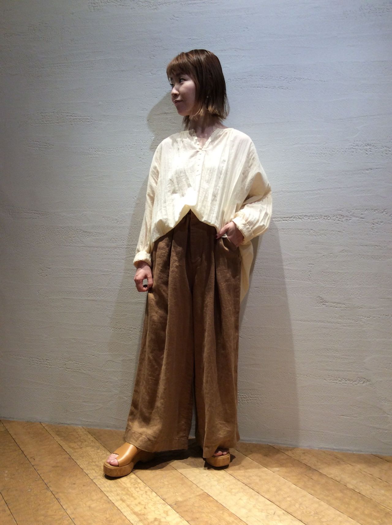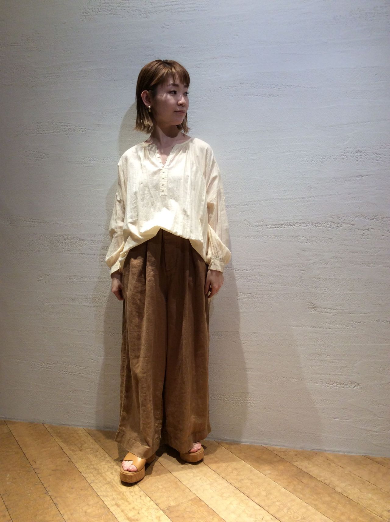 アプリコット染めならではのイエローオレンジを、同系色のパンツに合わせてフレッシュ感のあるコーディネートに。