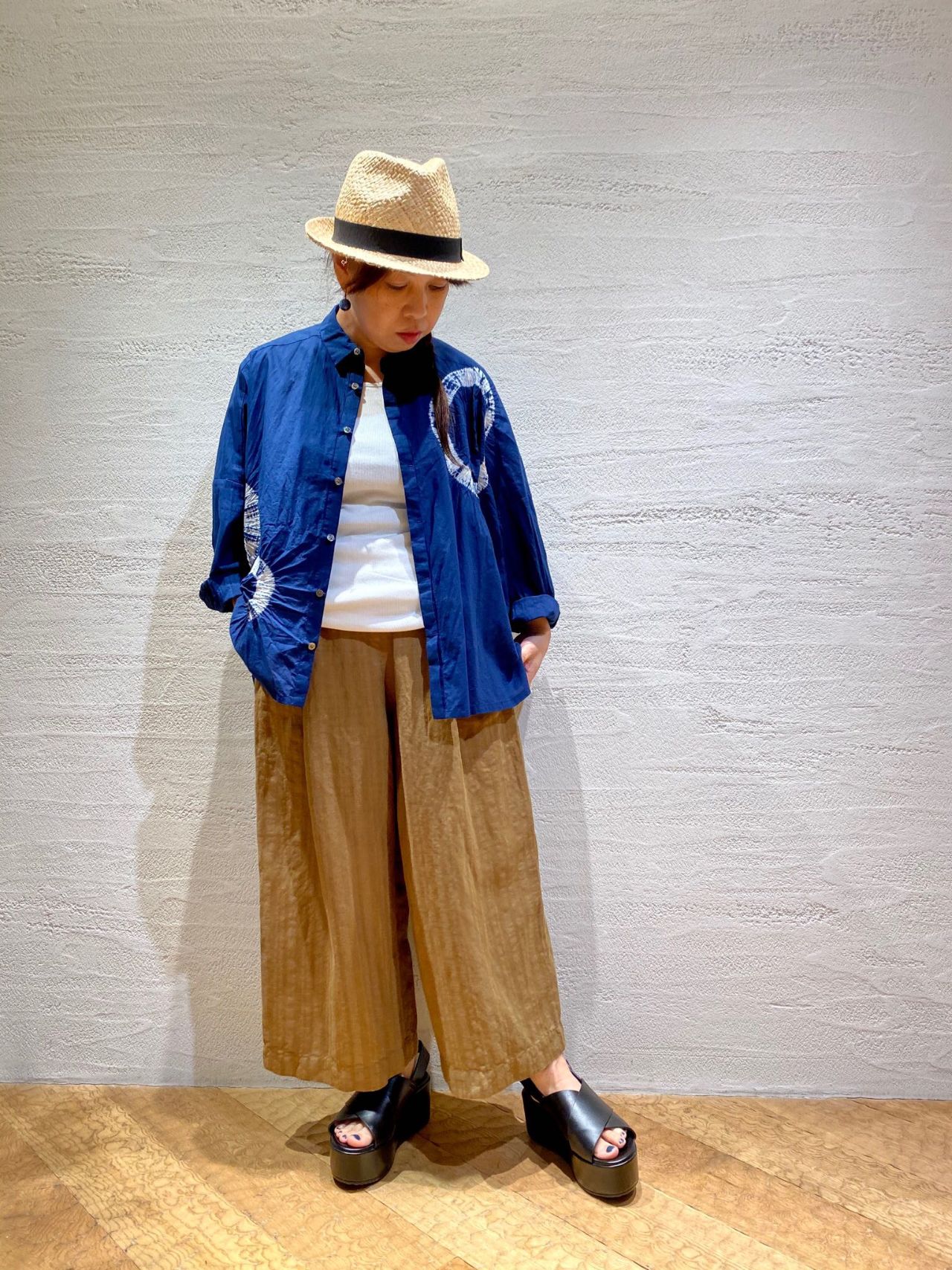 全開のブラウスなので、中にタンクトップのホワイトを効かせるのも爽やかですよ。