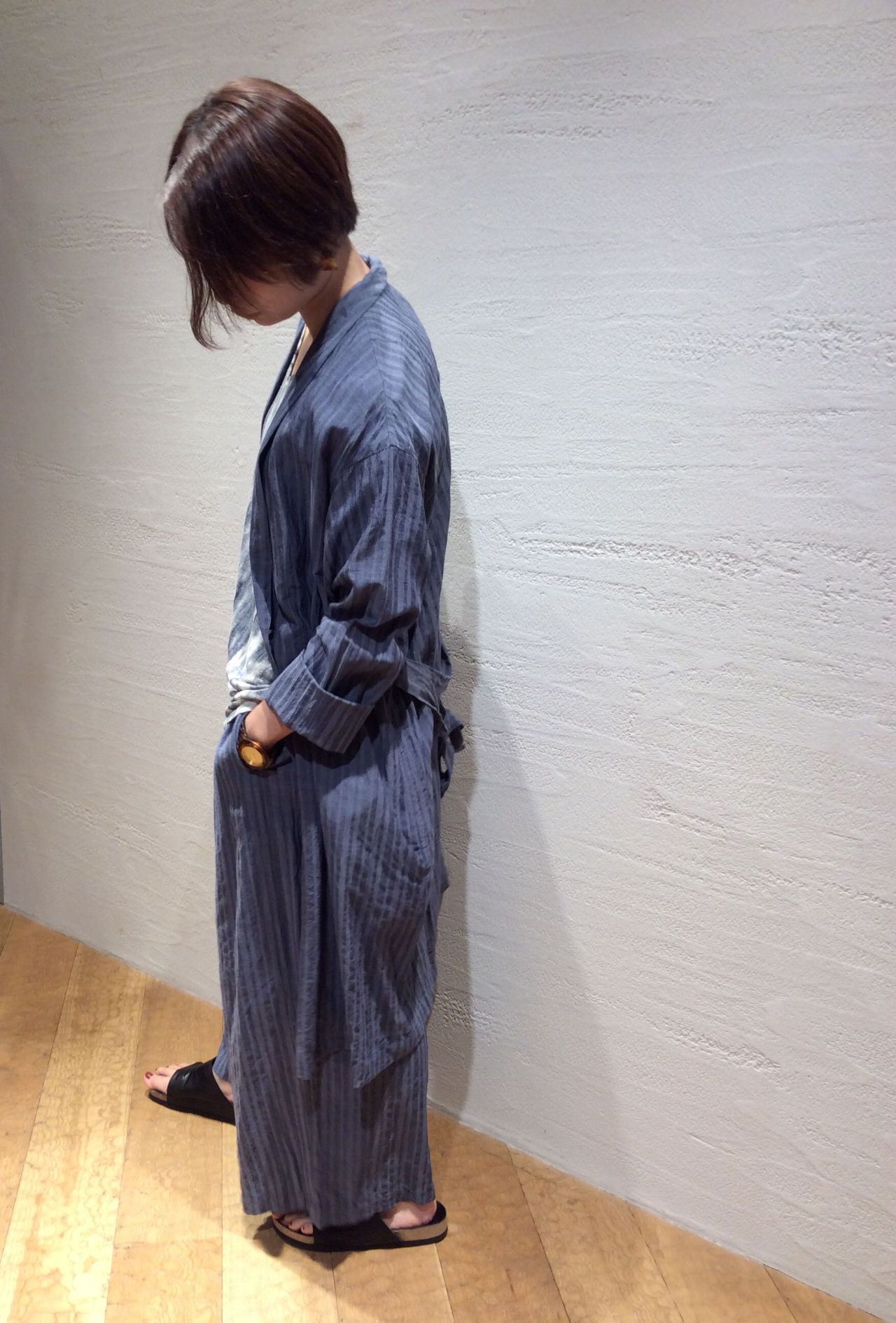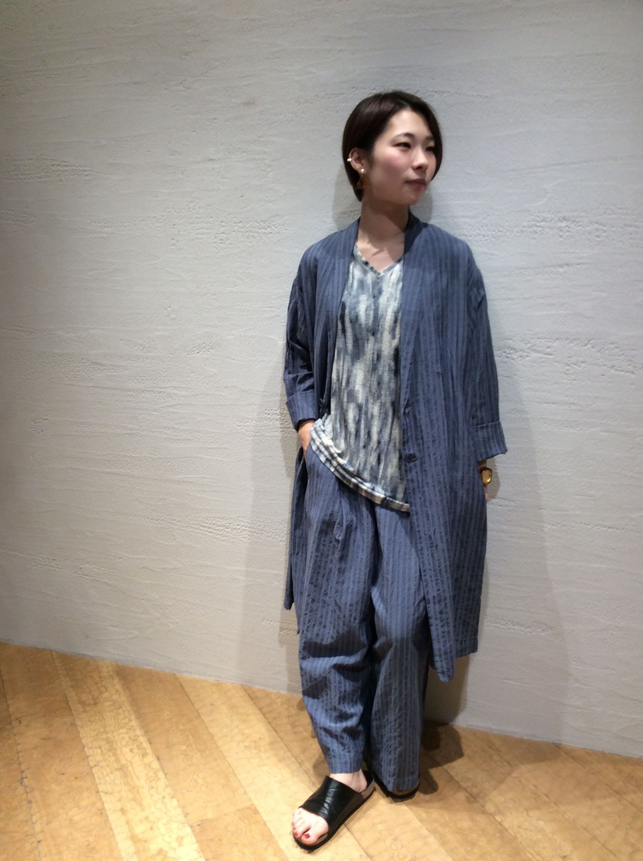 コットン/リネン/レーヨンストライプコート(着用:ブルー)
