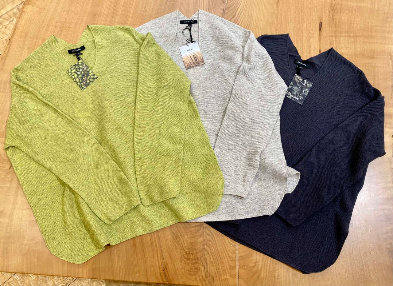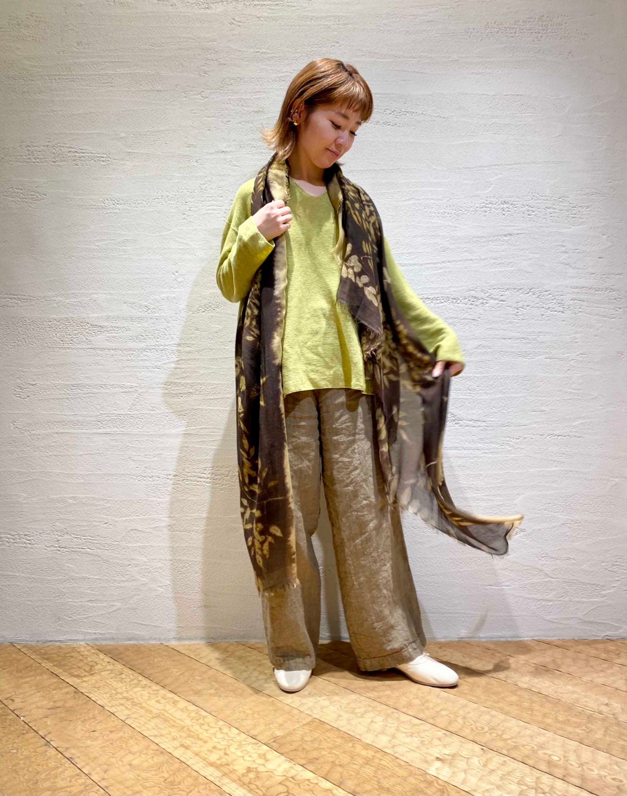 オリーブの枝葉で染め上げたカーディガンとプルオーバー。