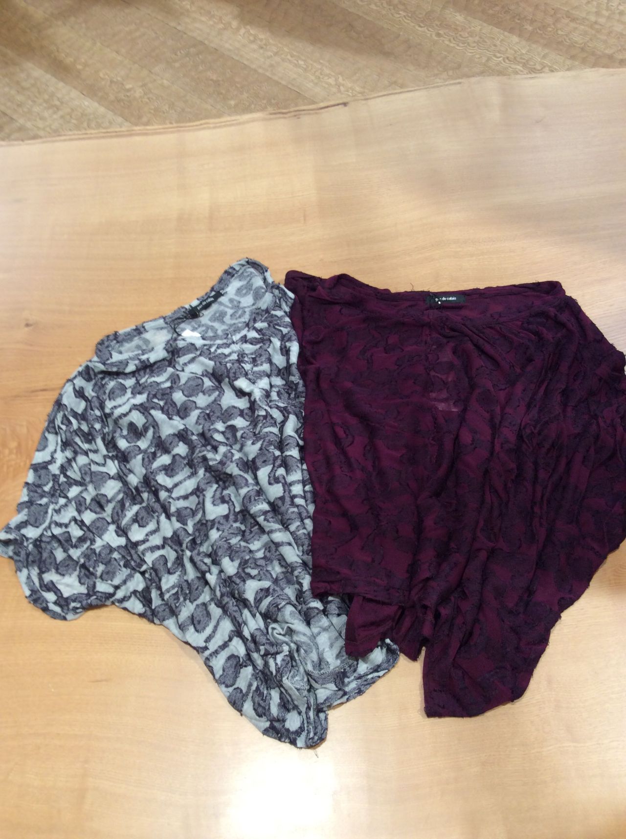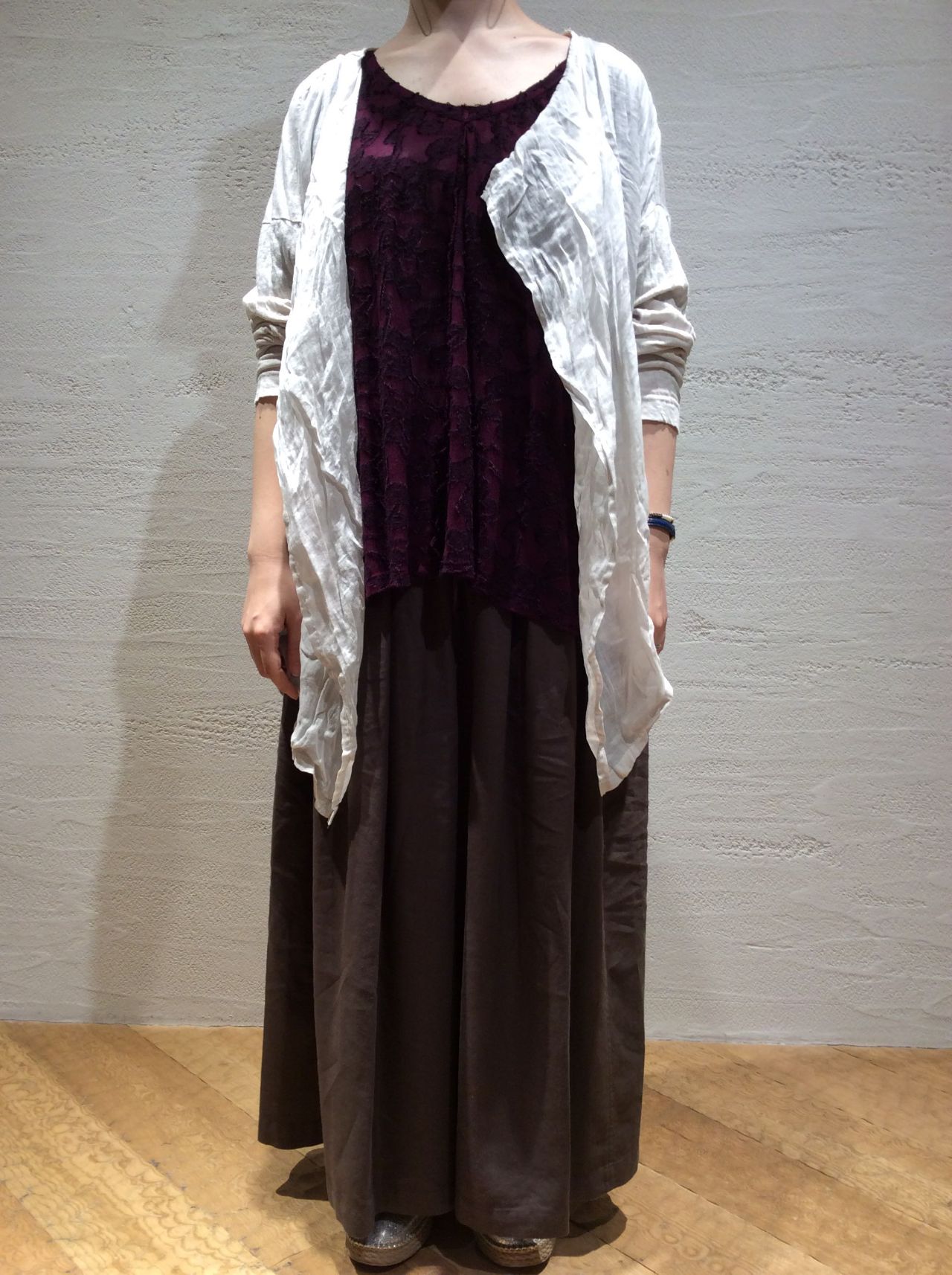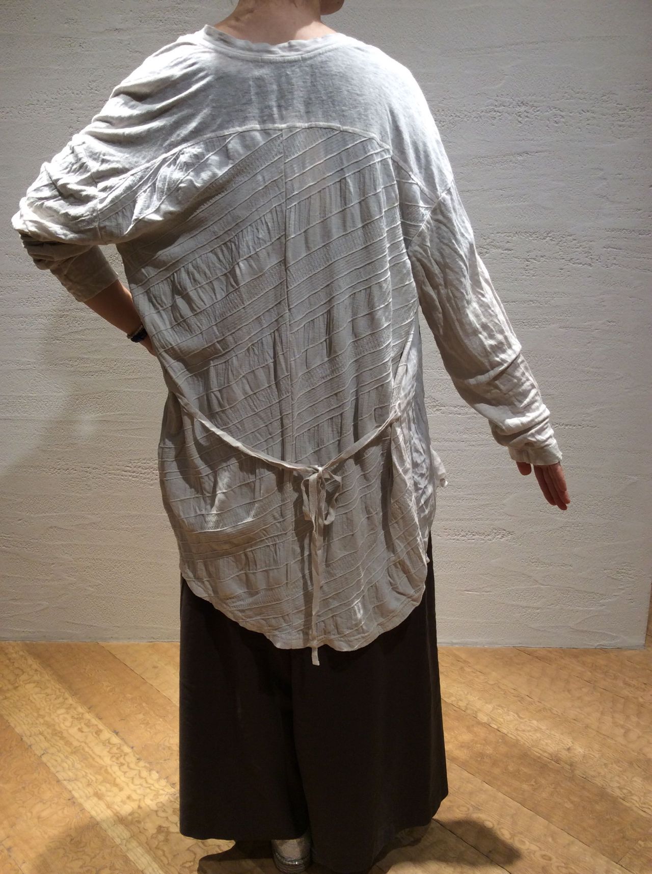 前身のラミーテンセルの布帛を使用し、左右を重ねたり、シワを利用してウエストヒモで縮めたり、ご自分で遊べる羽織物です。こちらは植物染で染めていて、部分部分の素材の違いで色の差をお楽しみ頂けます。