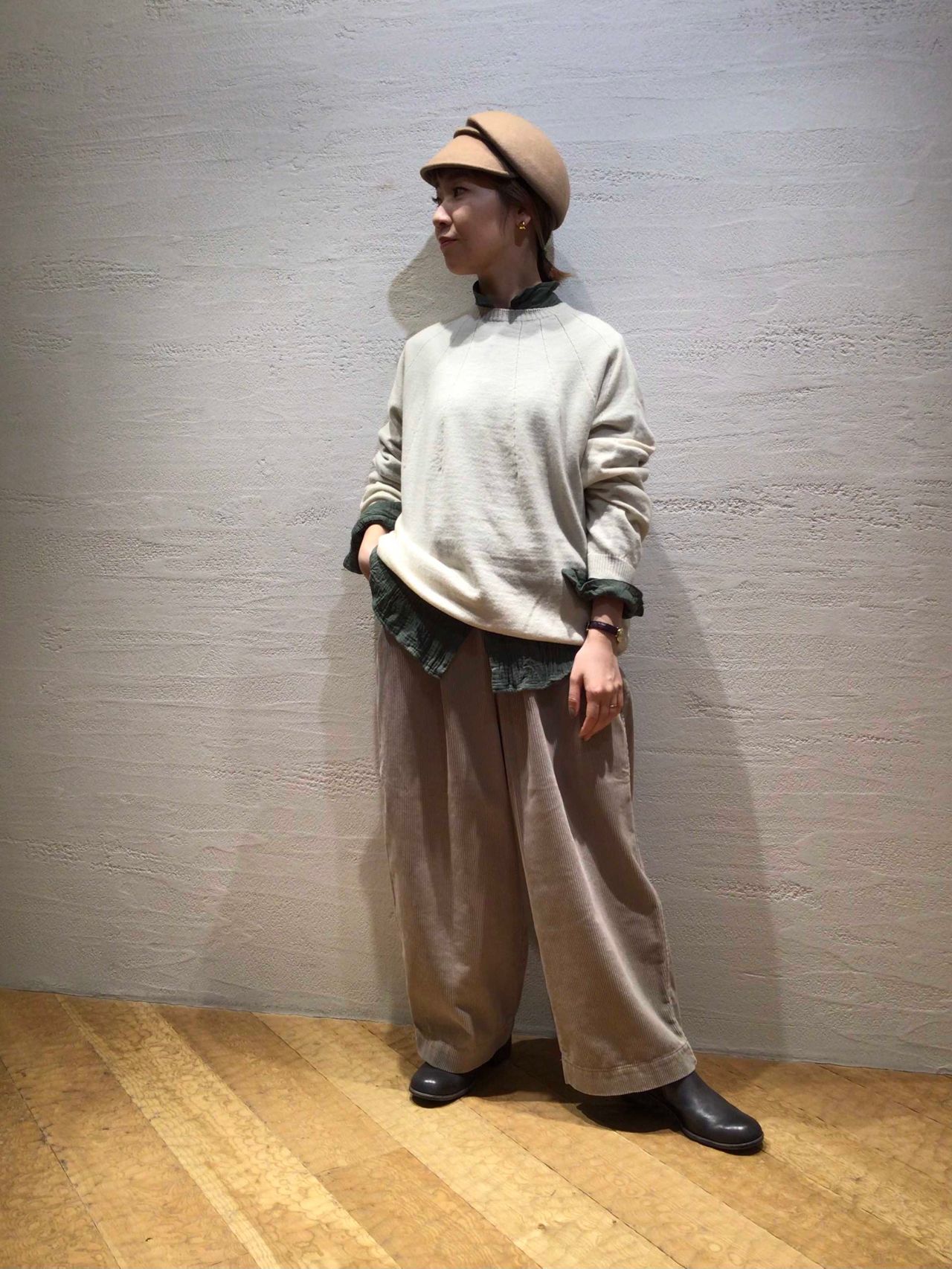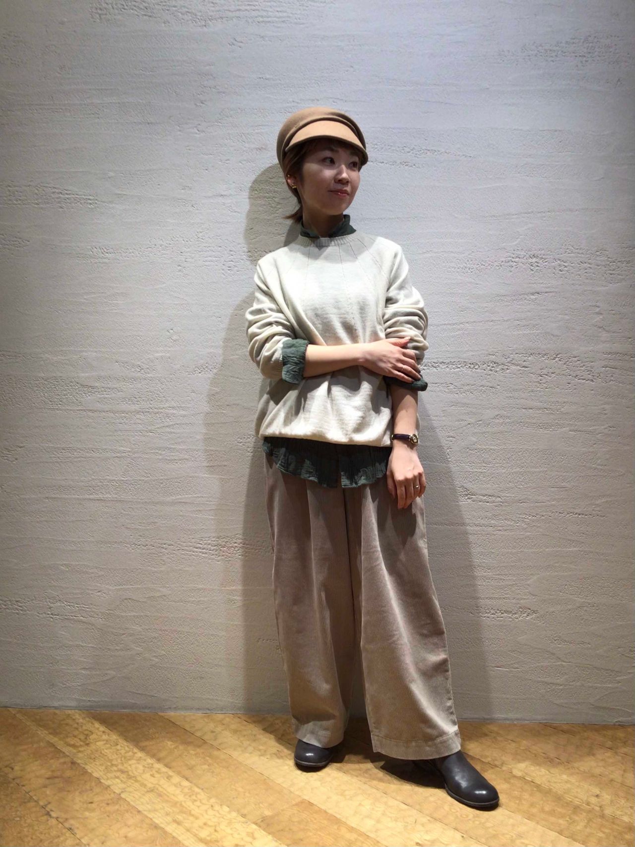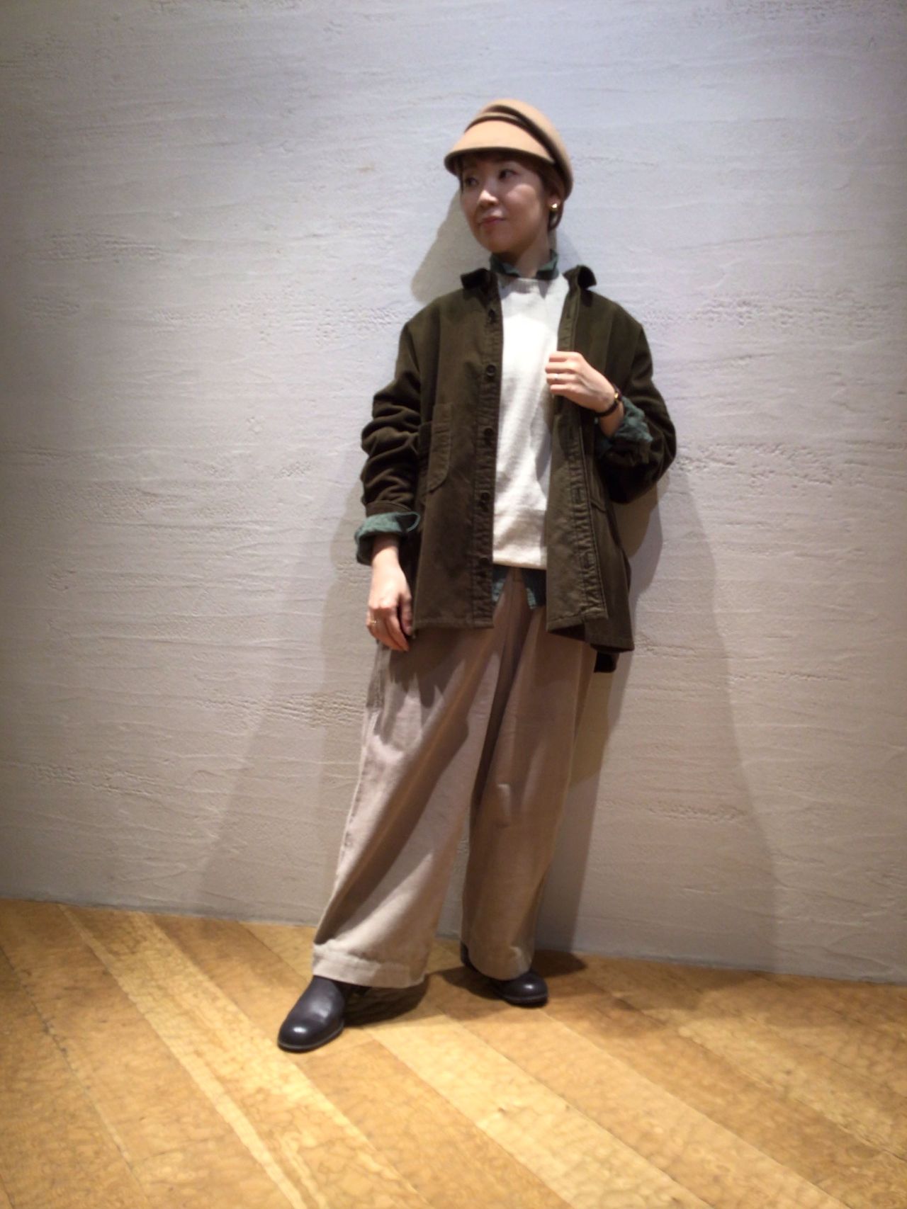 同系色のセットアップももちろん素敵ですが、今回ご紹介する「アメリカ海軍モチーフ コーディロイCPOジャケット」は、アイボリーと優しいベージュの色合いで女性らしいカジュアルスタイリングにしてみました。