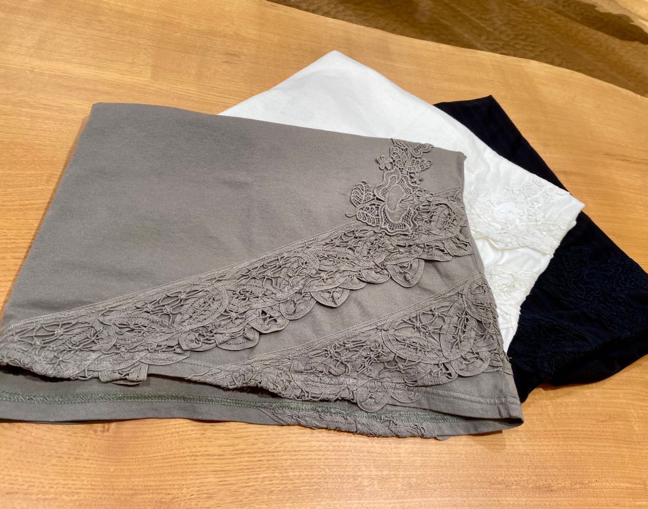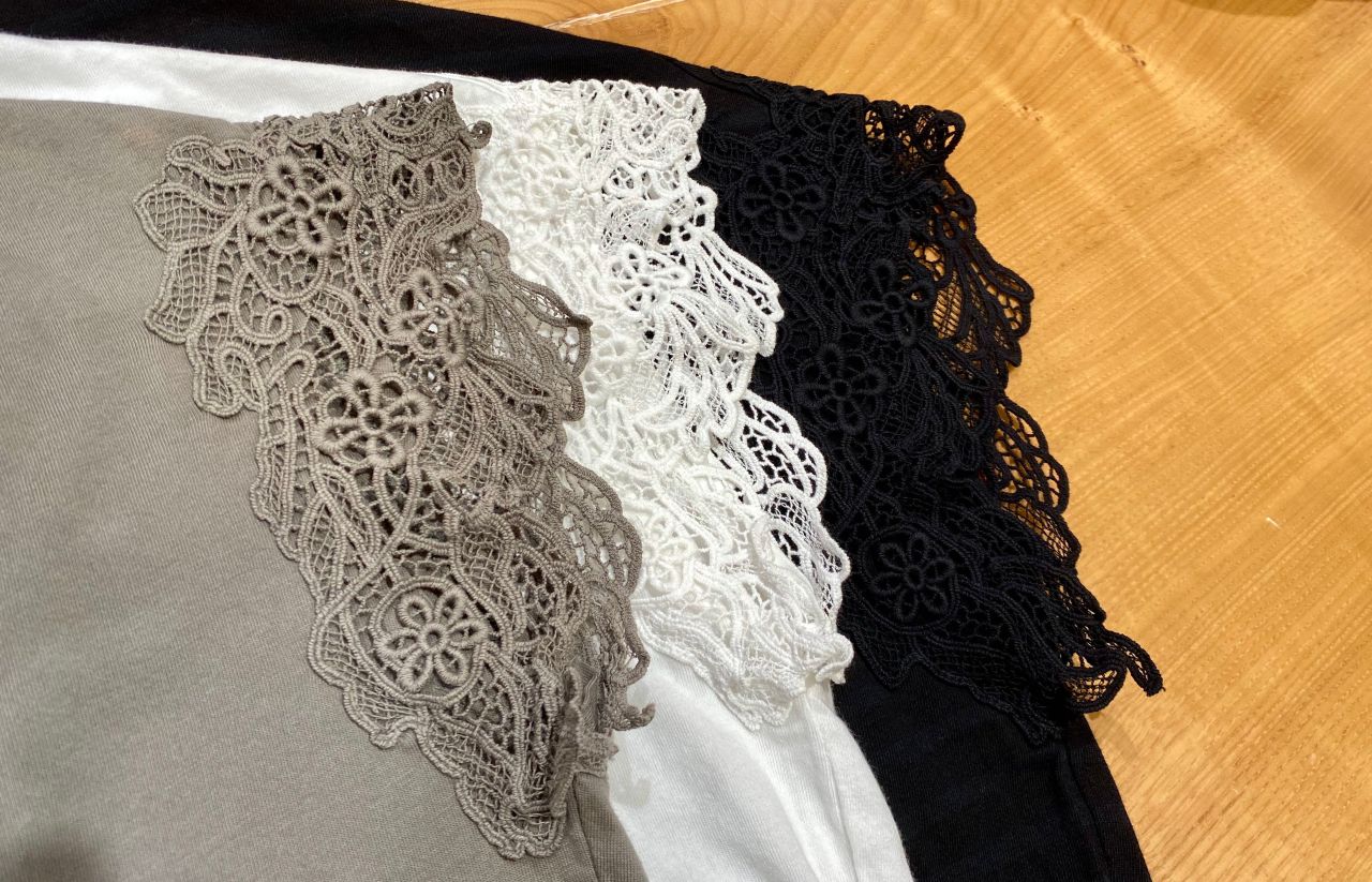 バテンレースとケミカルレースがイレギュラーに裾脇についています。